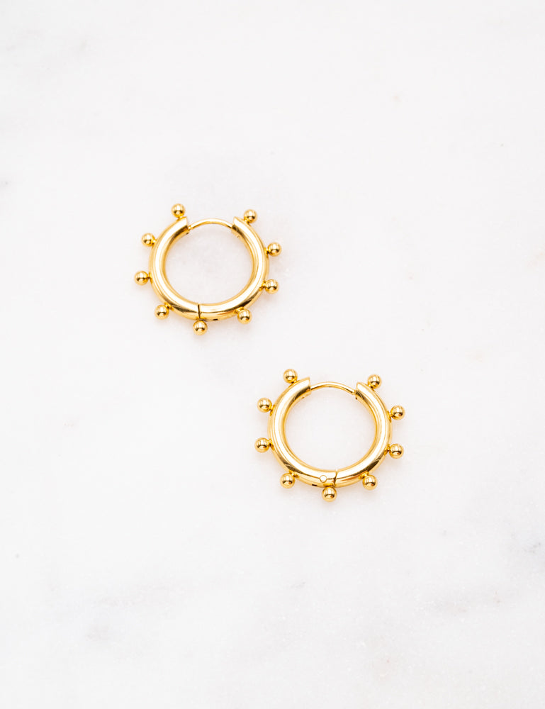 Boucles d'oreilles type créoles à fermoir charnière embellies de 9 petites boules.
