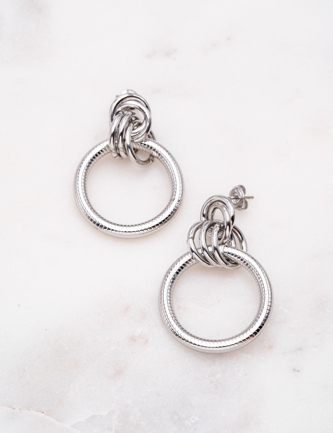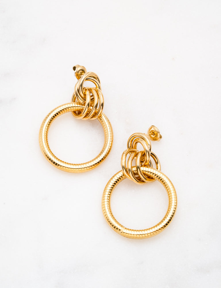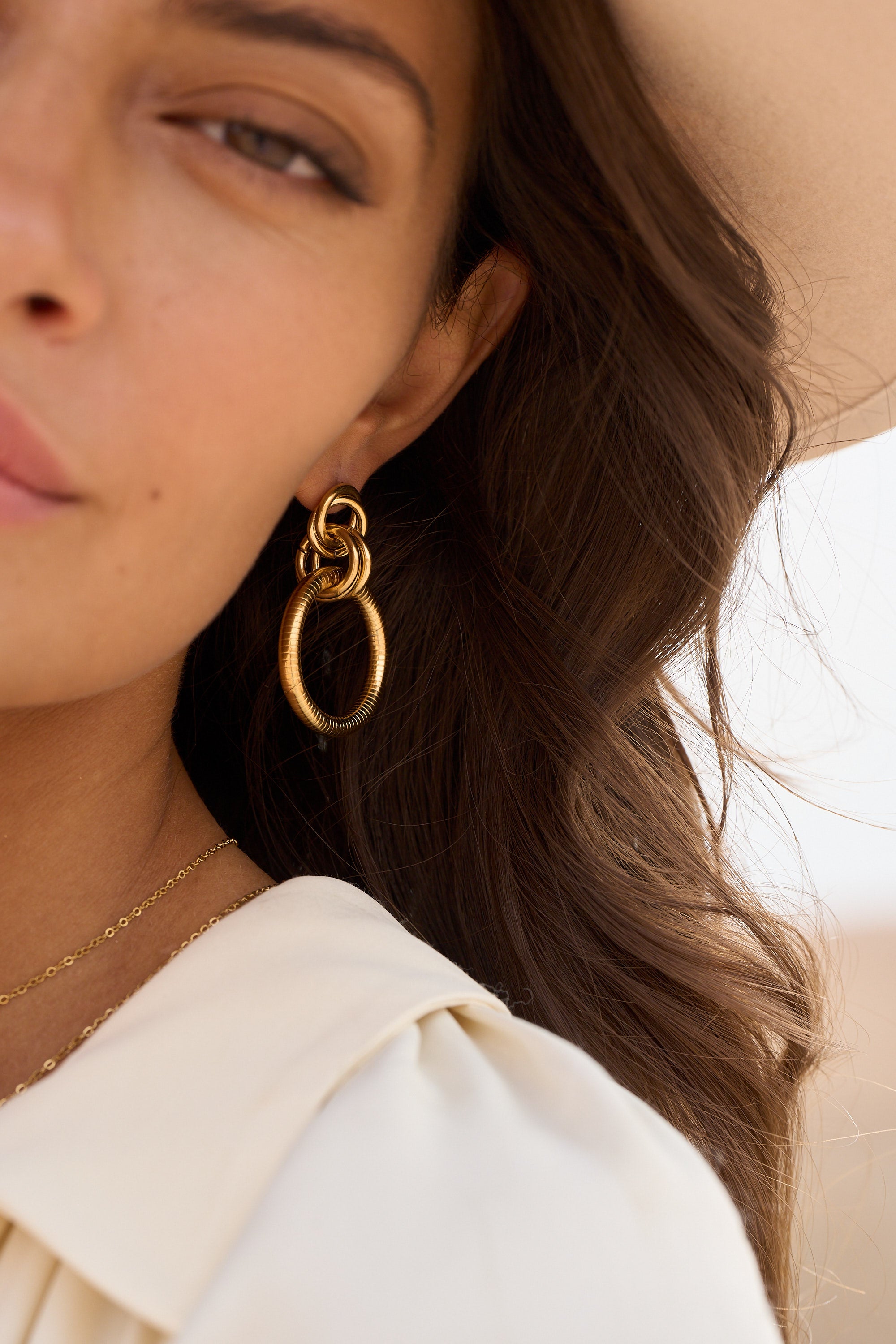 Boucles d'oreilles graphiques à puce composées de petits anneaux lisses et d'un anneau texturé. Fermoir papillon.
