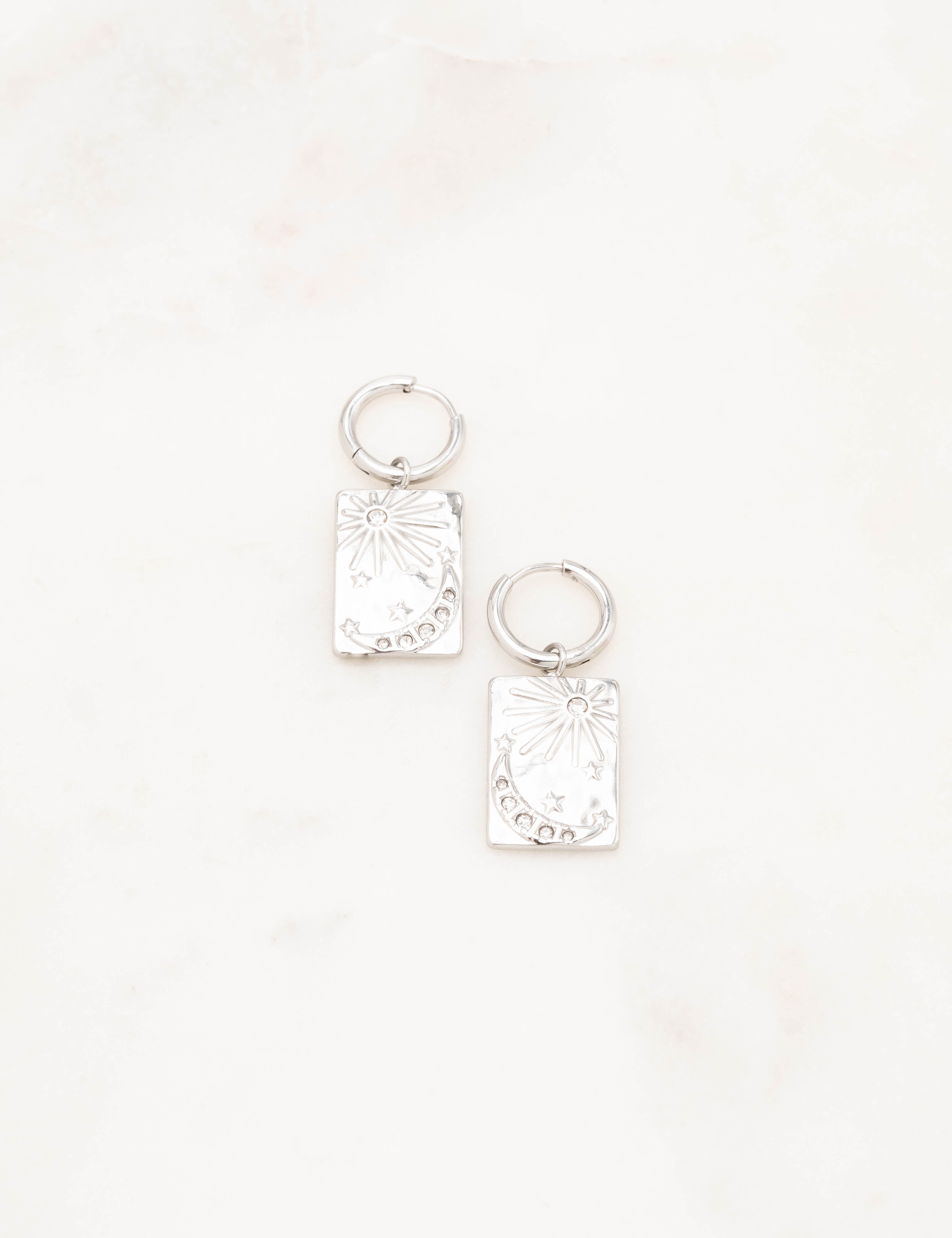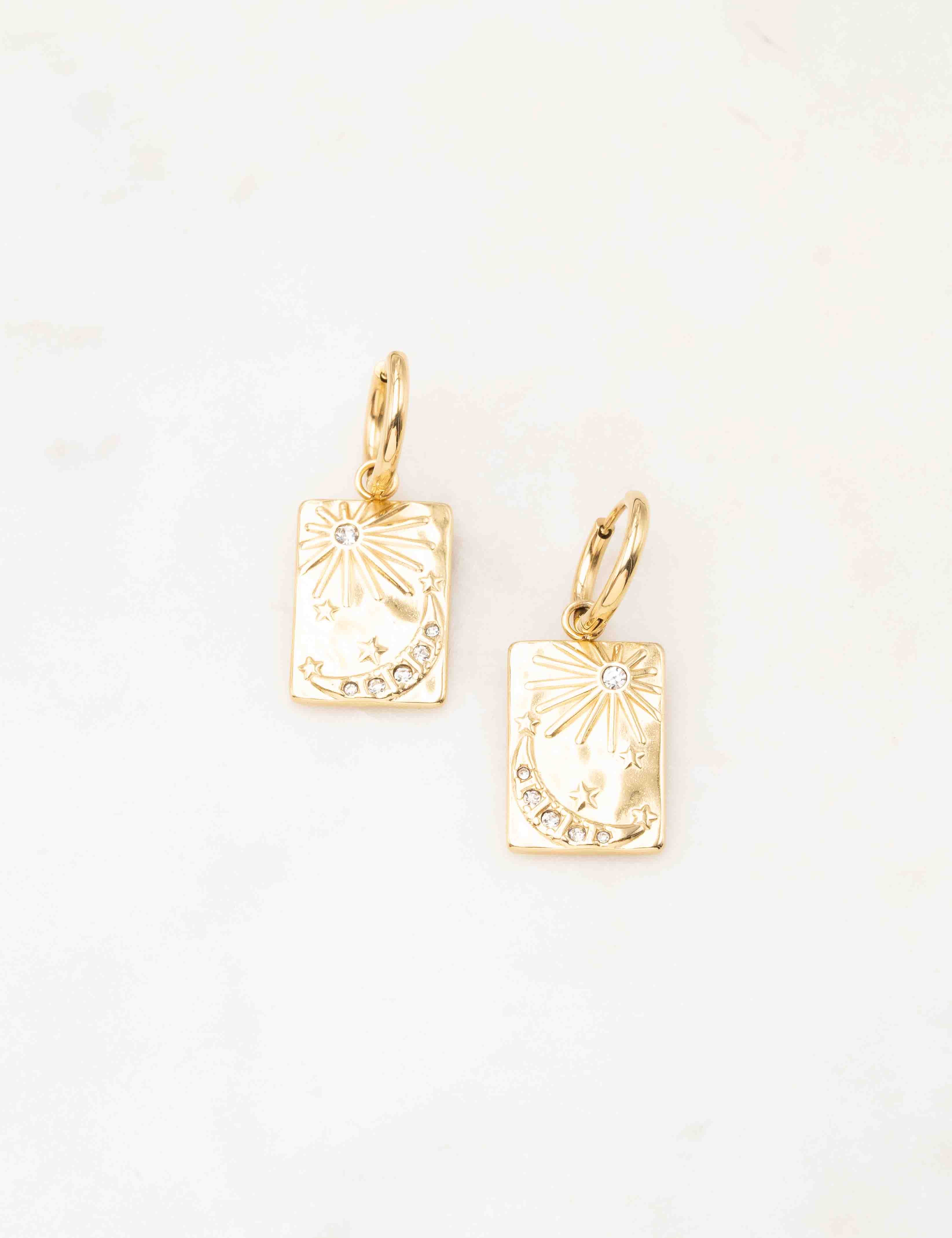 Boucles d'oreilles type créoles composées d'une pièce au motif étoilé et lunaire sertis de strass. Fermoir charnière.