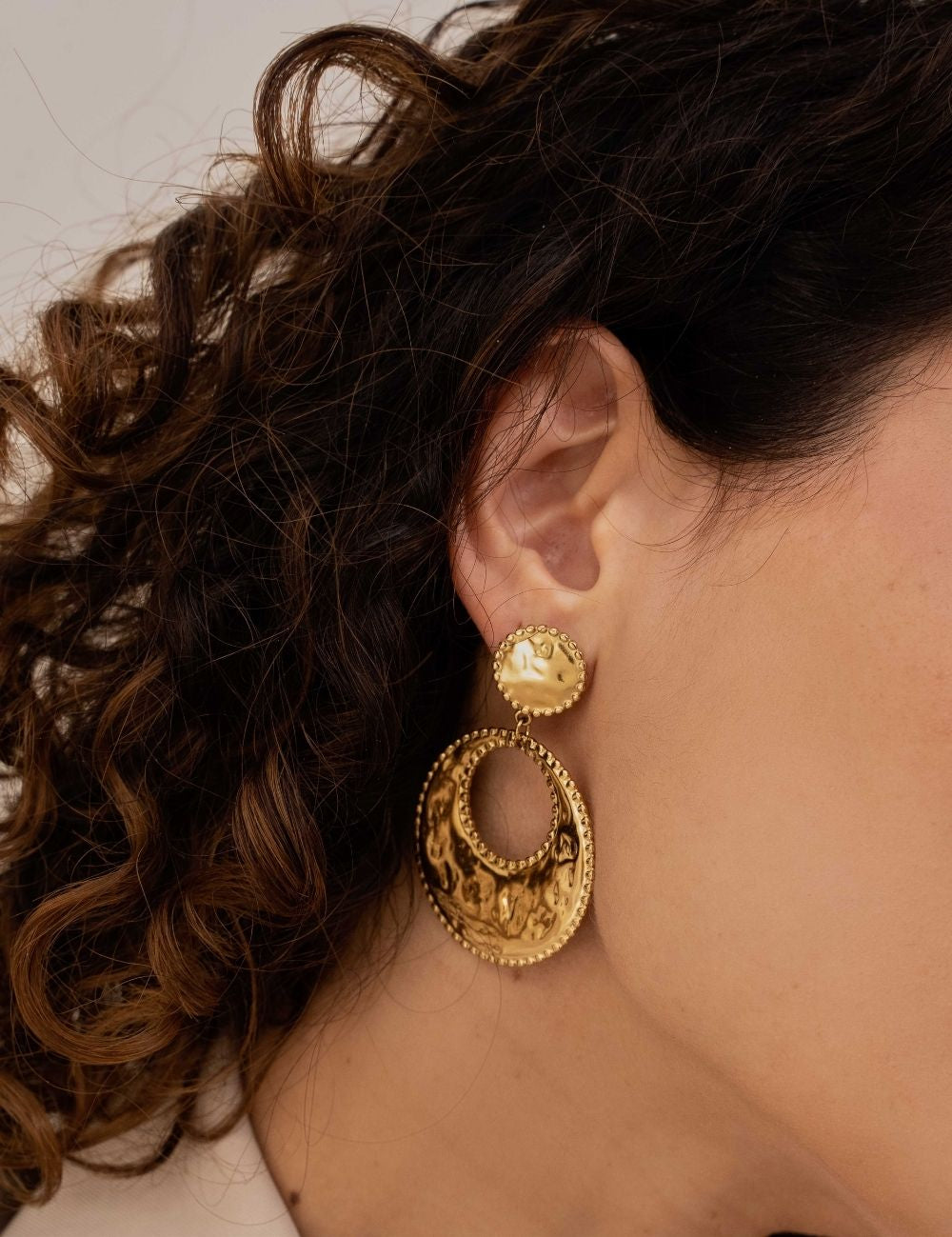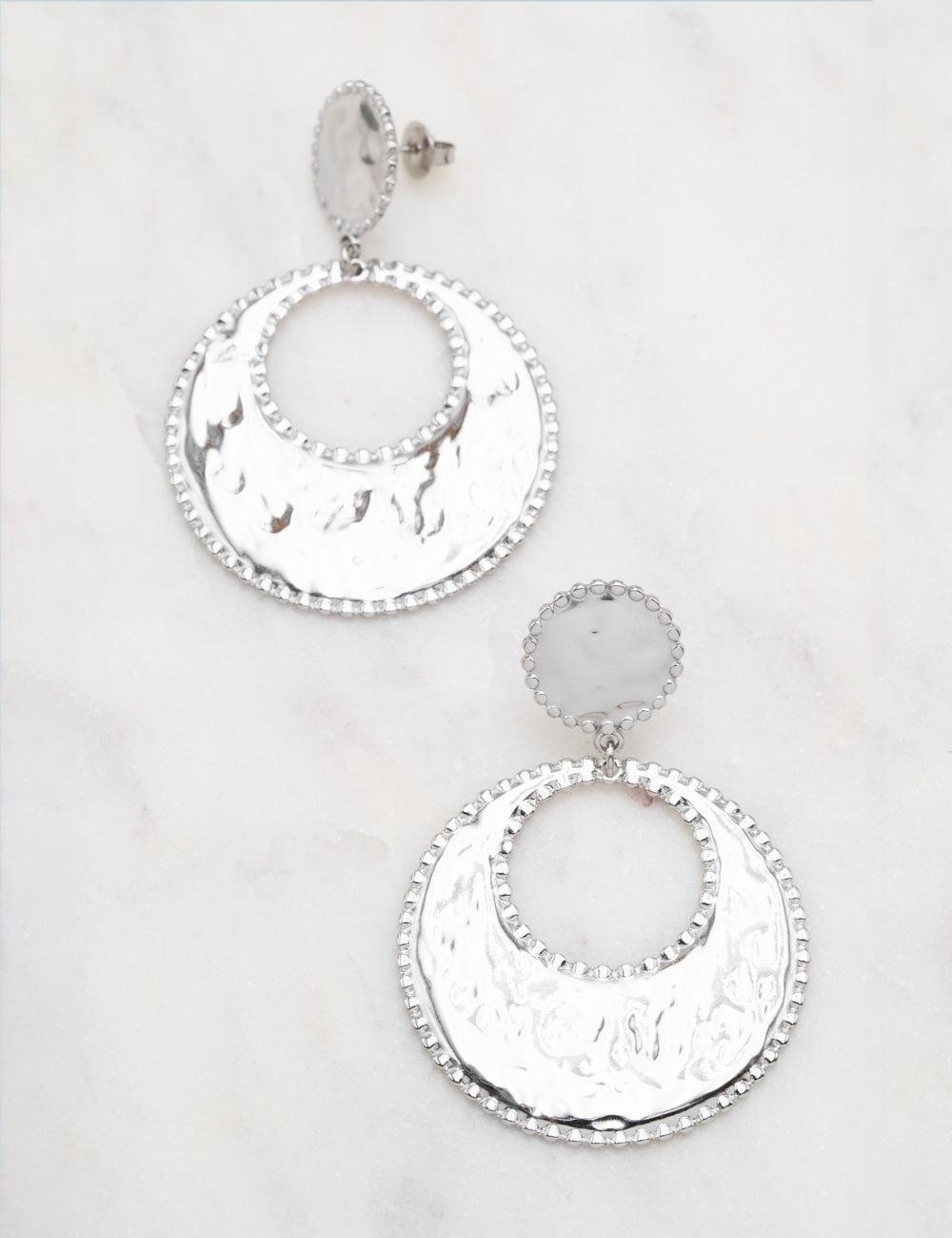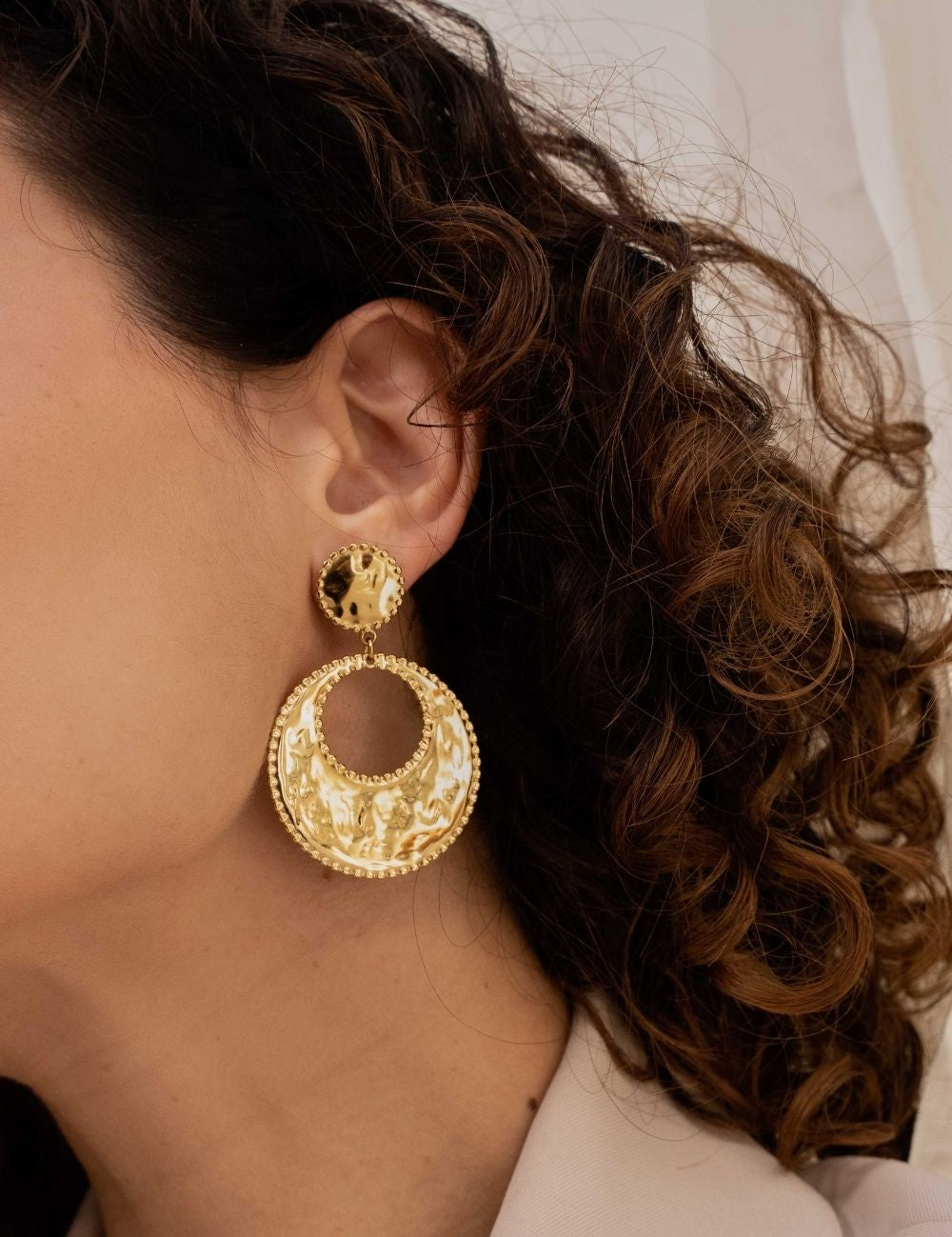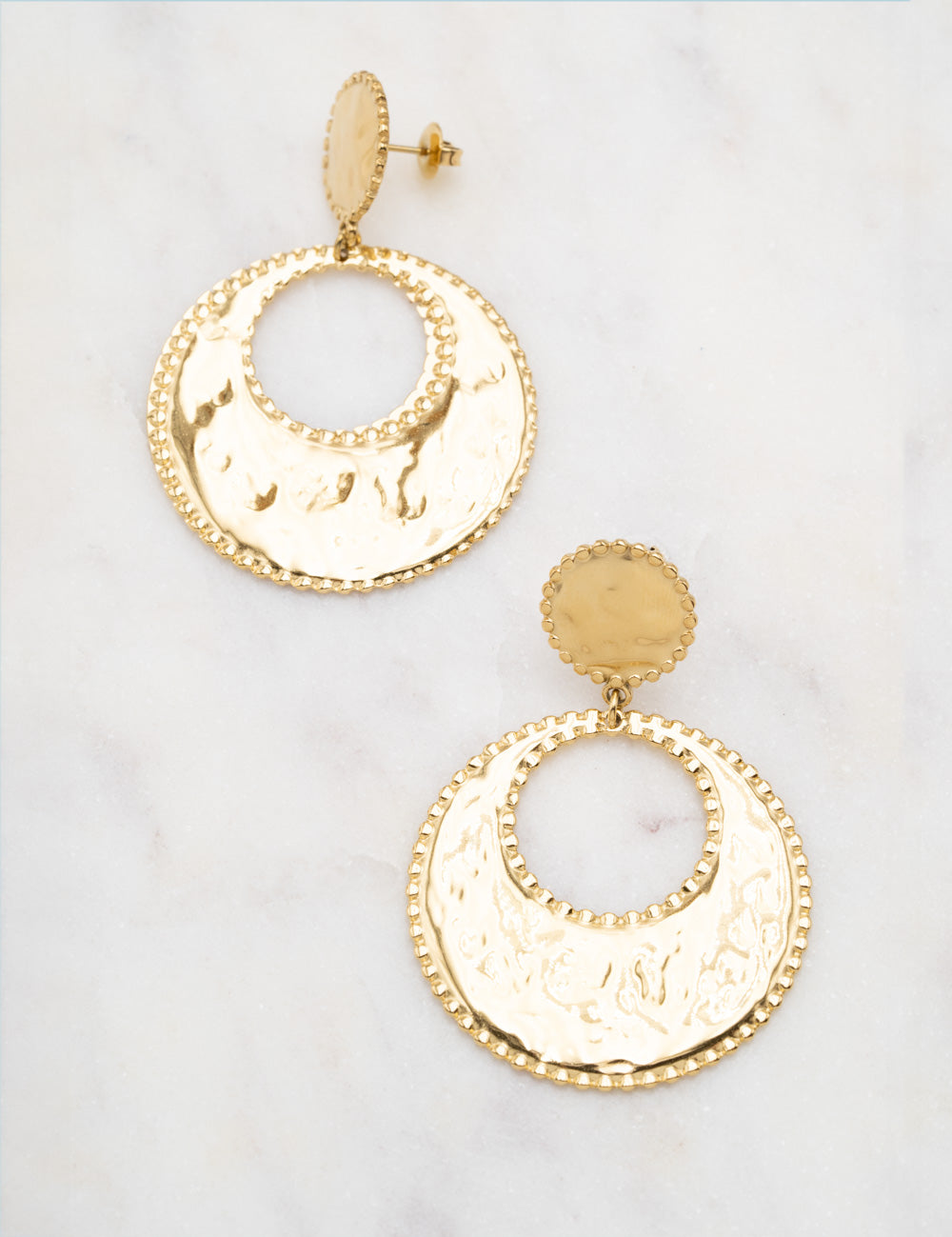 Boucles d'oreilles graphiques à puce composées d'un pendant rond texturé ajouré avec une finition effet canelé. Fermoir papillon.