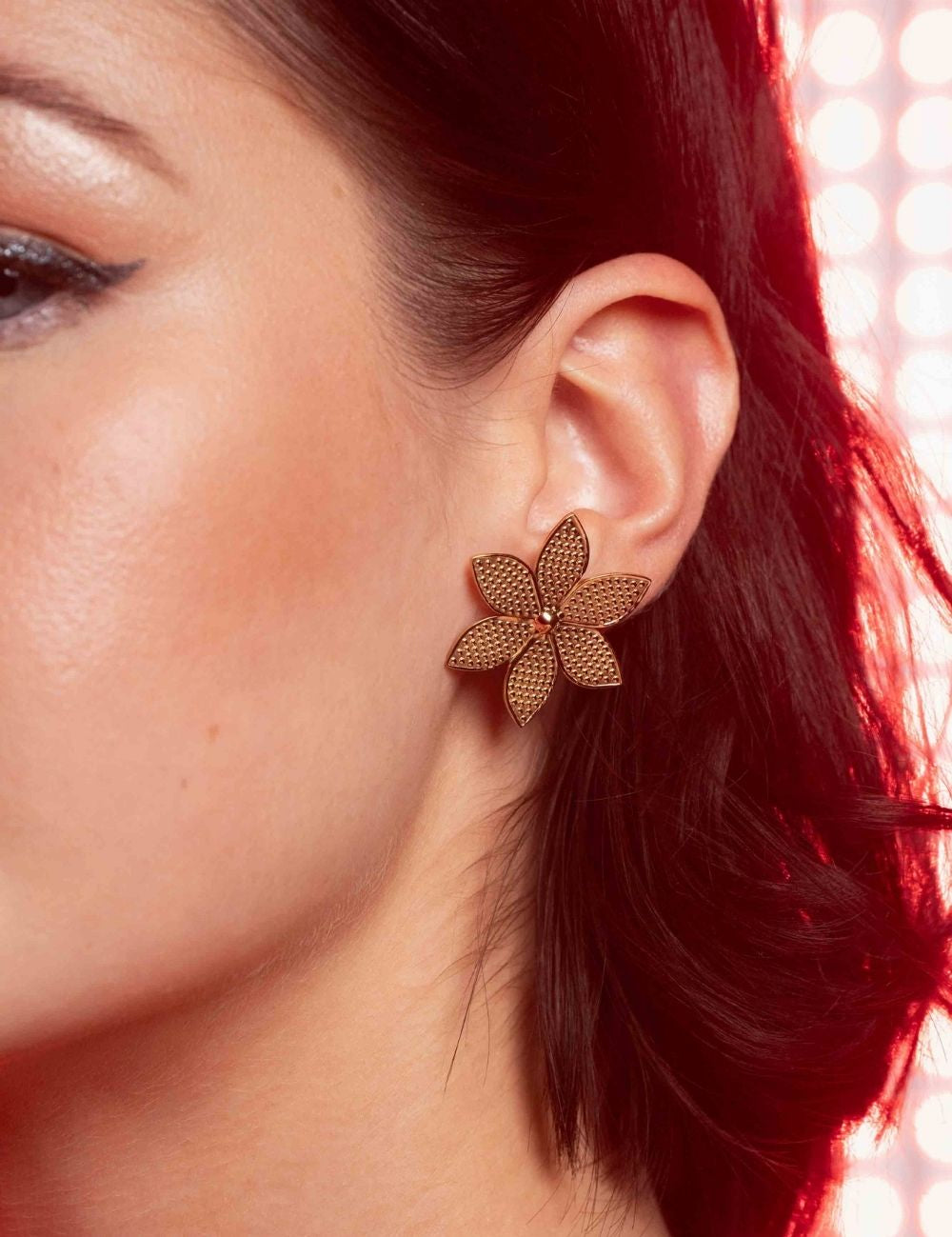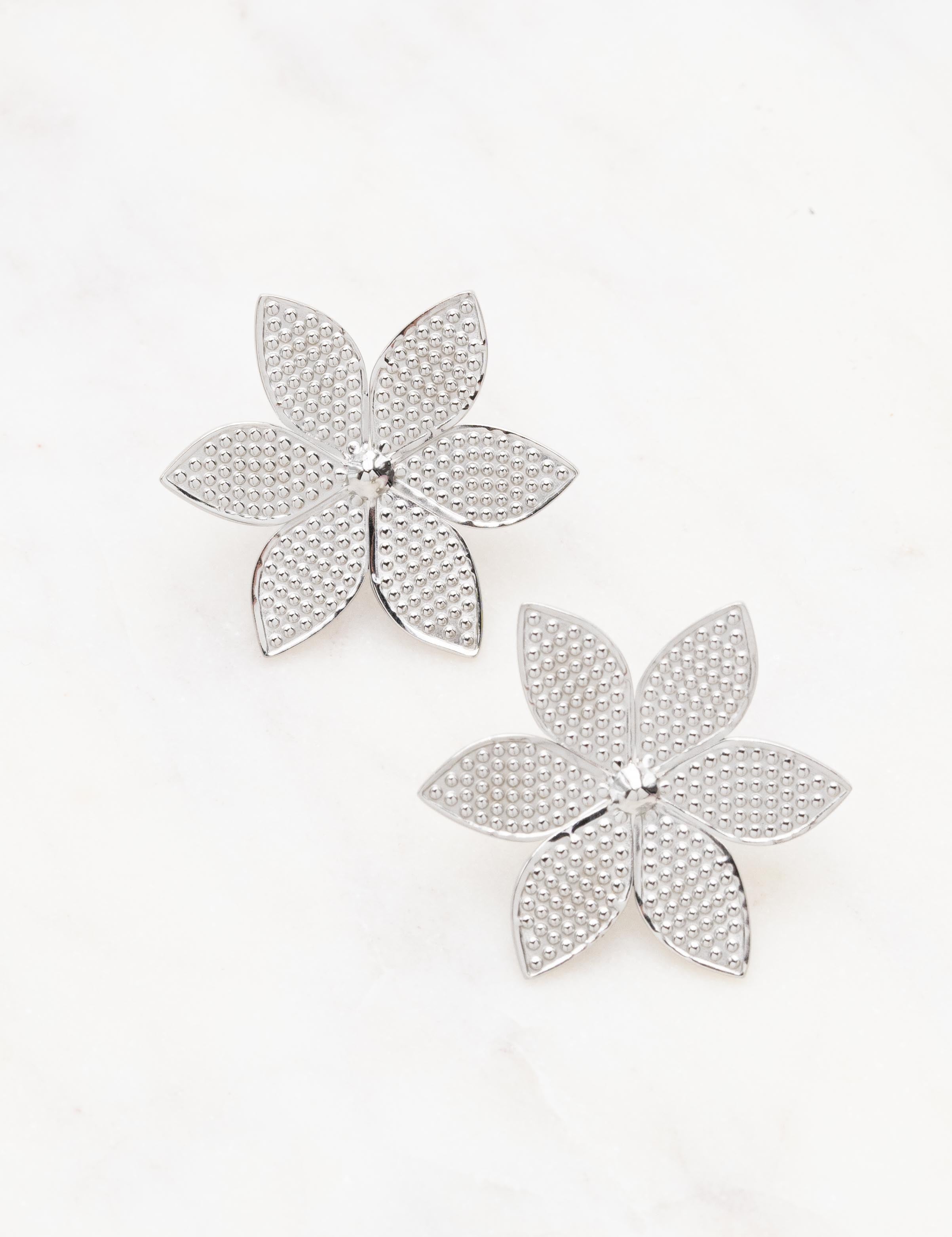 Boucles d'oreilles graphiques à puce formant une fleur texturée effet pointillé.