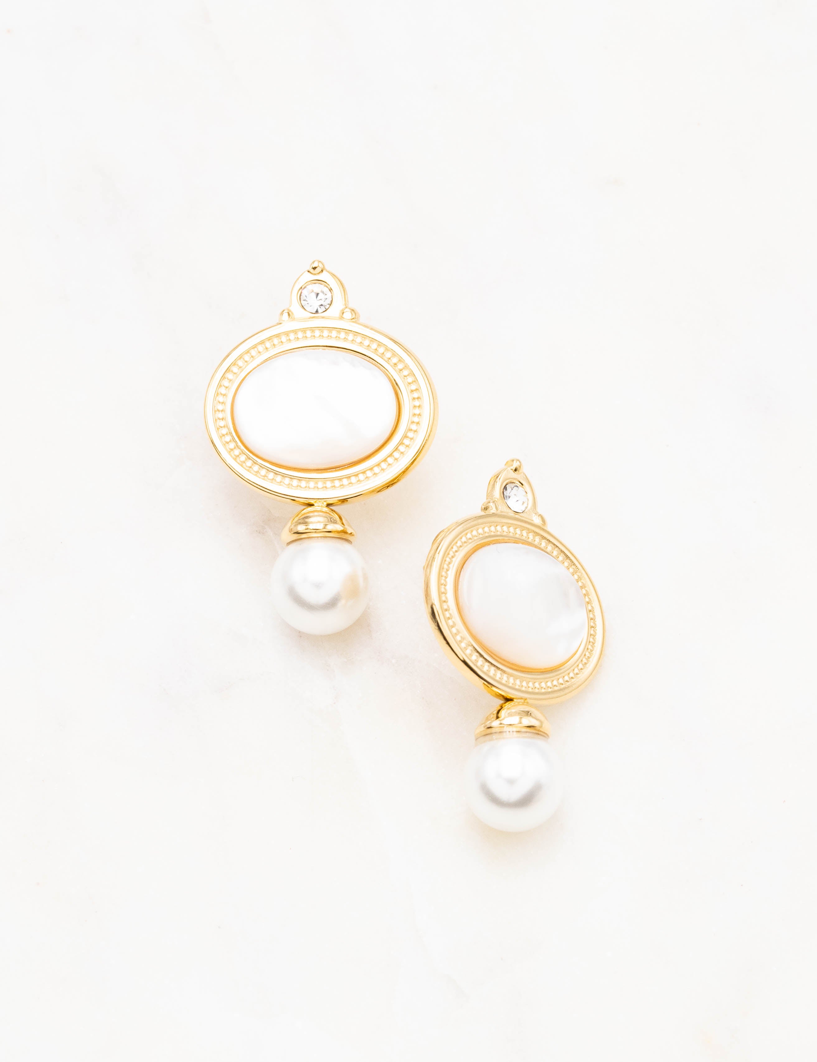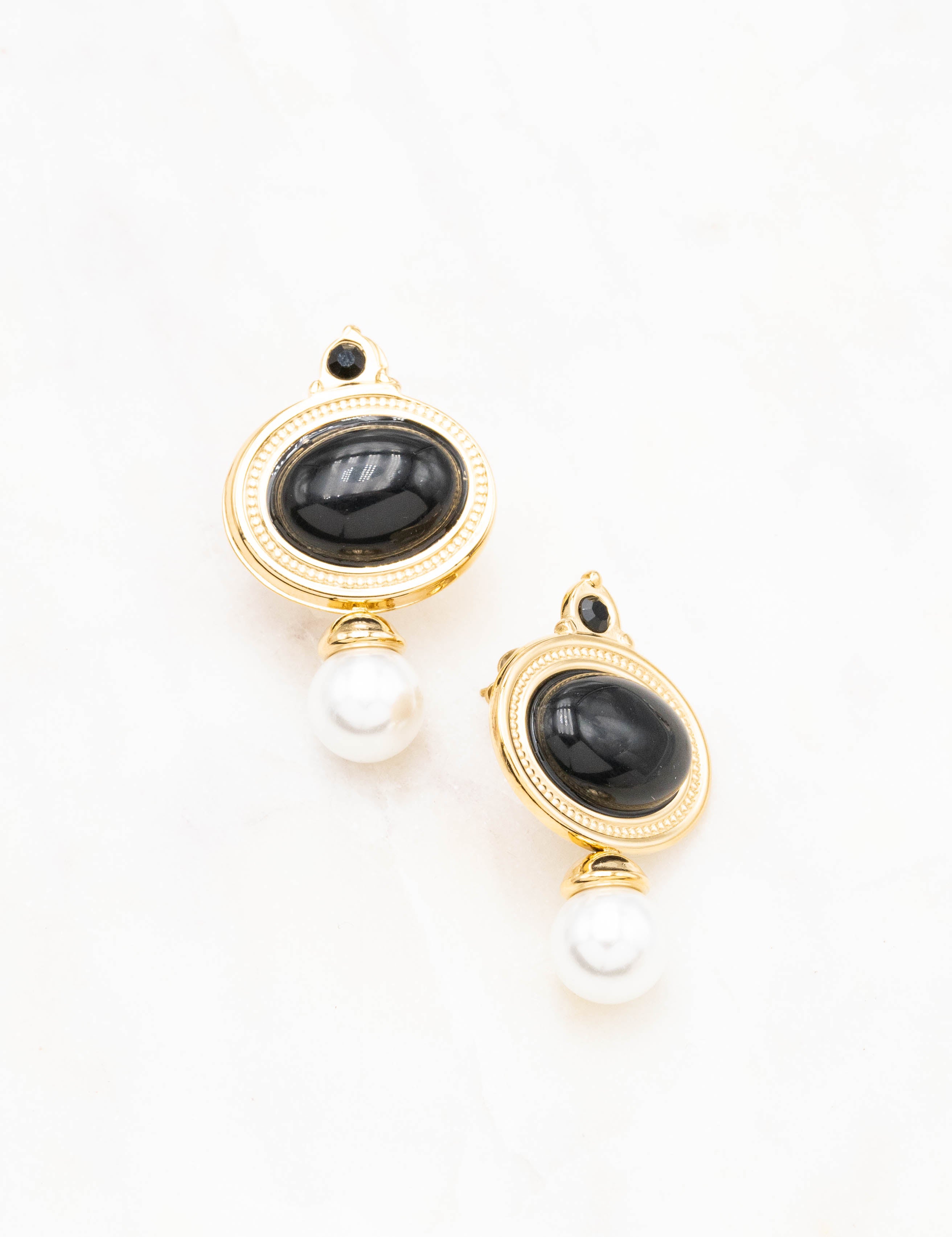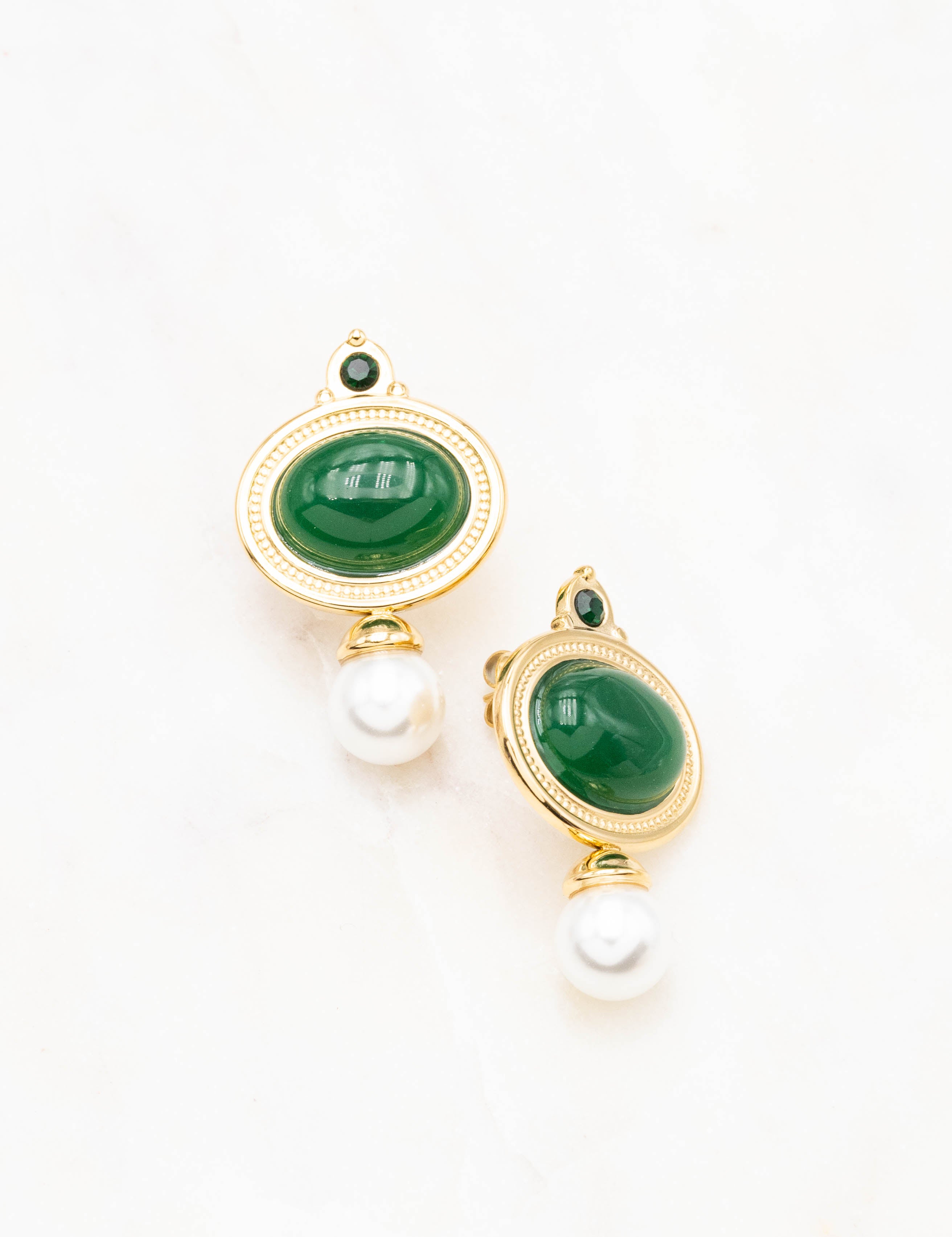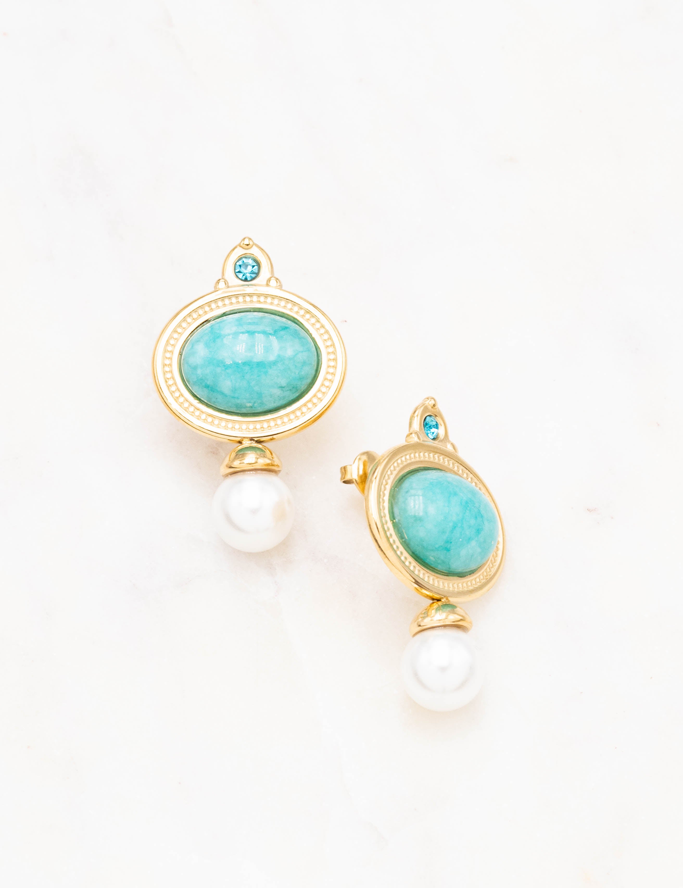 Boucles d'oreilles graphiques à puce composées d'une pièce ovale ornée d'une pierre naturelle, d'un strass et d'une perle en verre nacrée.