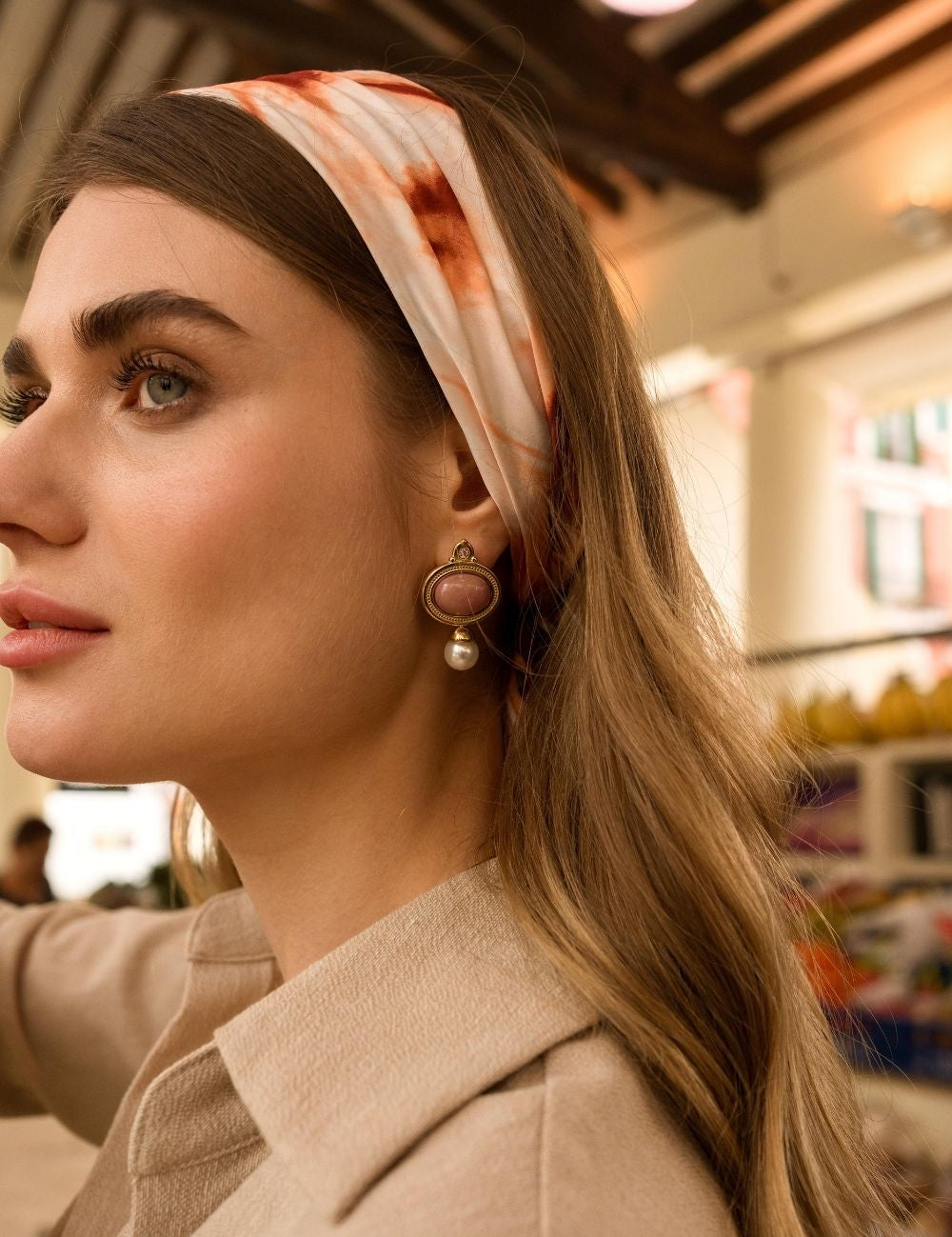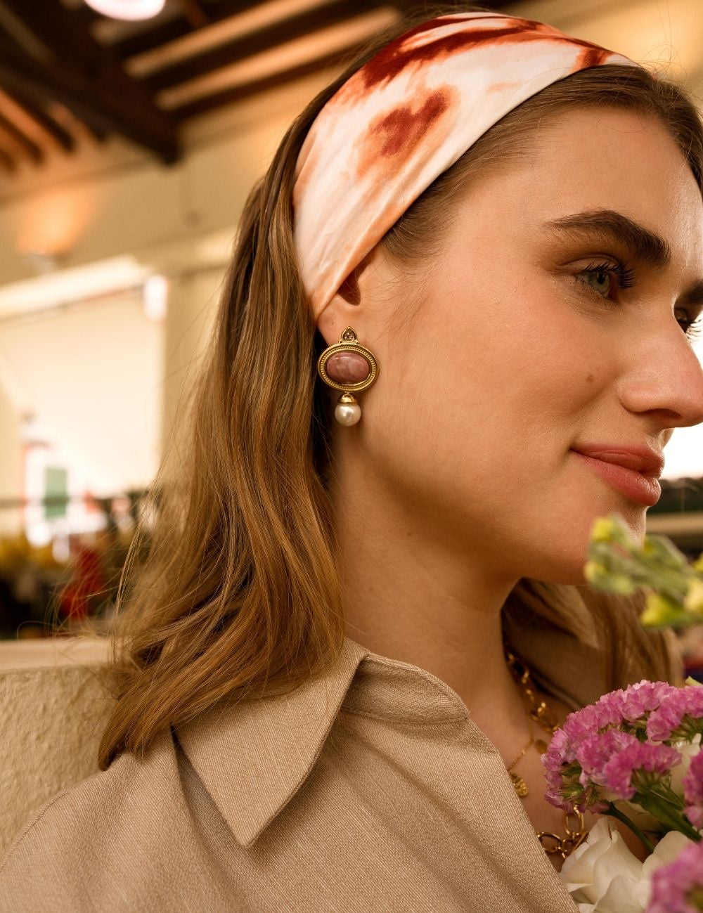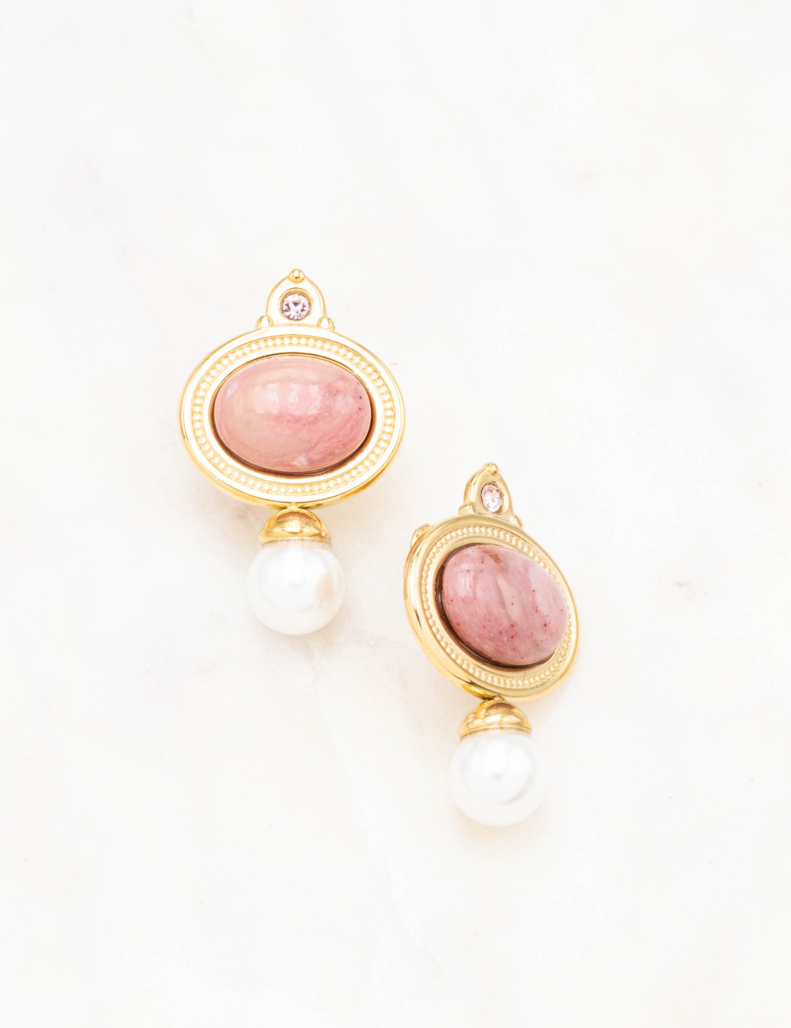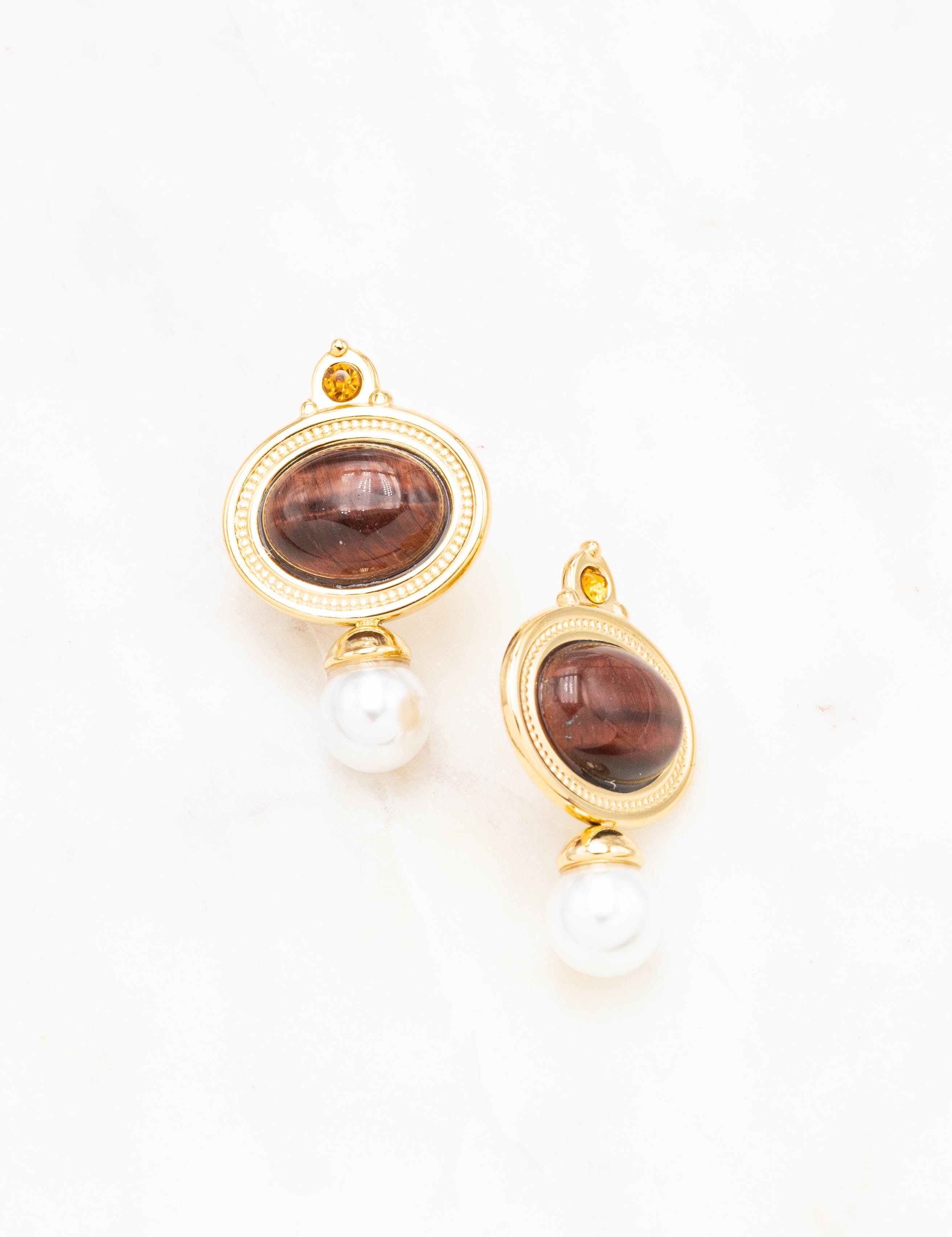 Boucles d'oreilles graphiques à puce composées d'une pièce ovale ornée d'une pierre naturelle, d'un strass et d'une perle en verre nacrée.