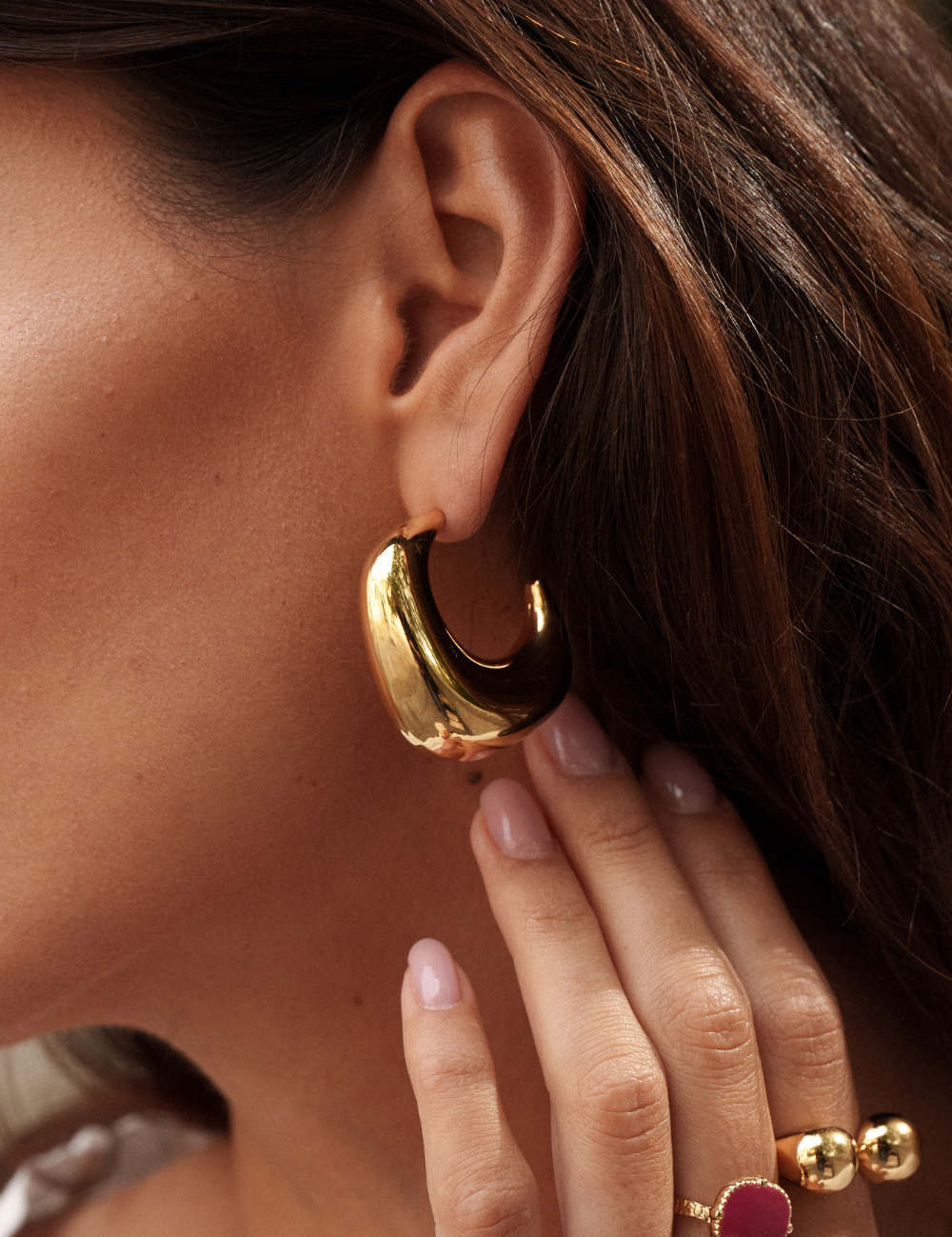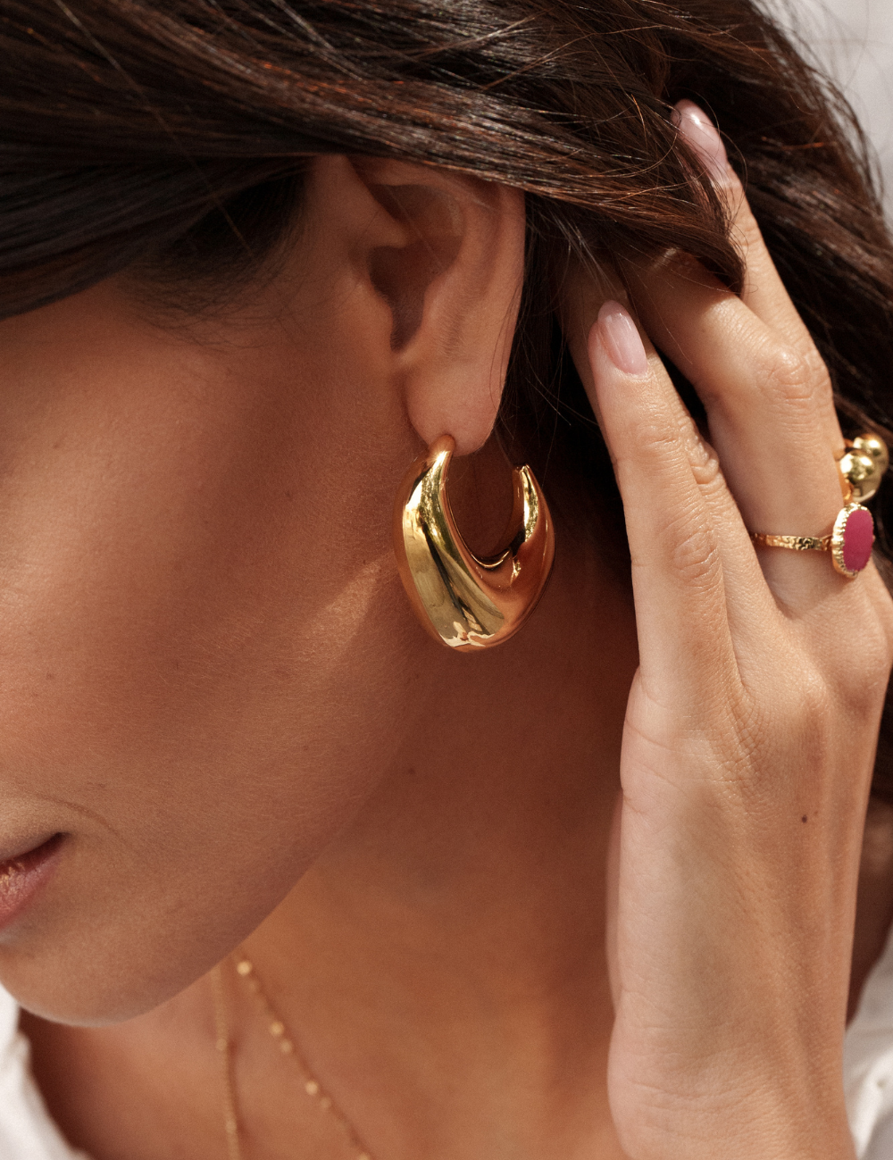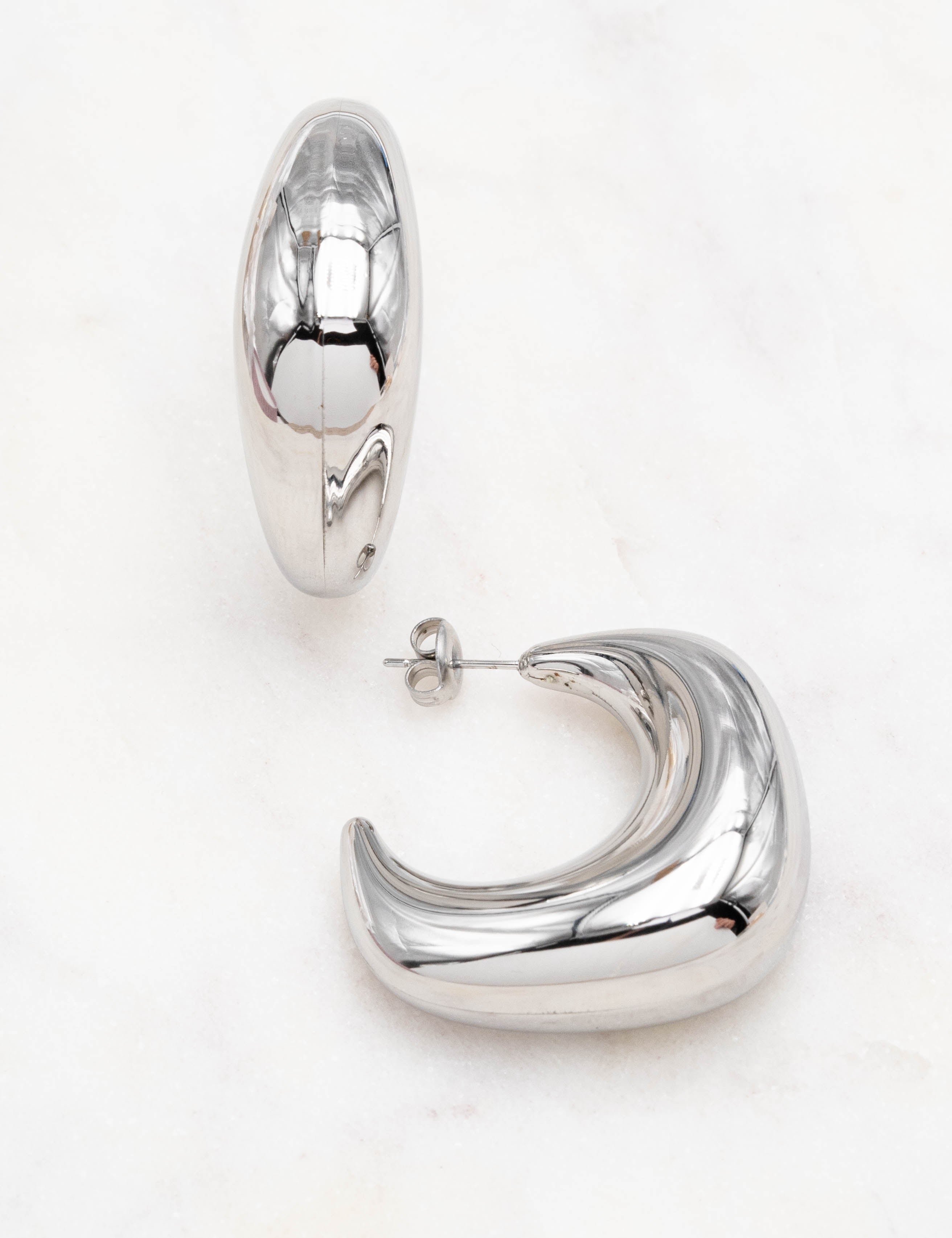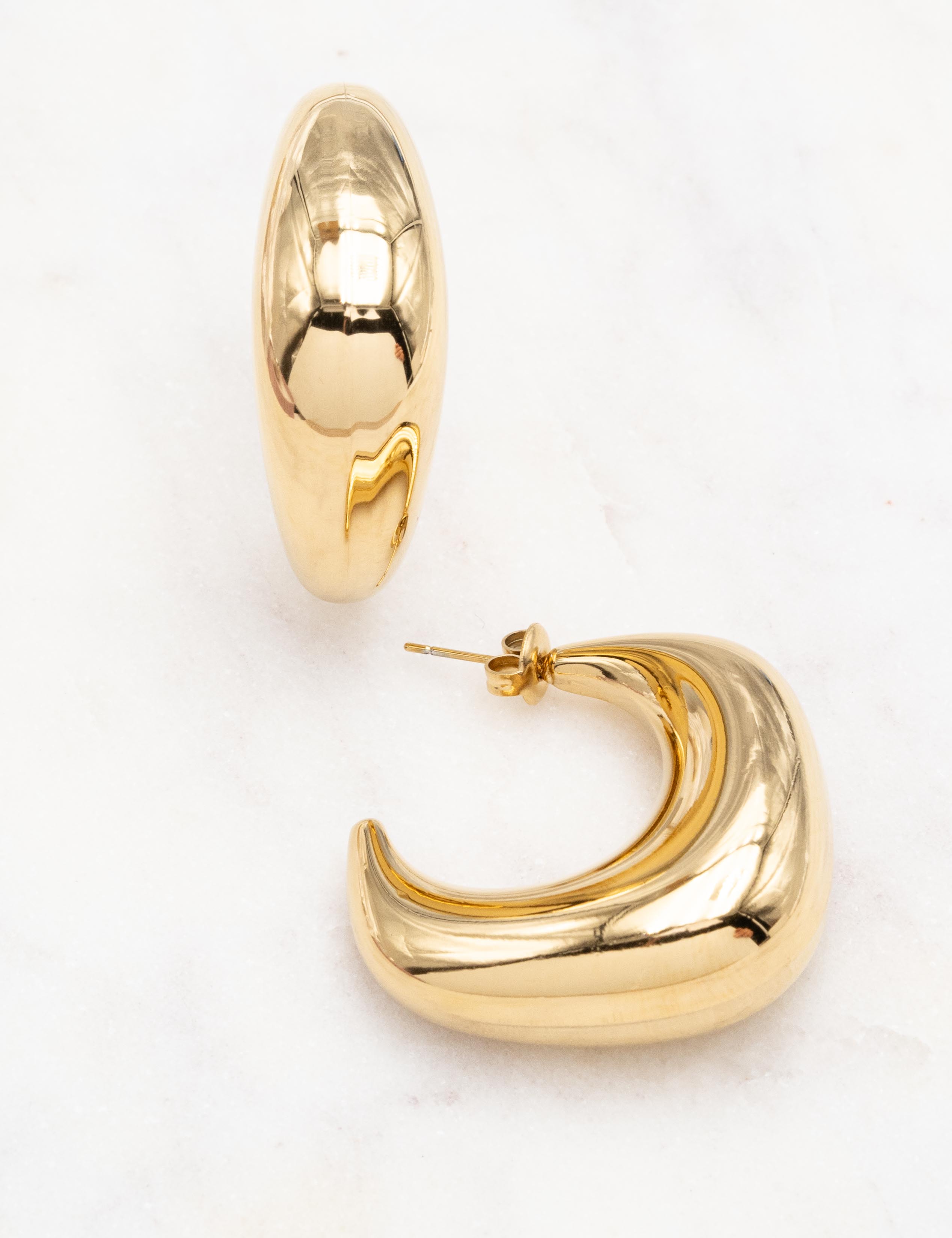 Boucles d'oreilles graphiques type créoles à puce de forme géométrique avec un effet bombé.