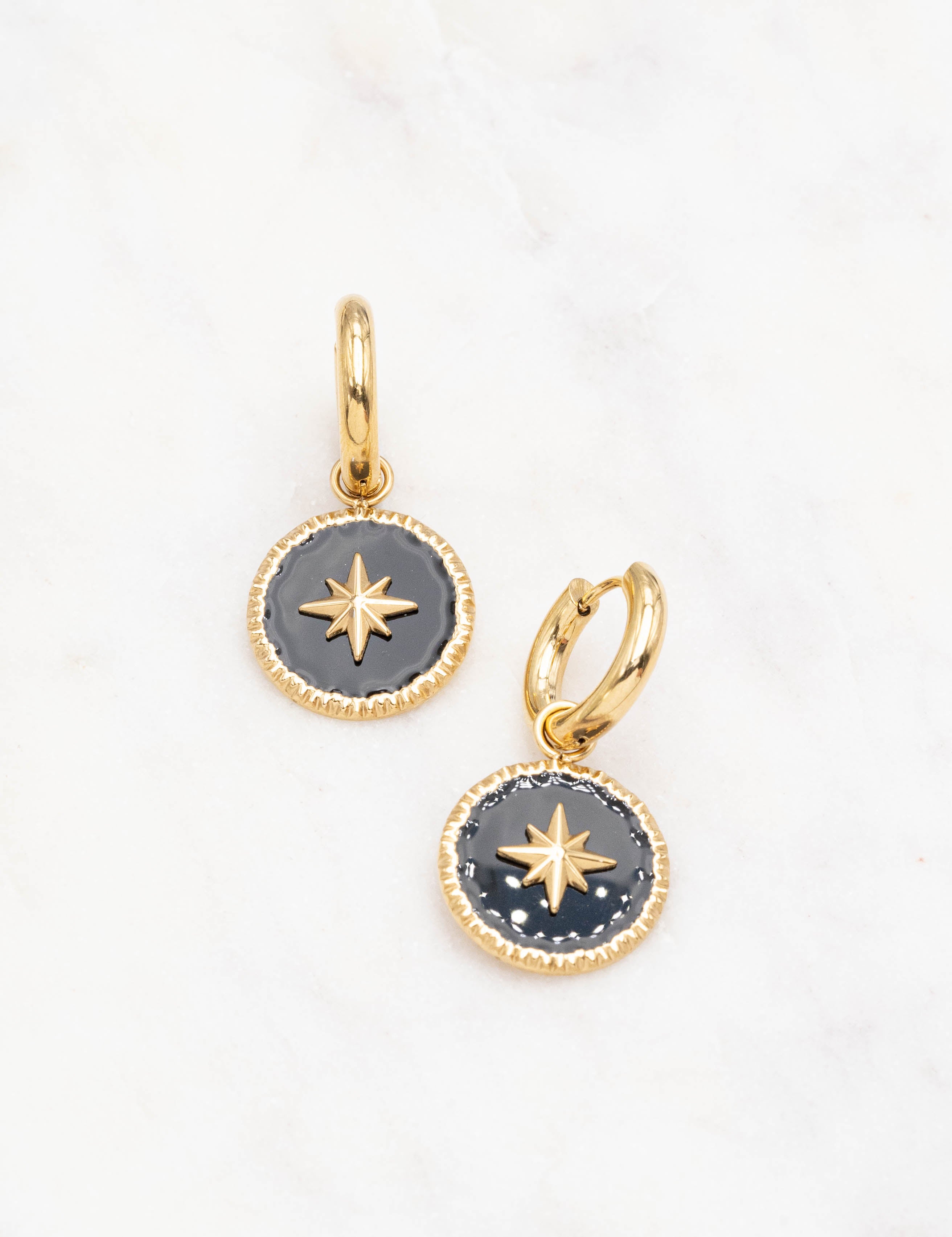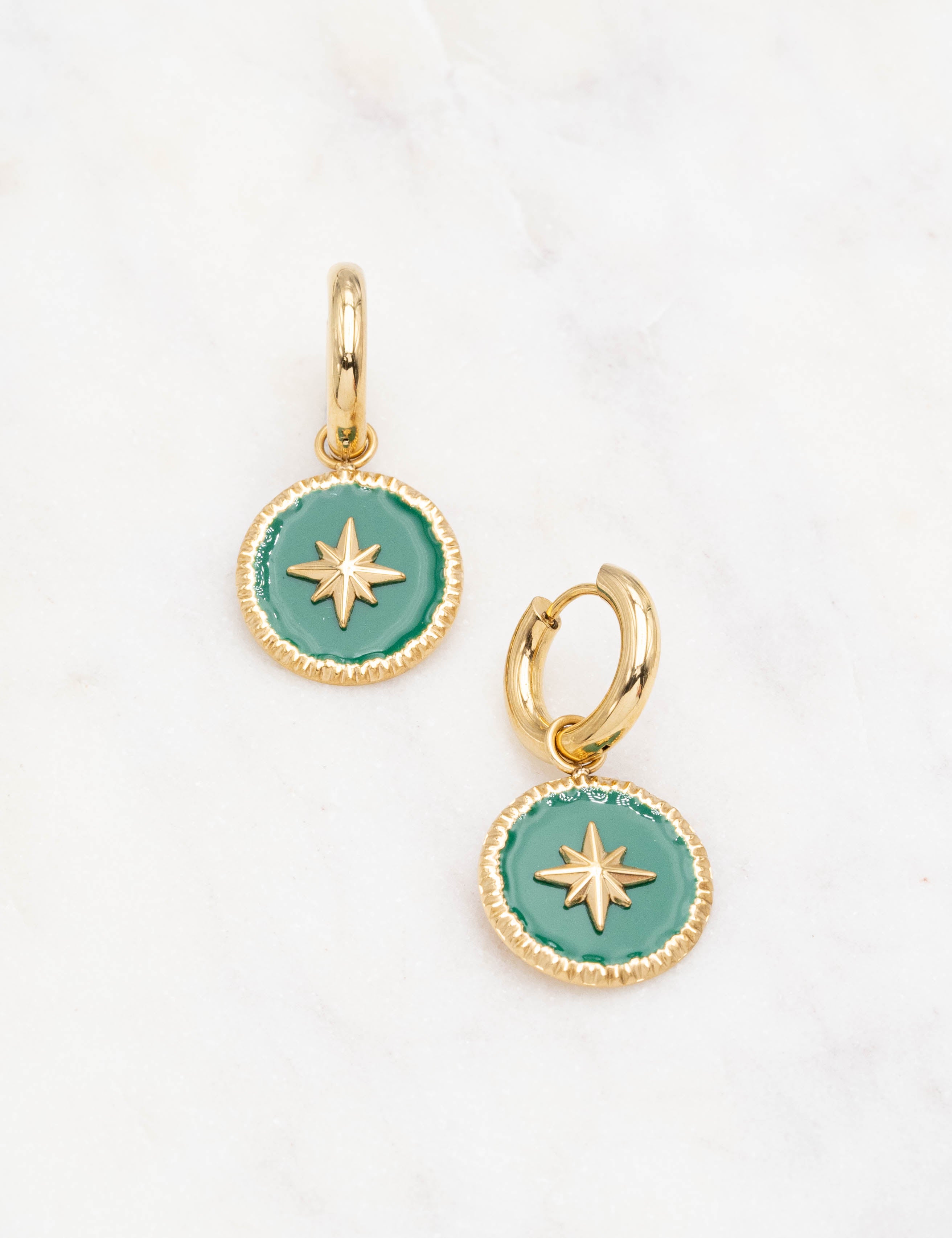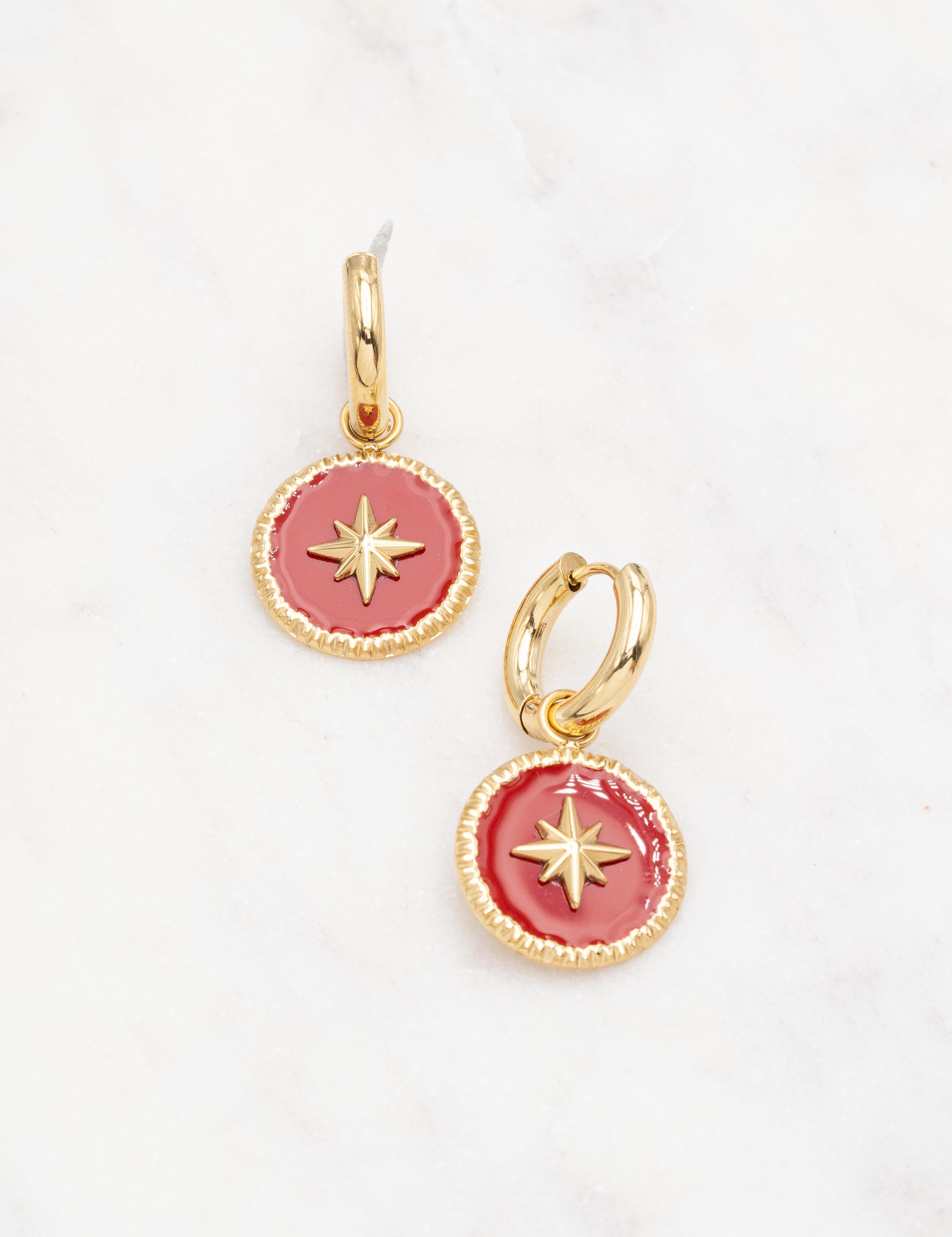 Boucles d'oreilles type créoles composées d'un pendant rond émaillé coloré orné d'une étoile.