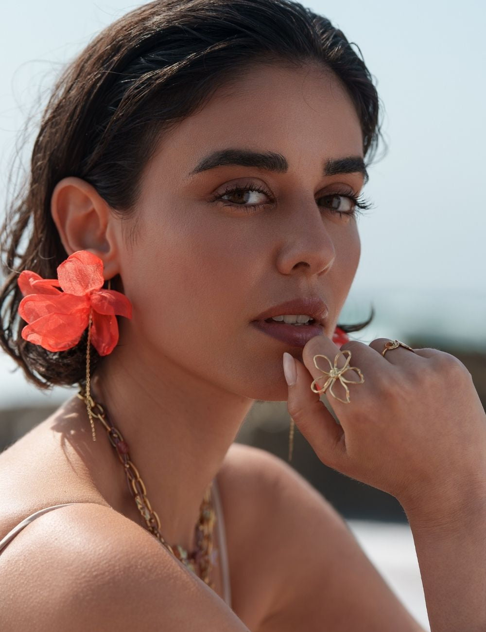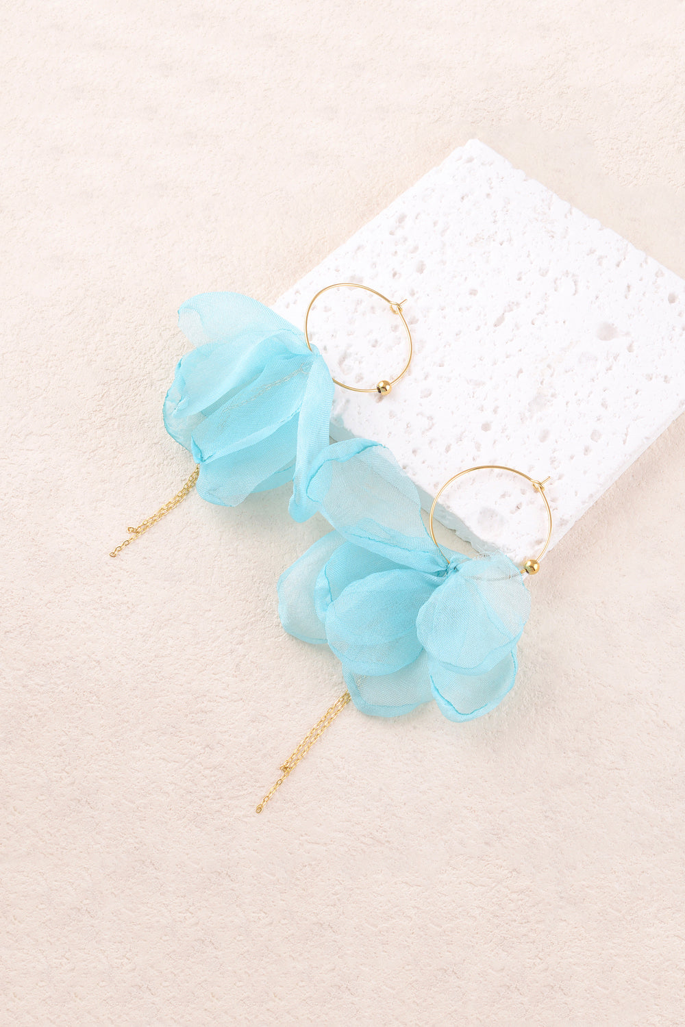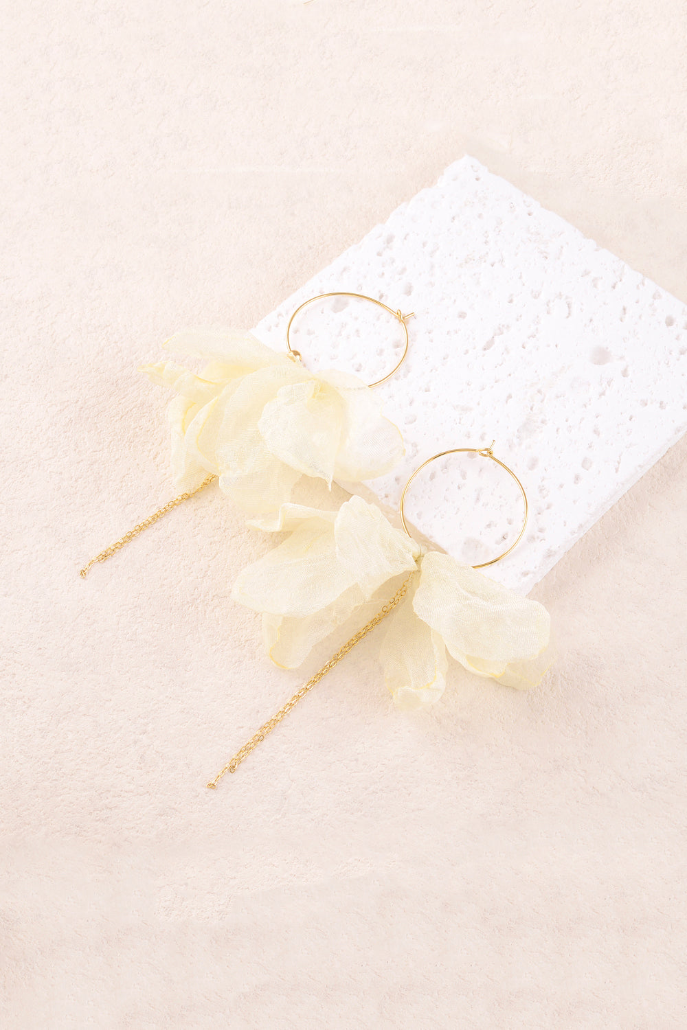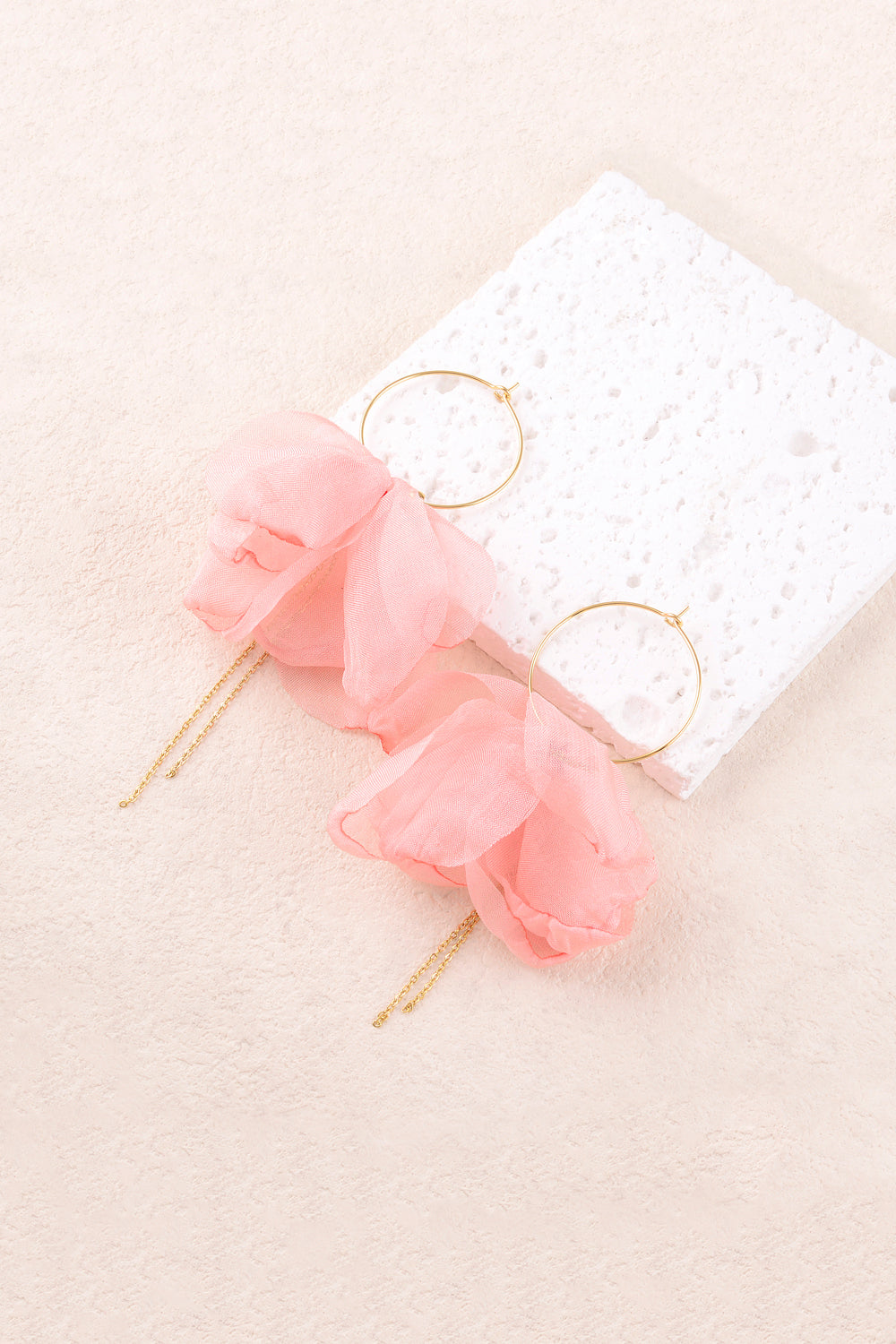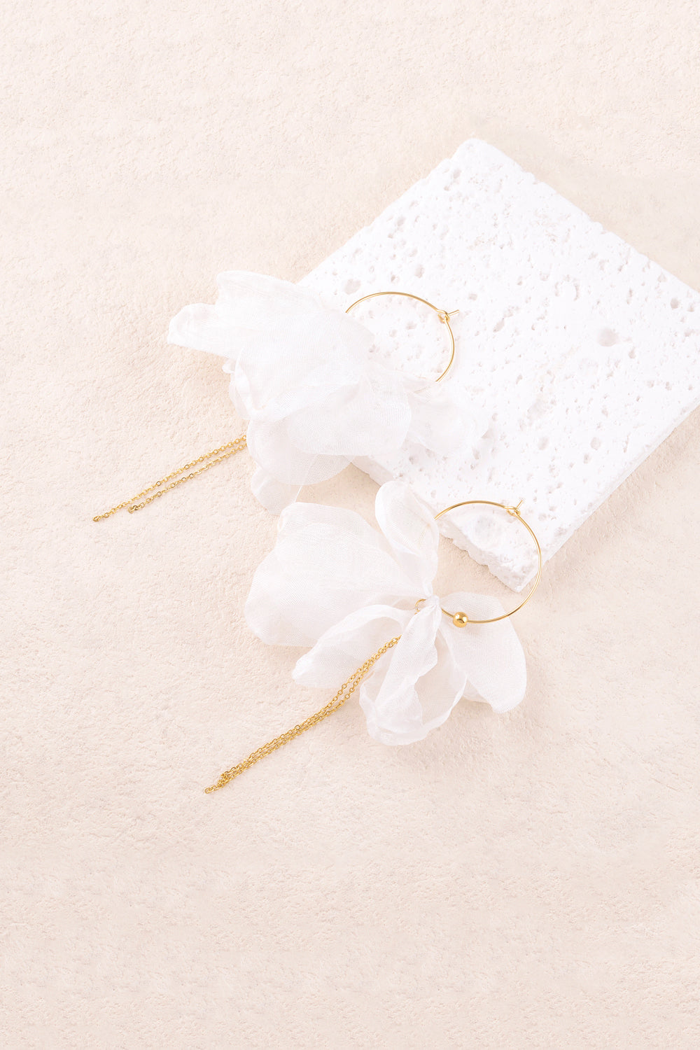 Boucles d'oreilles graphiques type créoles ornées de tissu tullé coloré et de deux chaînes pendantes.