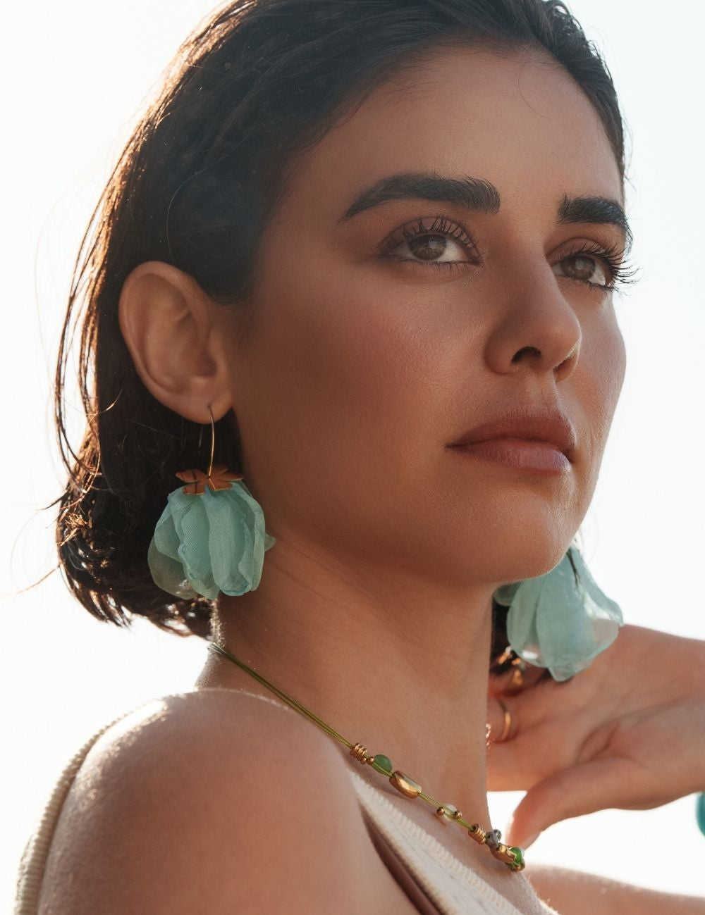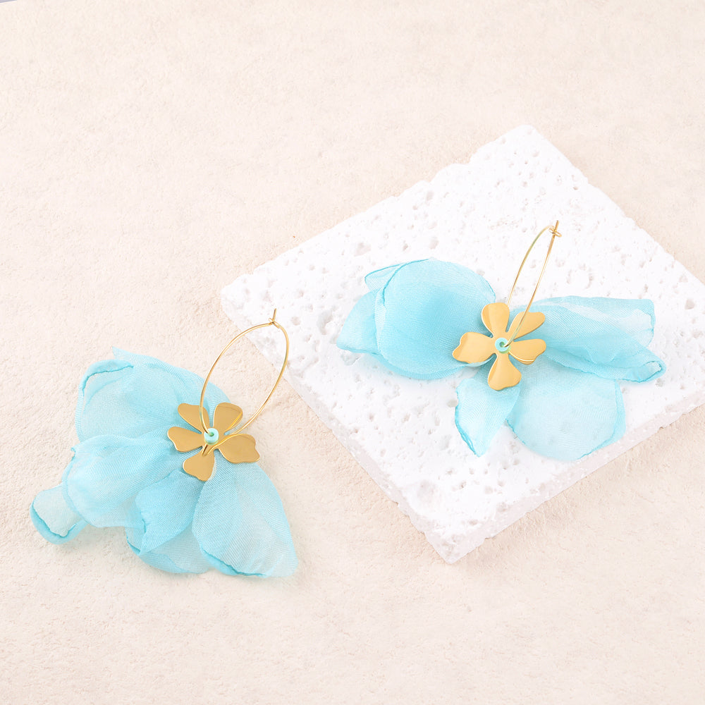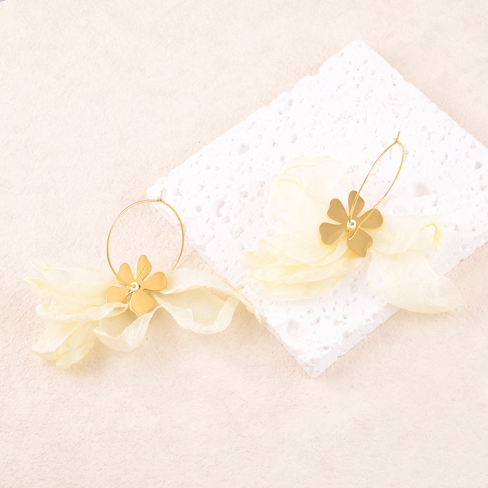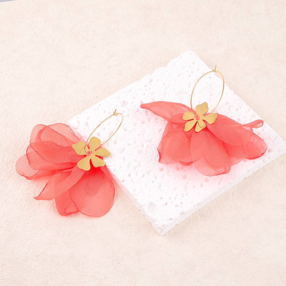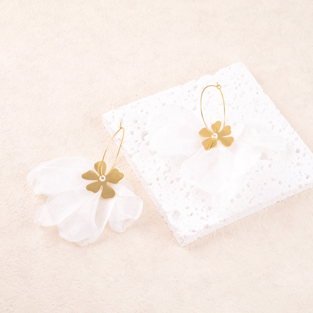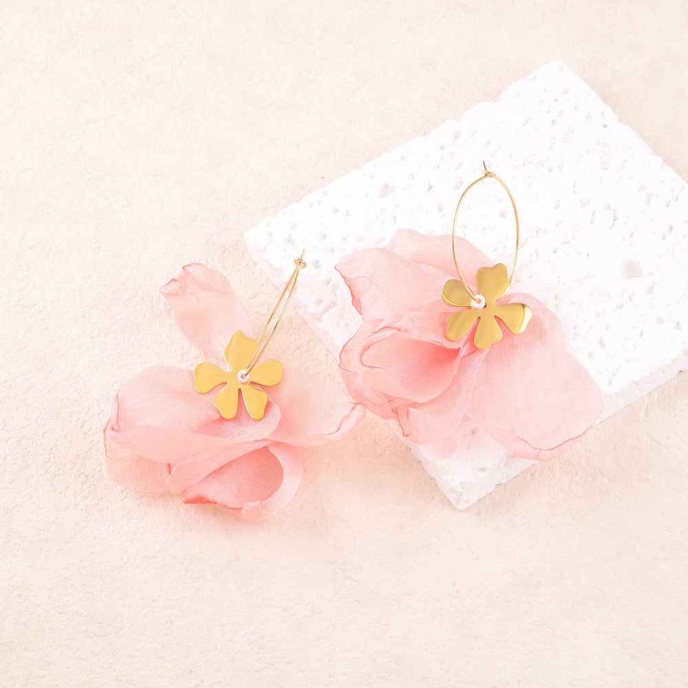 Boucles d'oreilles graphiques type créoles ornées d'une pampille florale ornée d'une perle heishi et d'une fleur en tissu tullé coloré.
