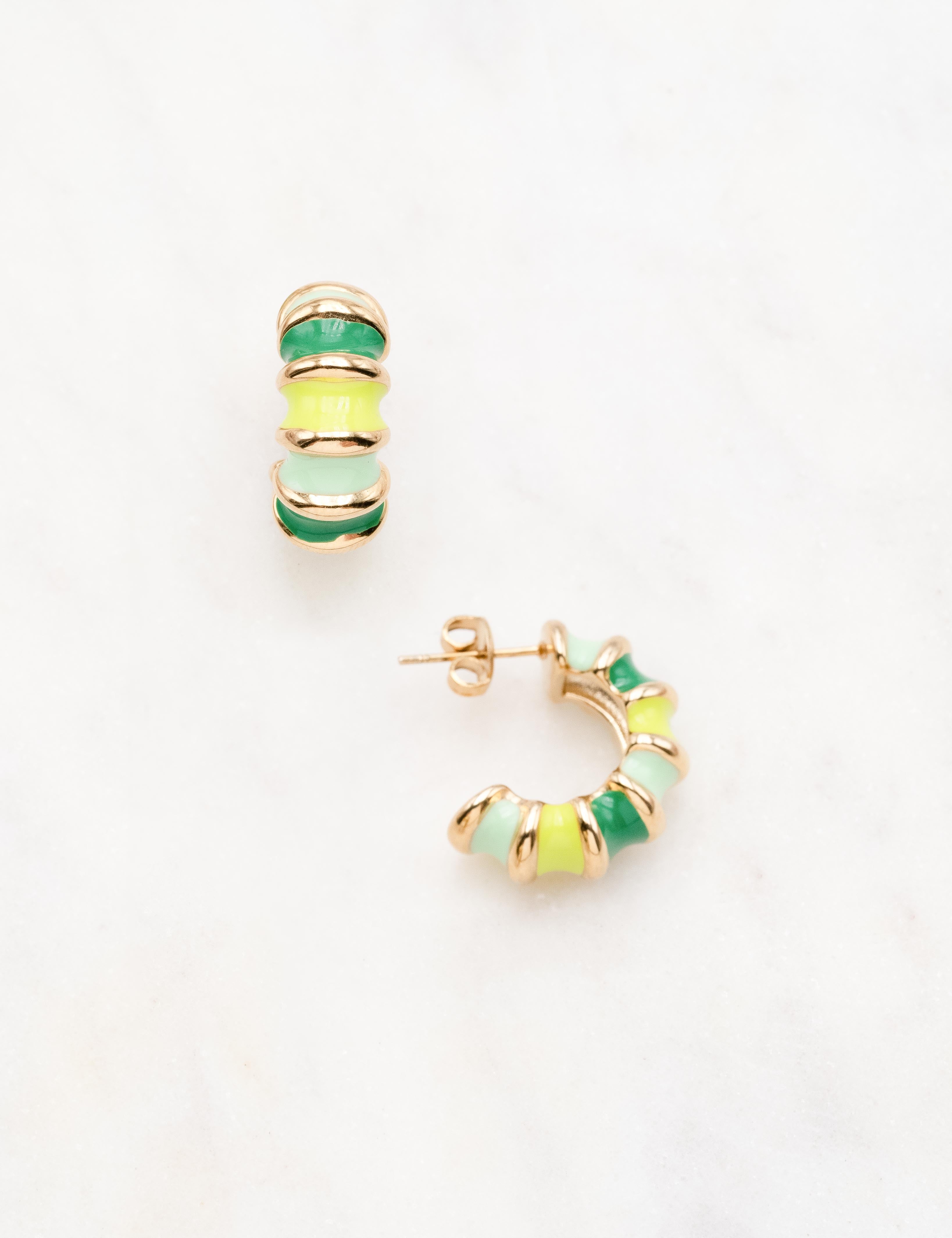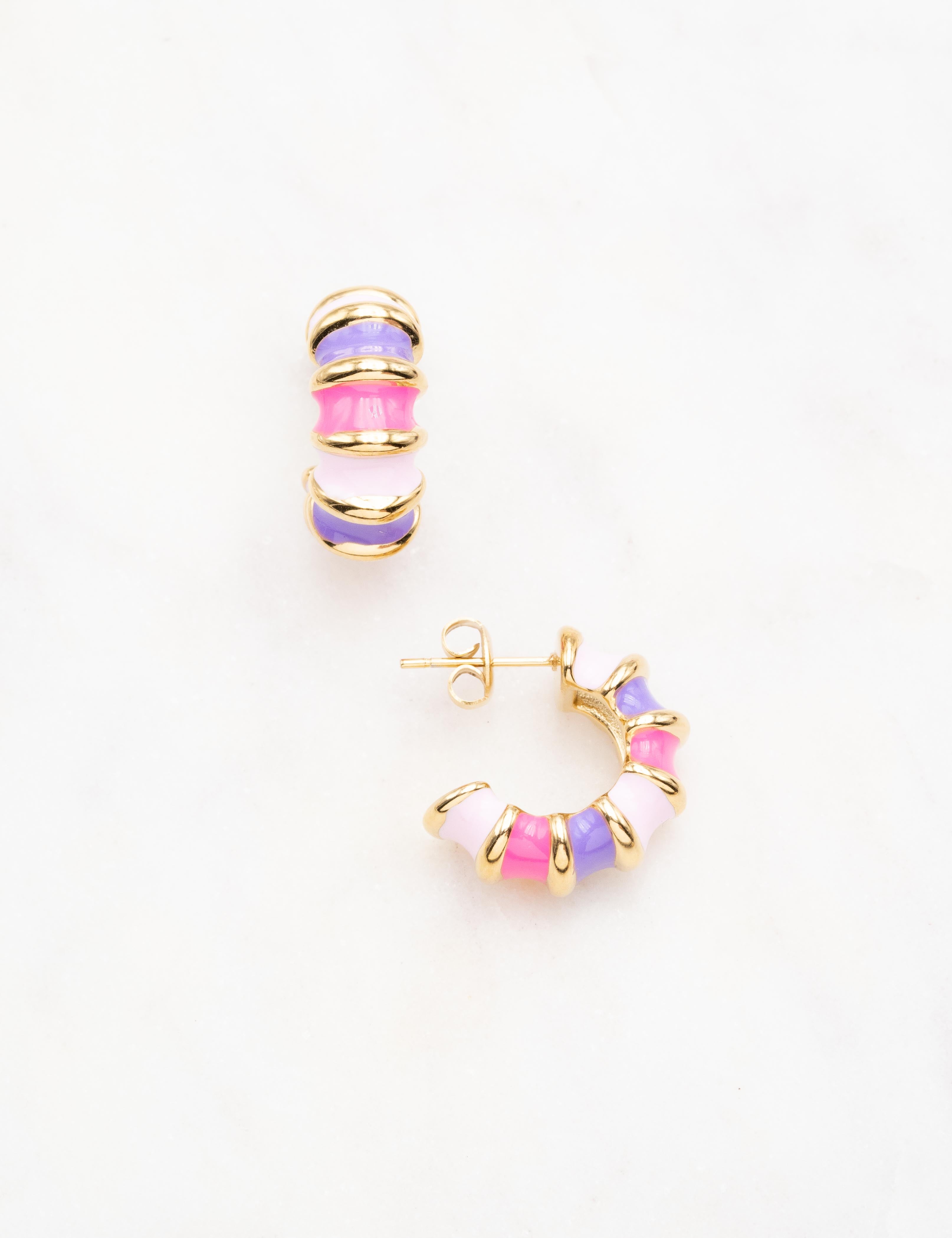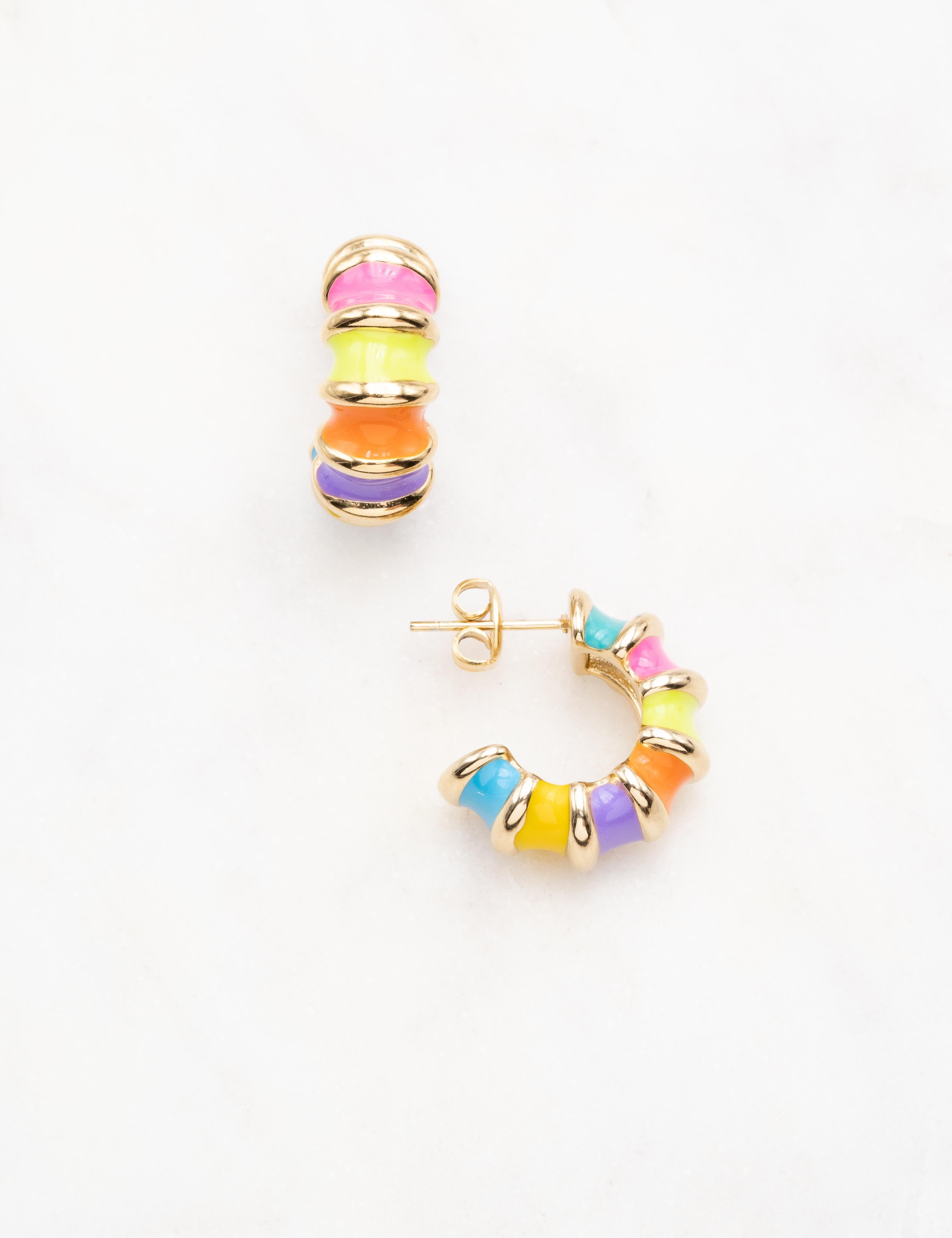 Boucles d'oreilles graphiques type créoles à puce émaillées colorées.