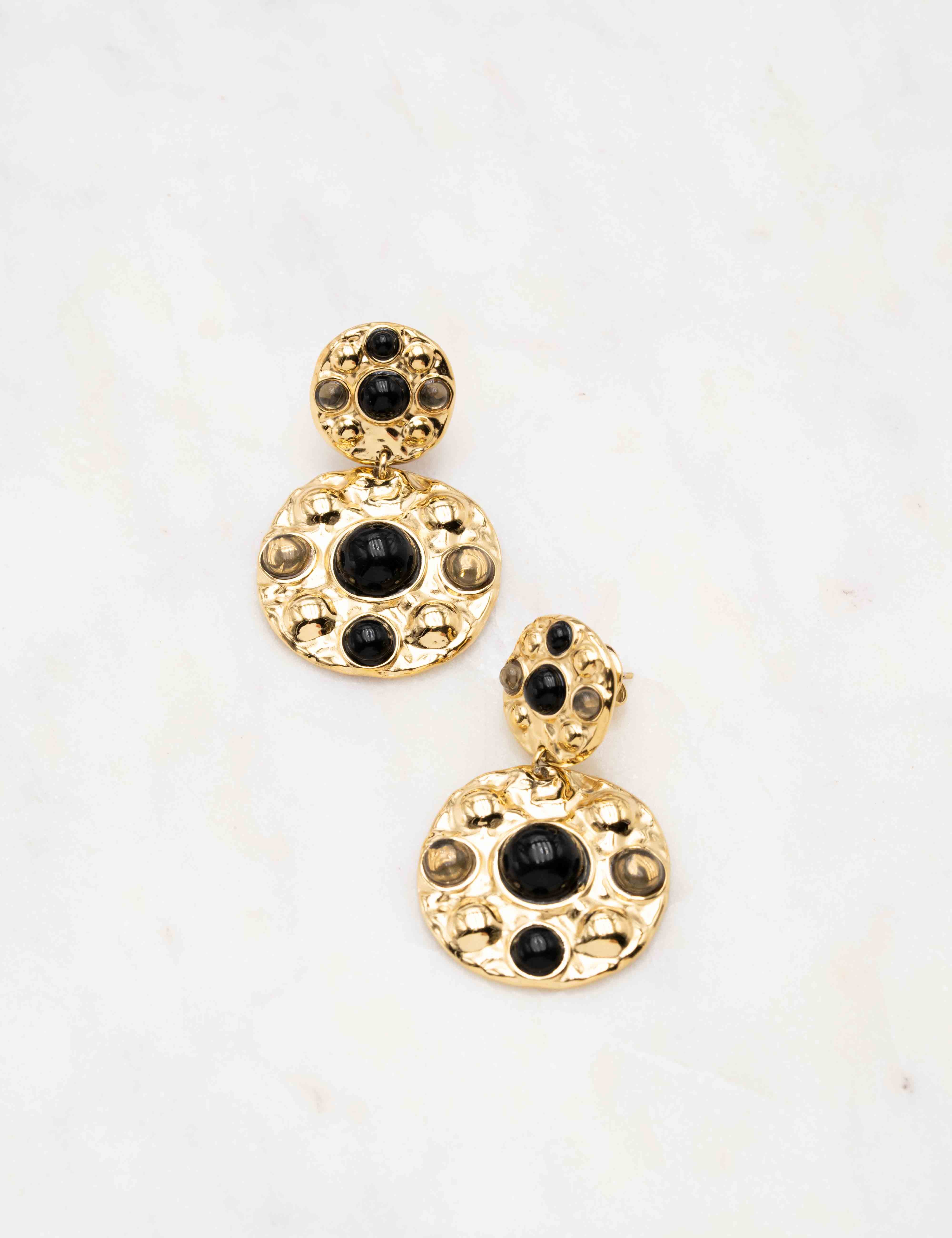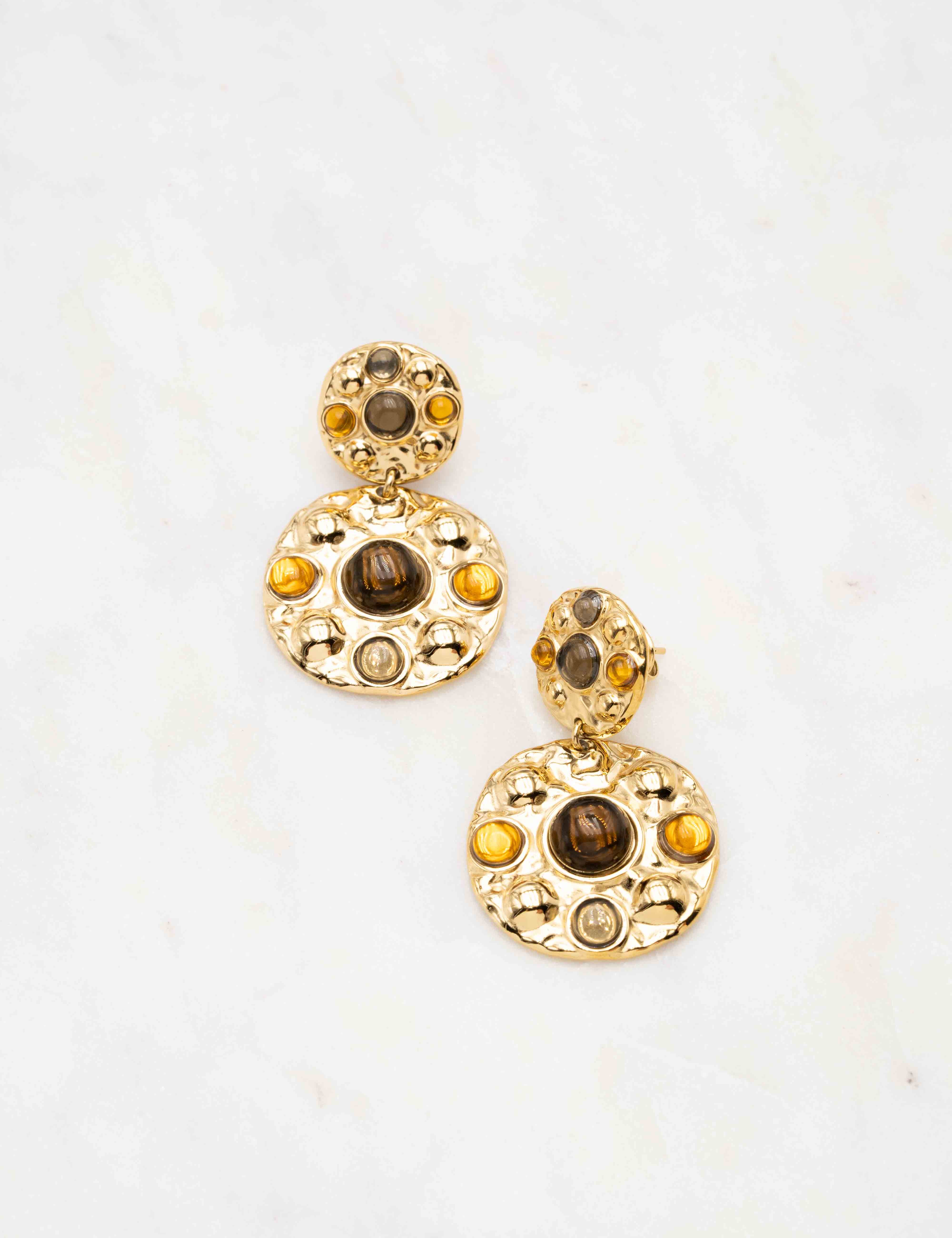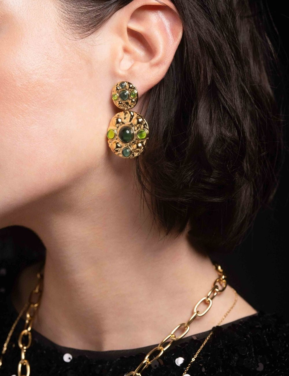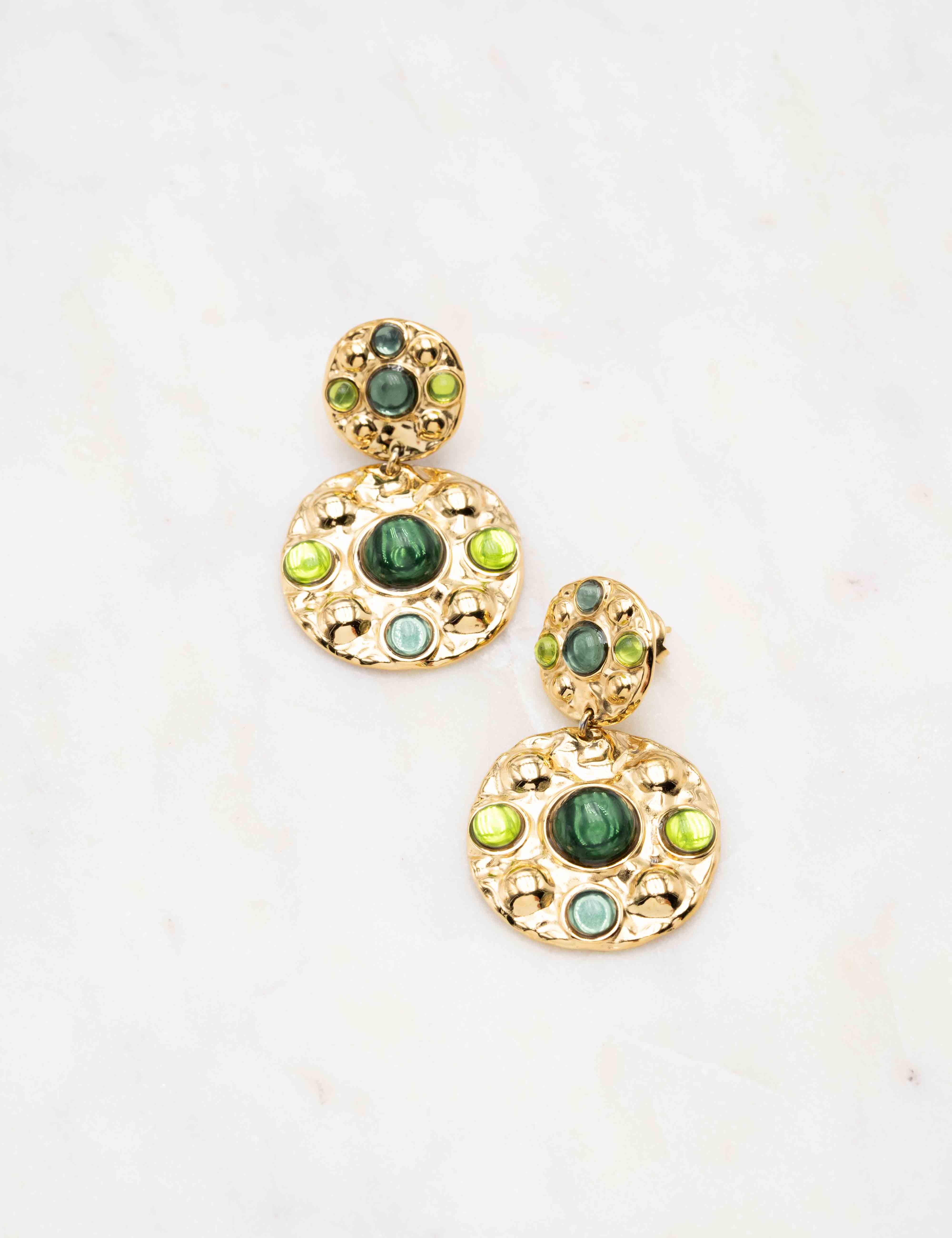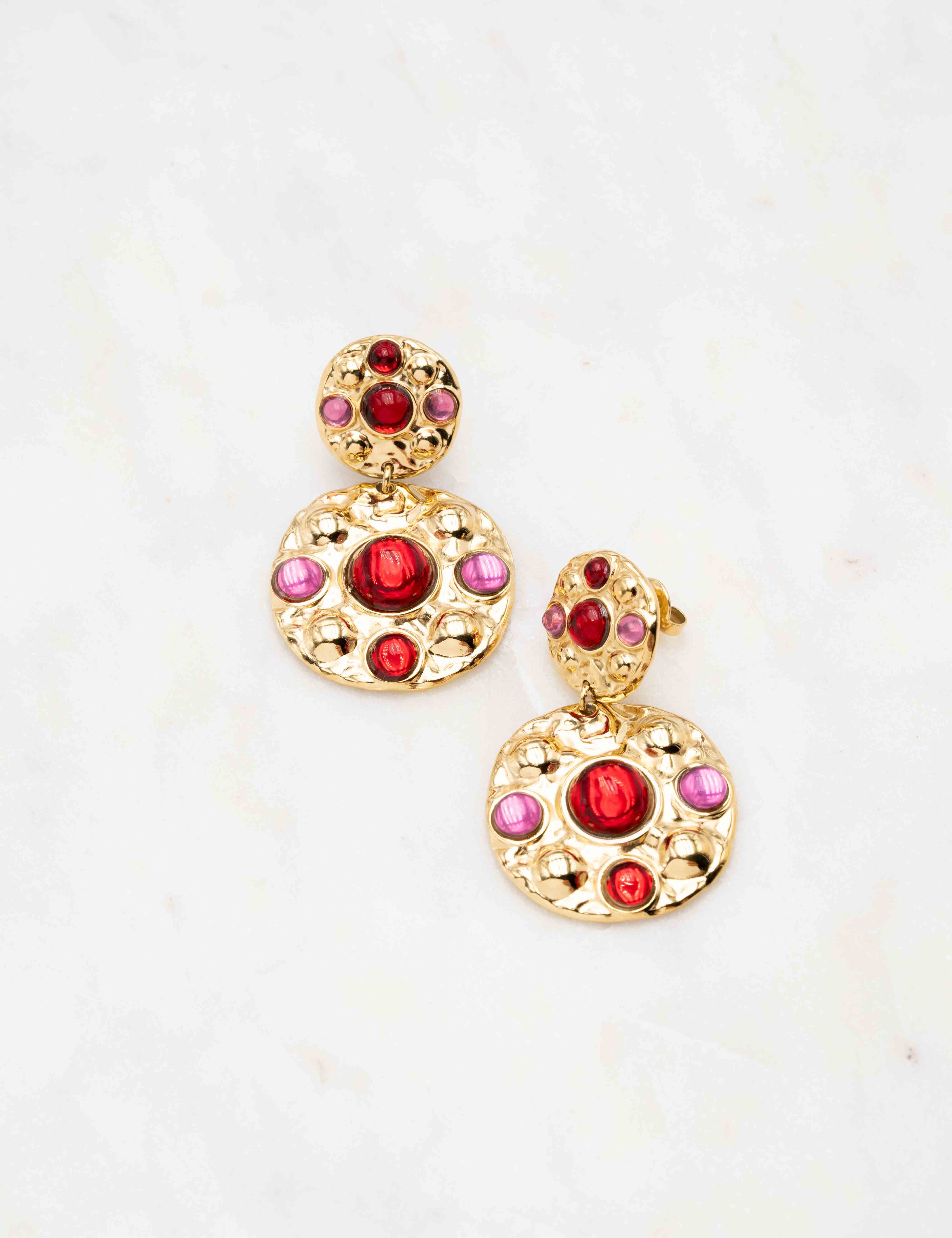 Boucles d'oreilles à puce composées de deux pièces rondes texturées, ornées de pièces colorées style cabochon en pâte de verre.