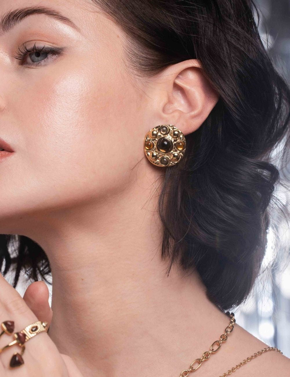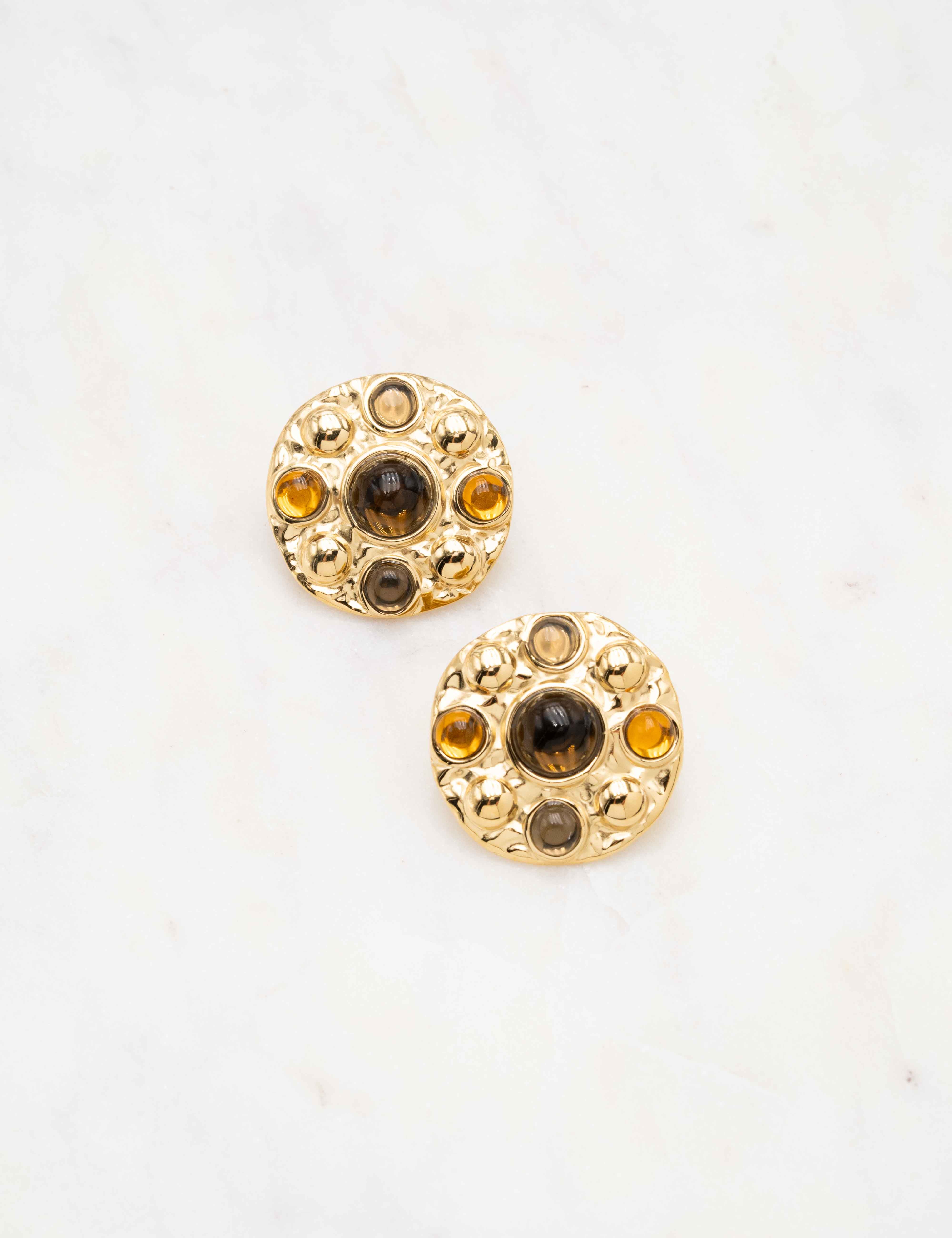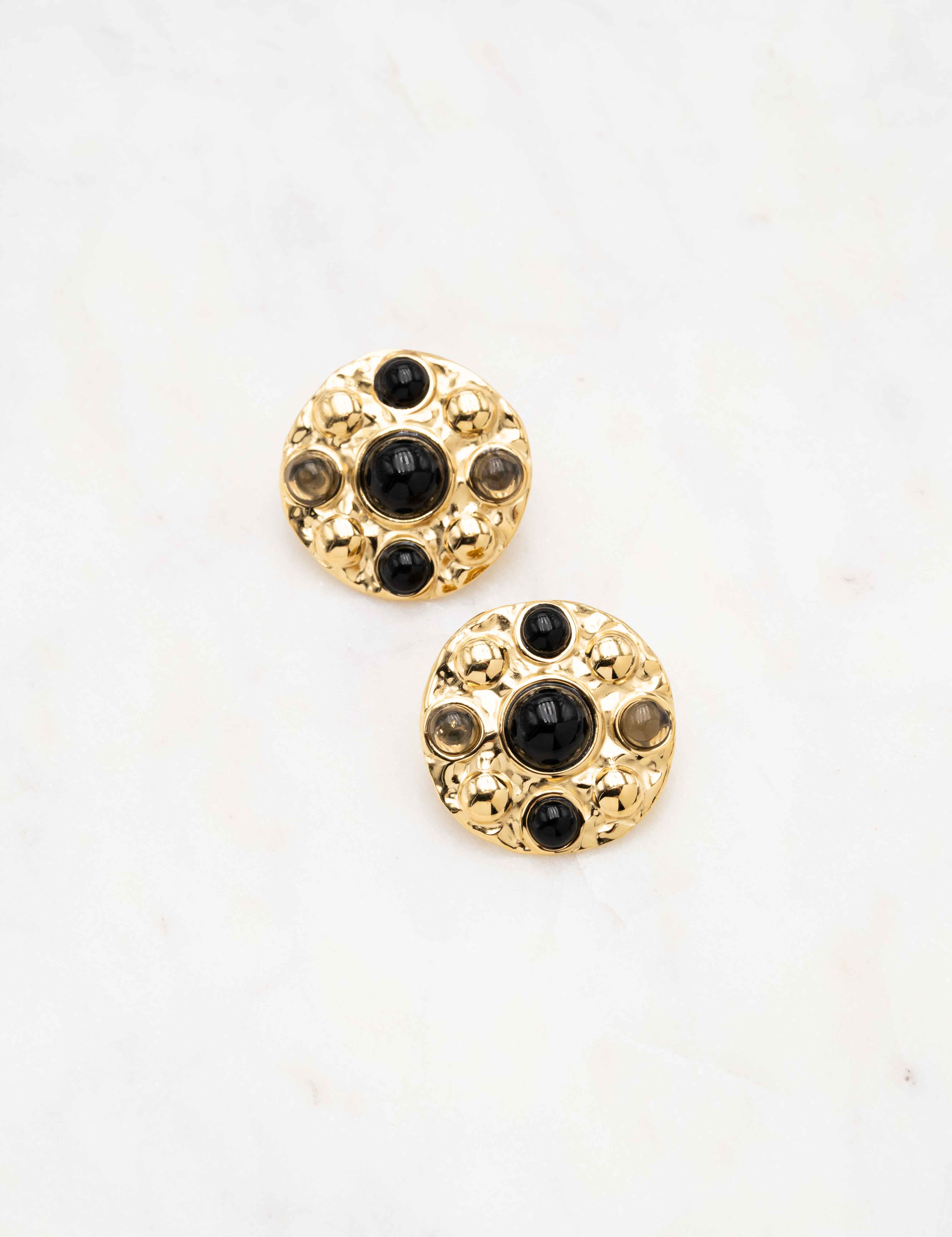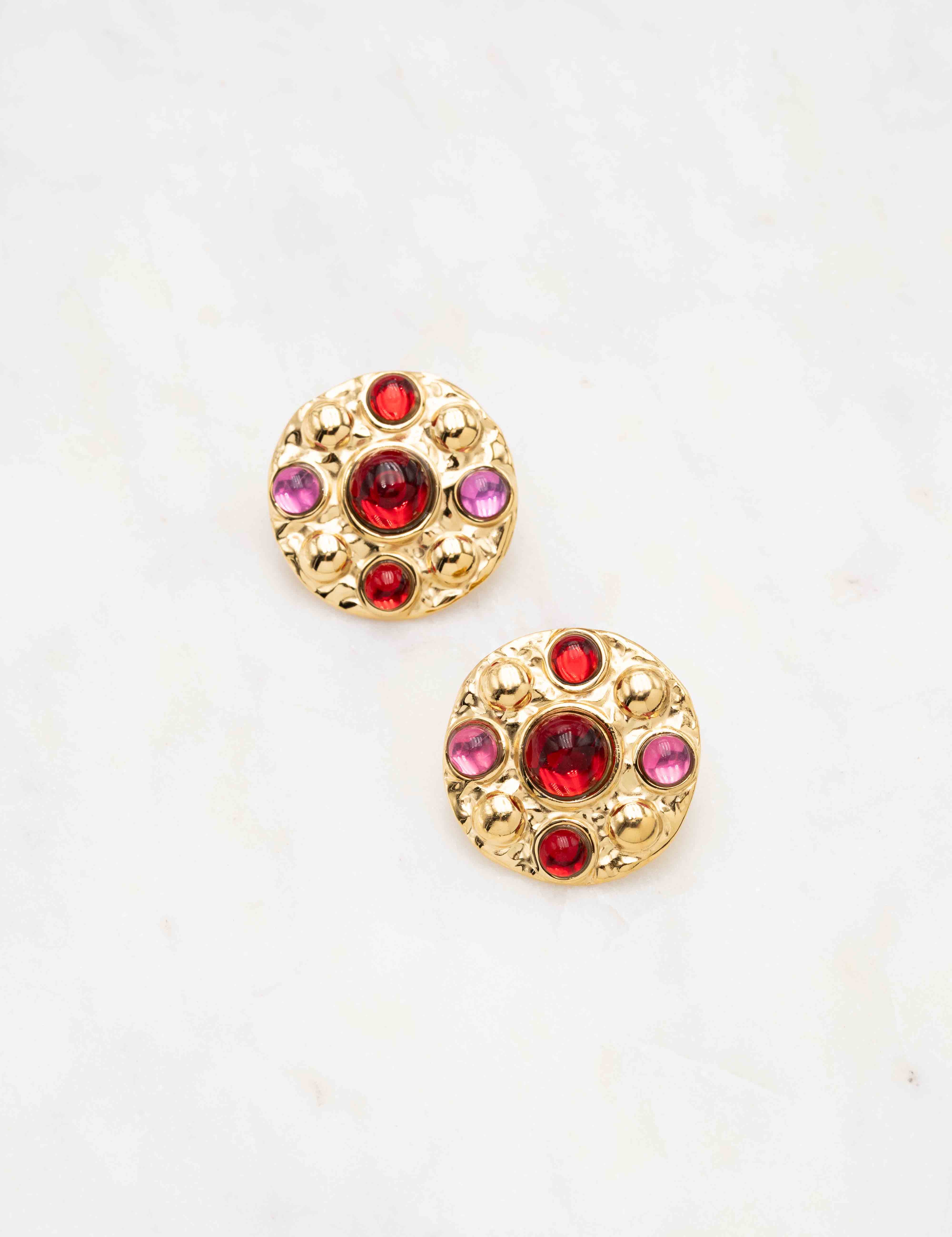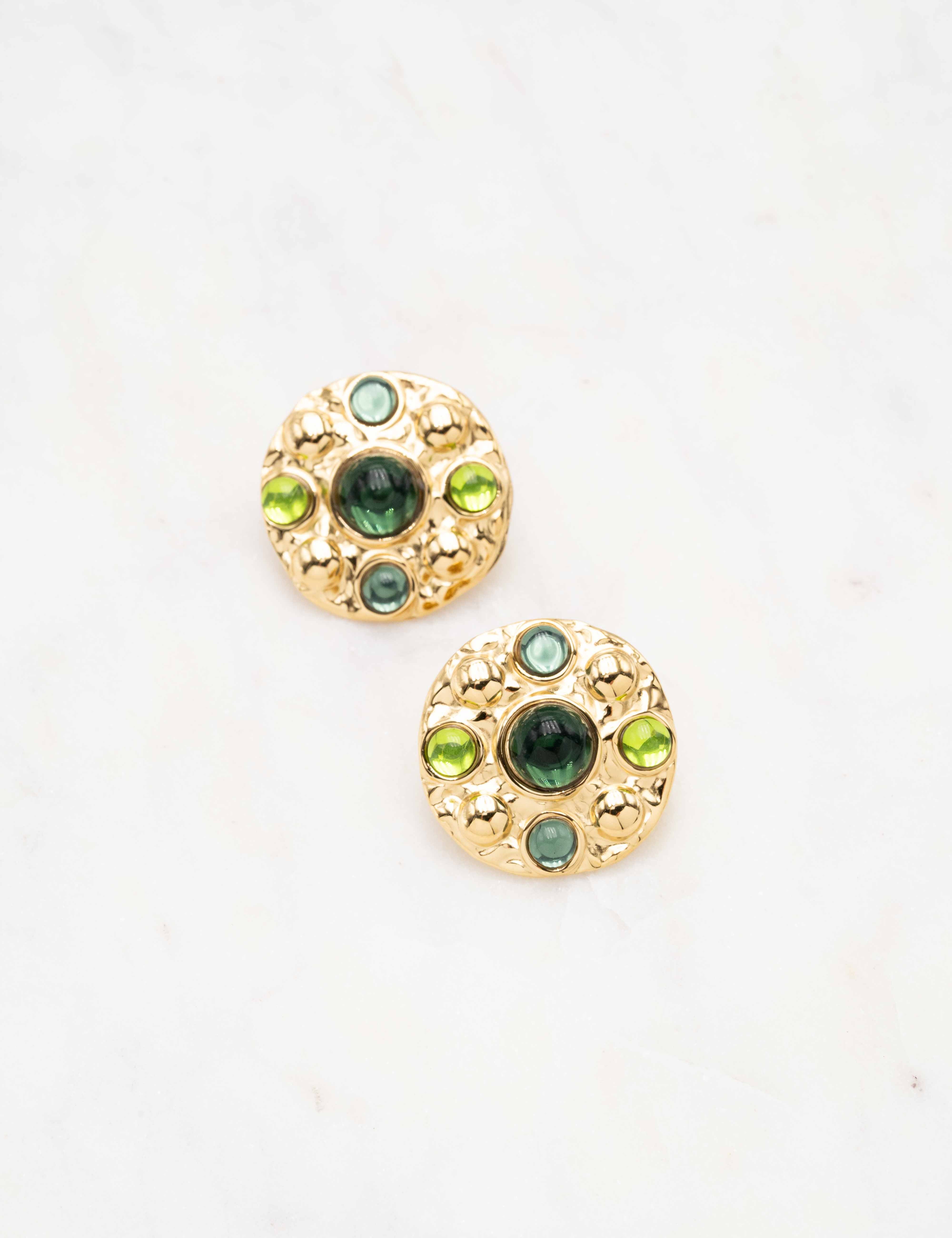 Boucles d'oreilles graphiques à puce composées d'une pièce texturée ornée de pièces colorées style cabochon en pâte de verre.