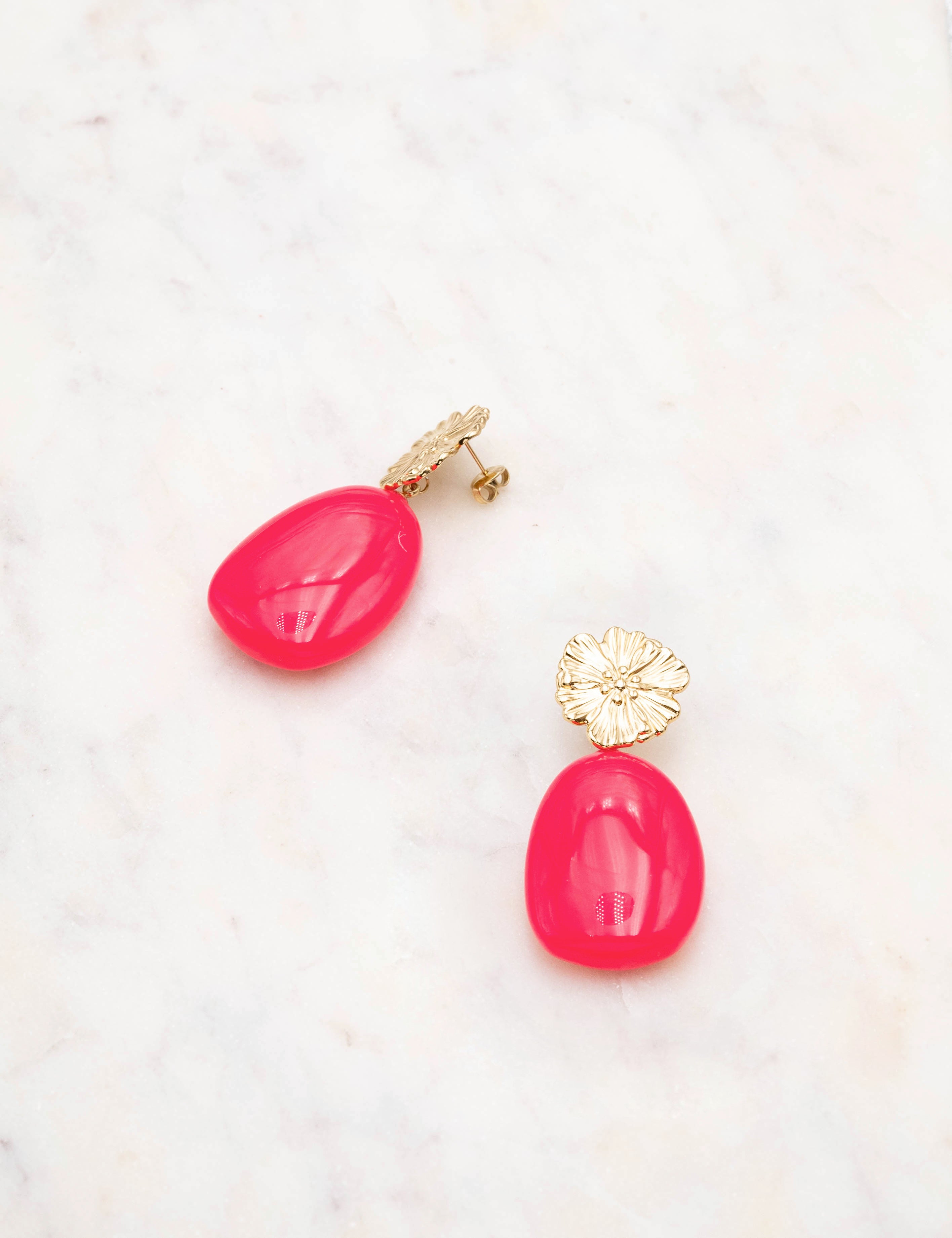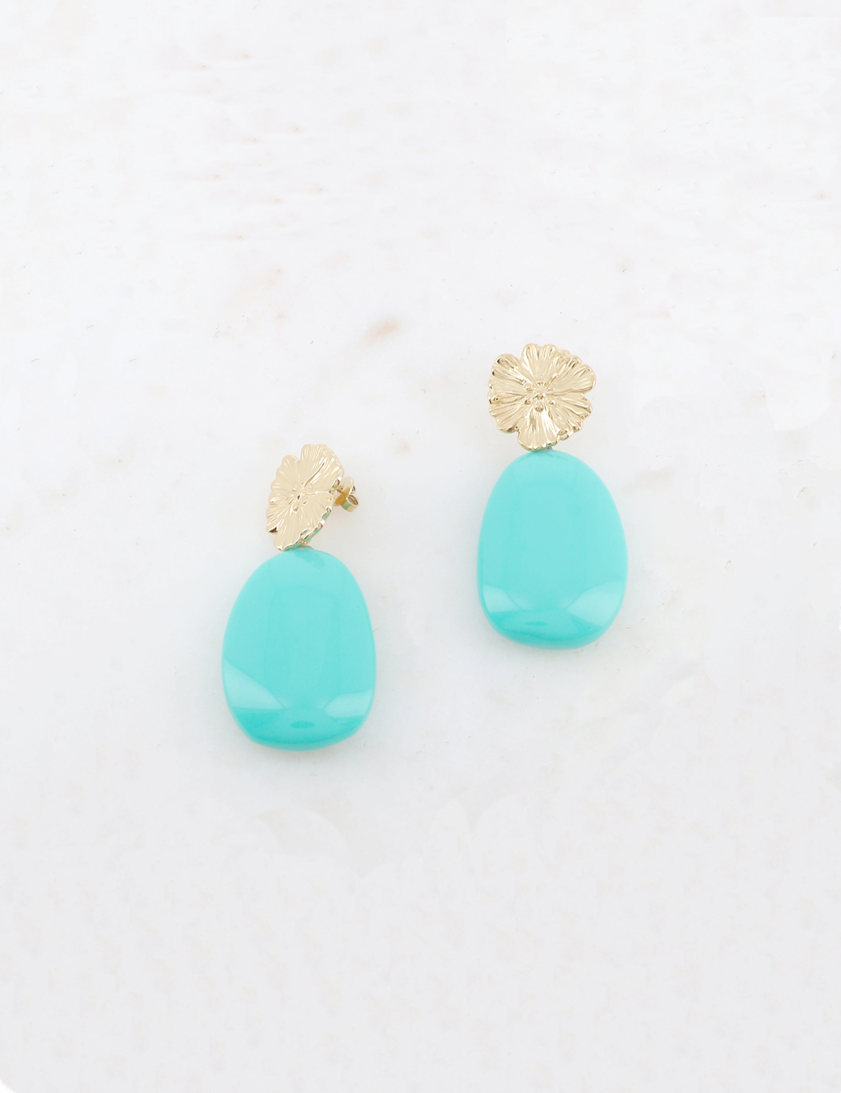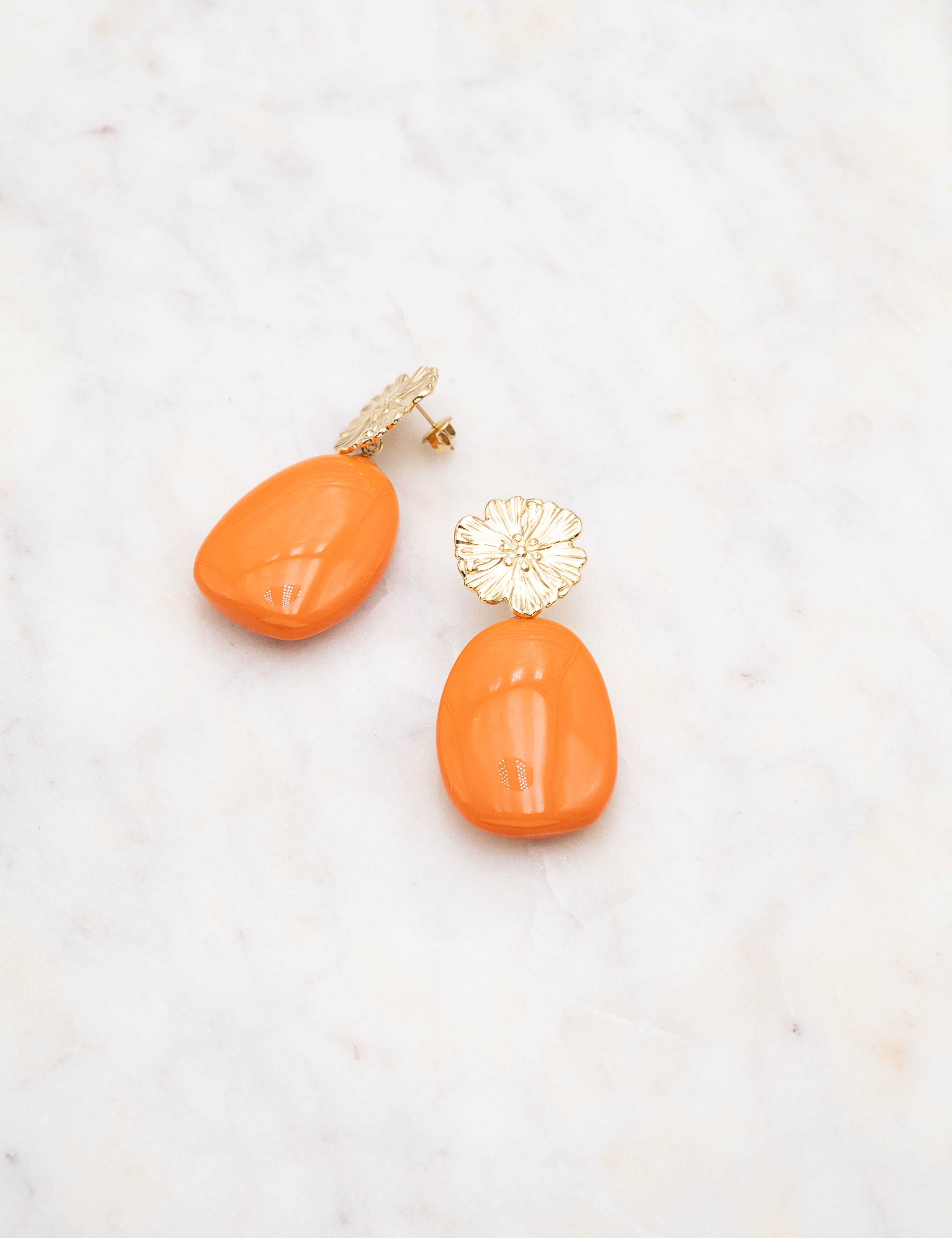 Boucles d'oreilles graphiques à puce composées d'une pièce florale texturée et d'un pendant en résine colorée.