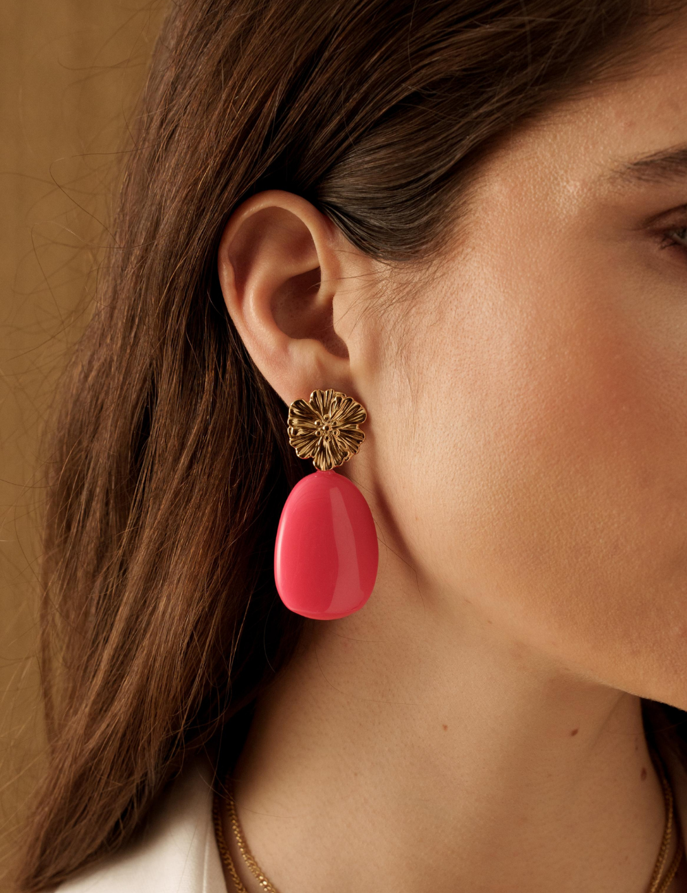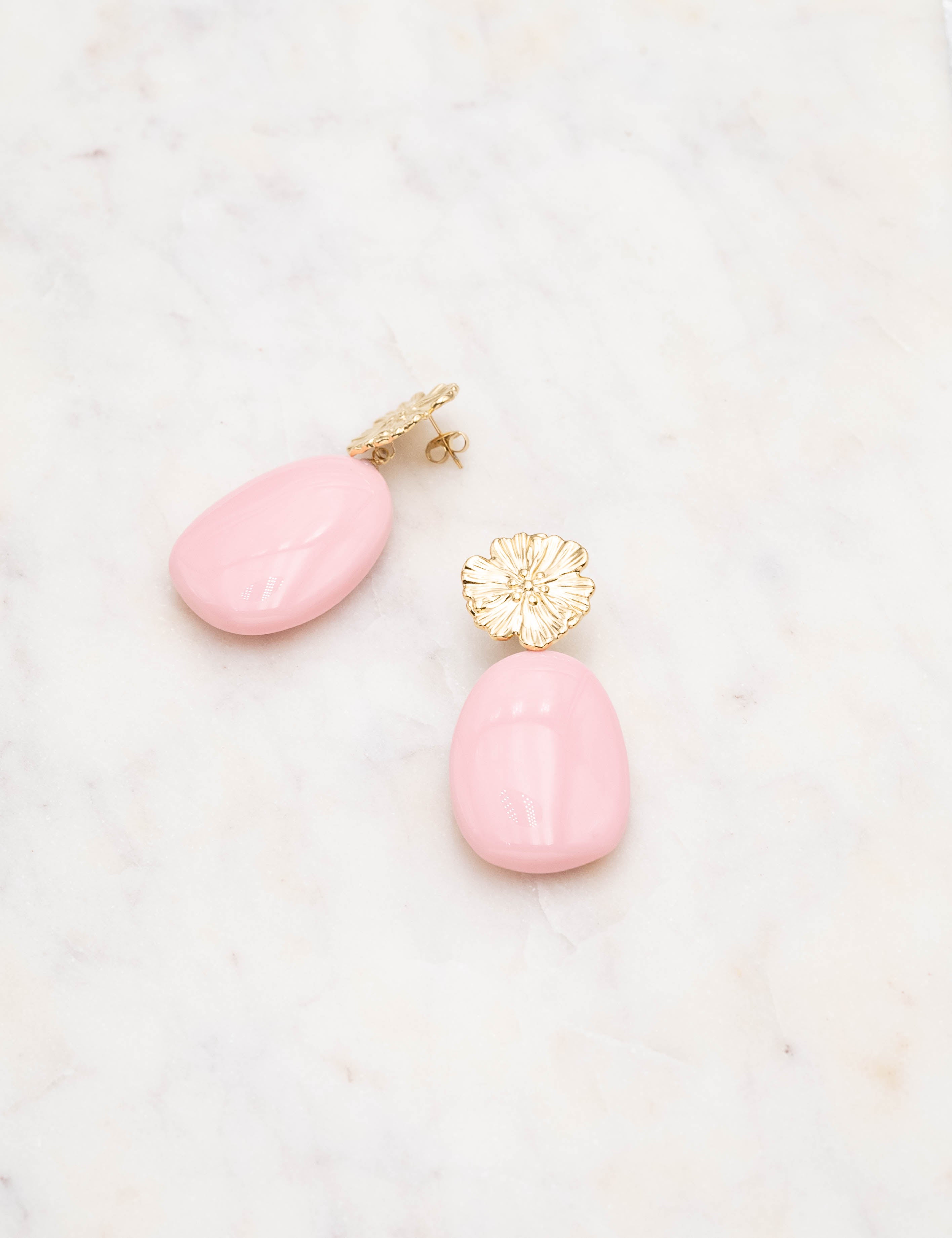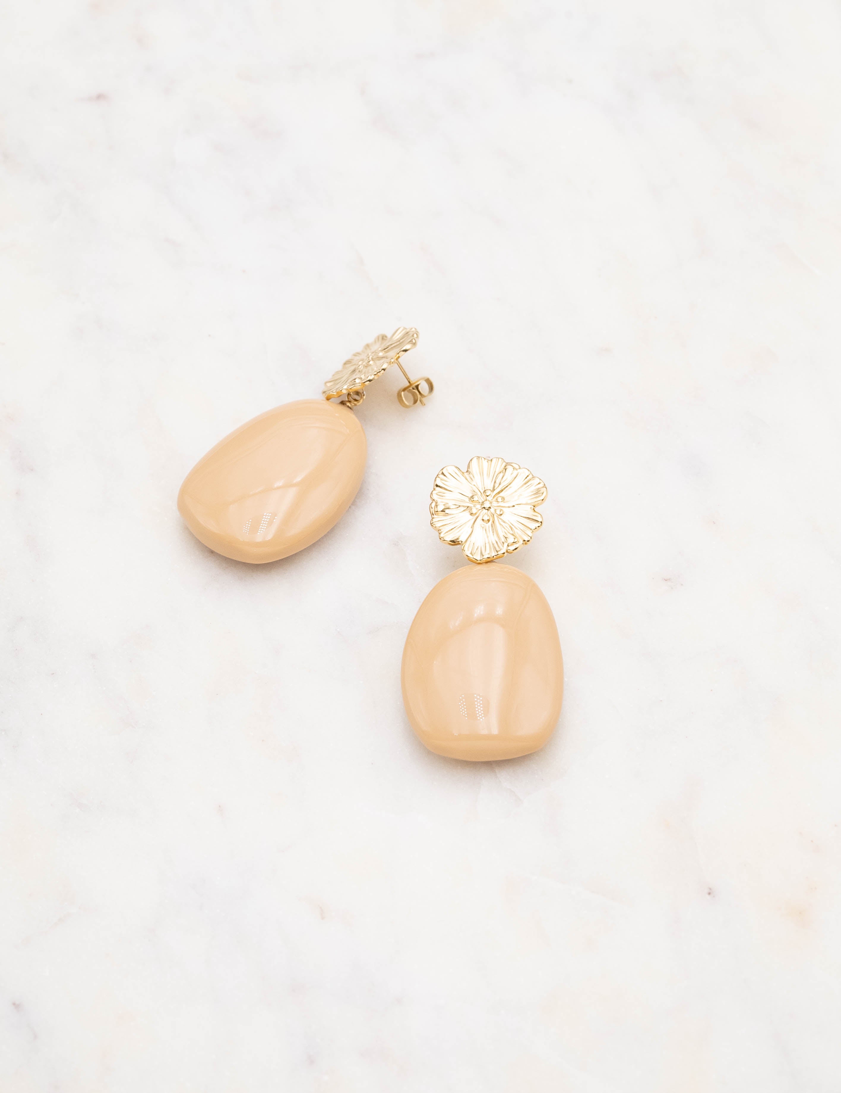 Boucles d'oreilles graphiques à puce composées d'une pièce florale texturée et d'un pendant en résine colorée.