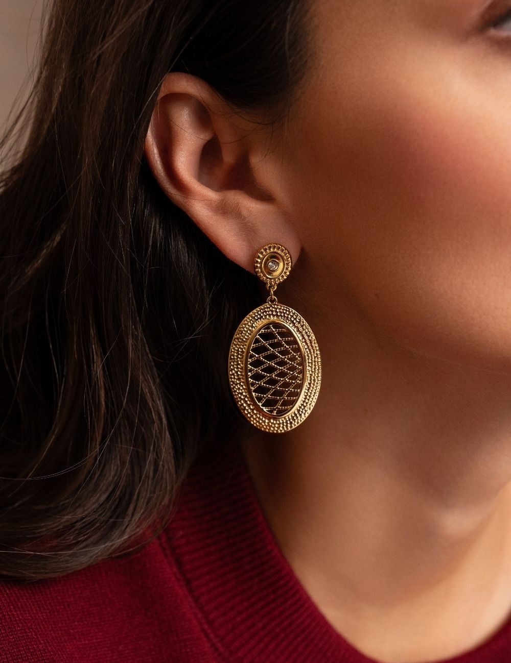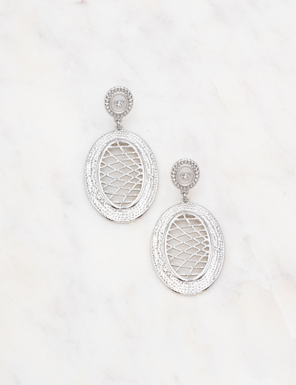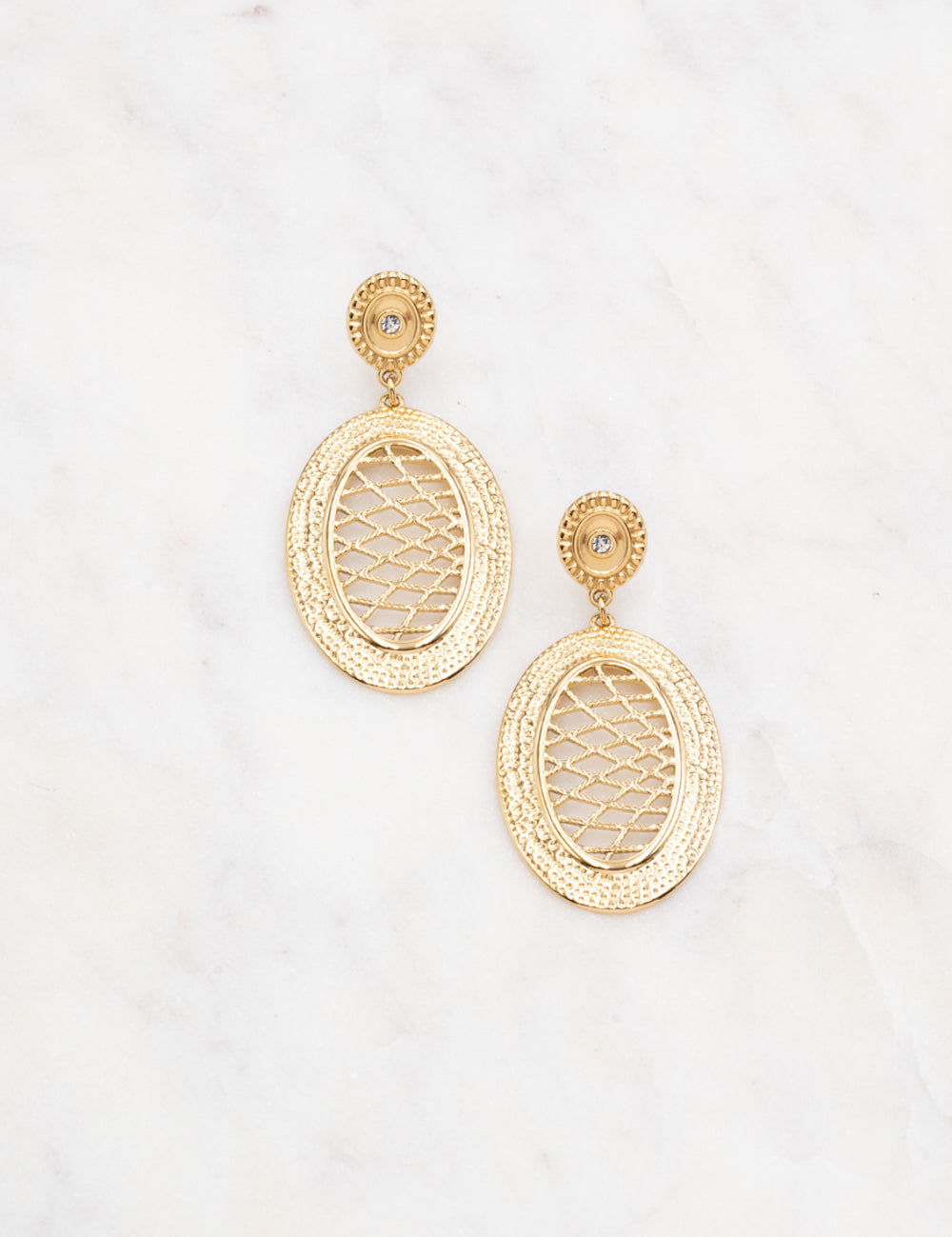 Boucles d'oreilles à puce composées d'une pièce ornée d'un strass et d'un pendant de forme ovale avec un jeu de lignes graphiques texturées et ajourées.