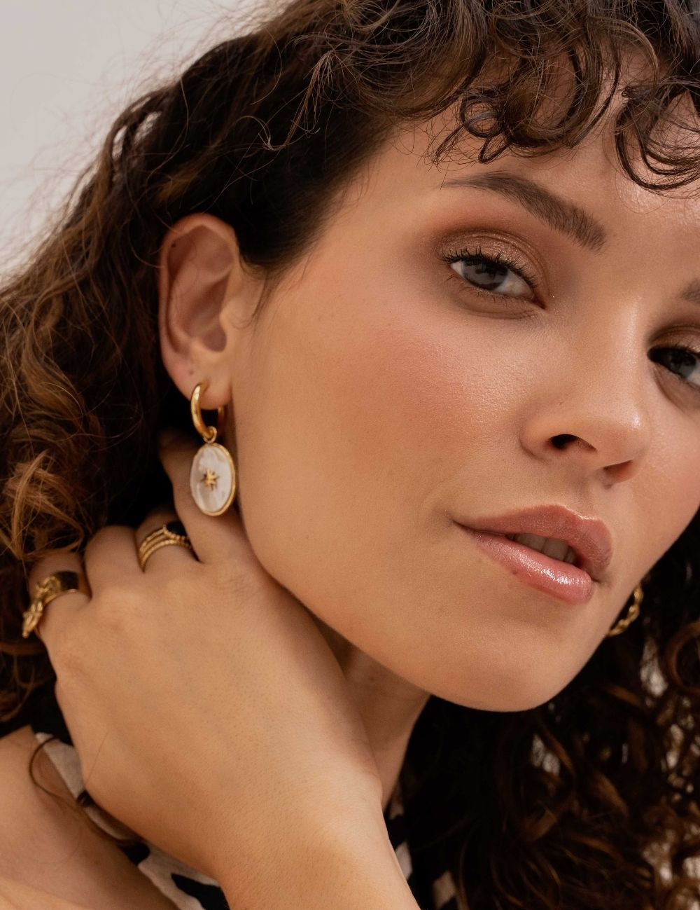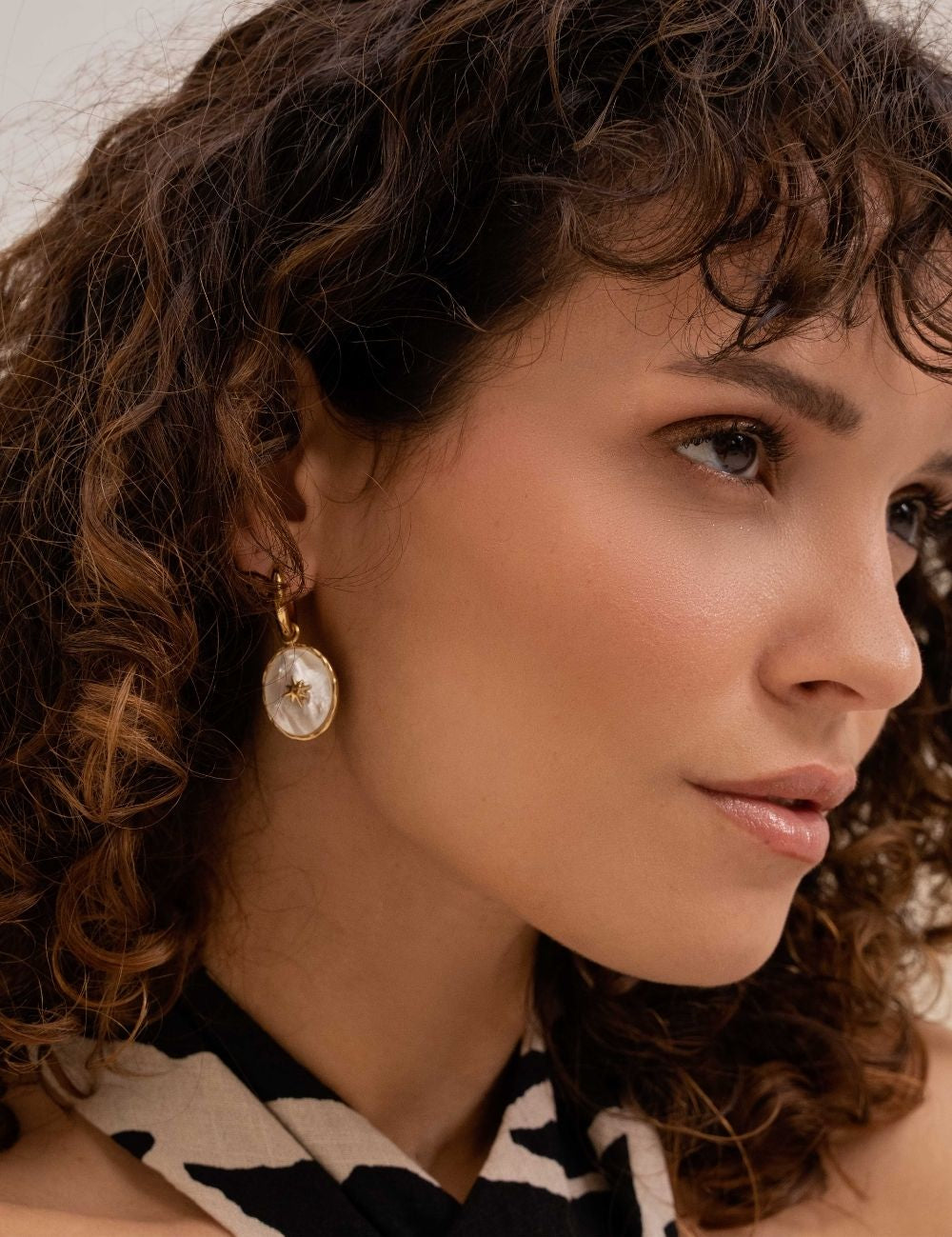 Boucles d'oreilles type créoles composées d'une pièce nacrée ornée d'une étoile dorée.