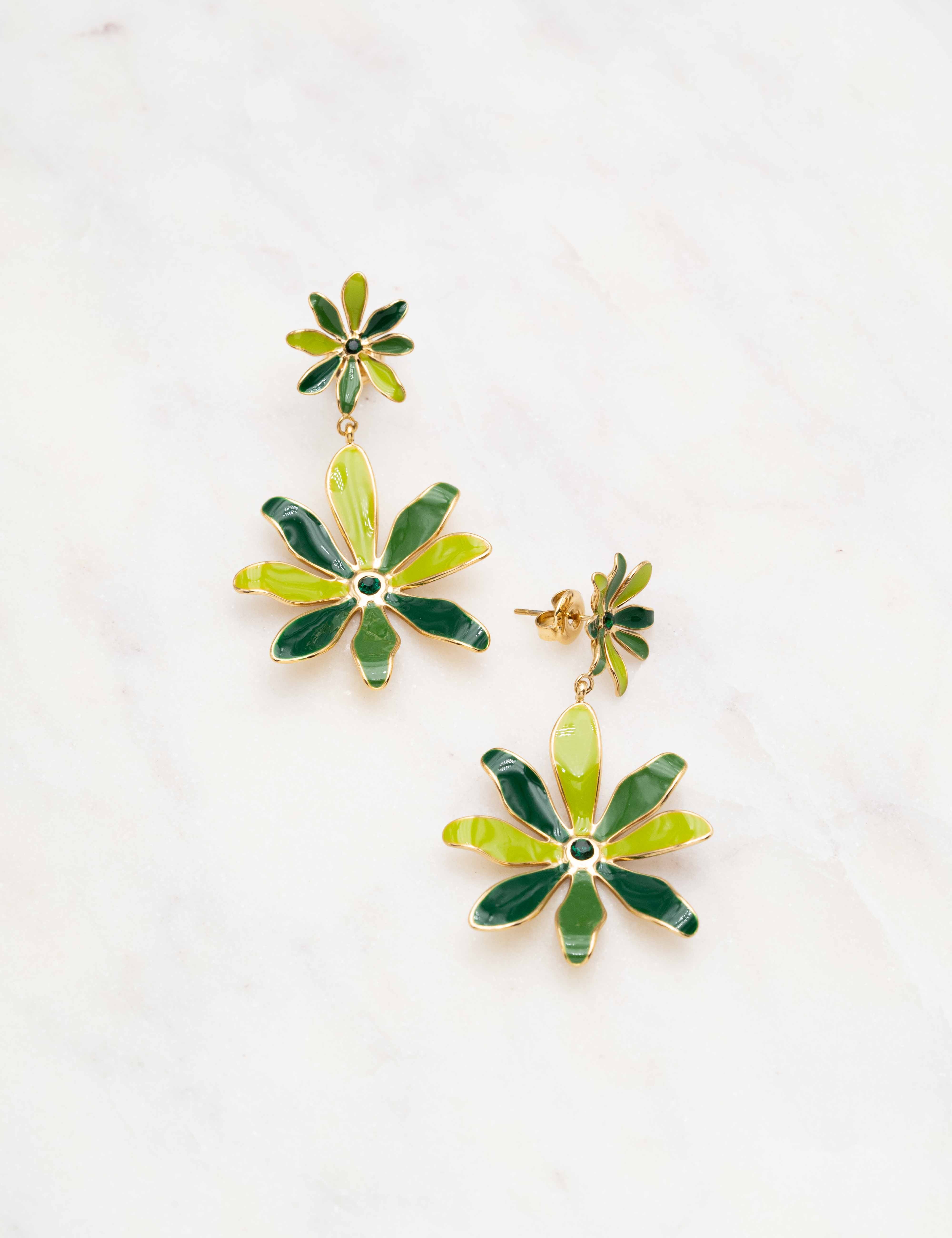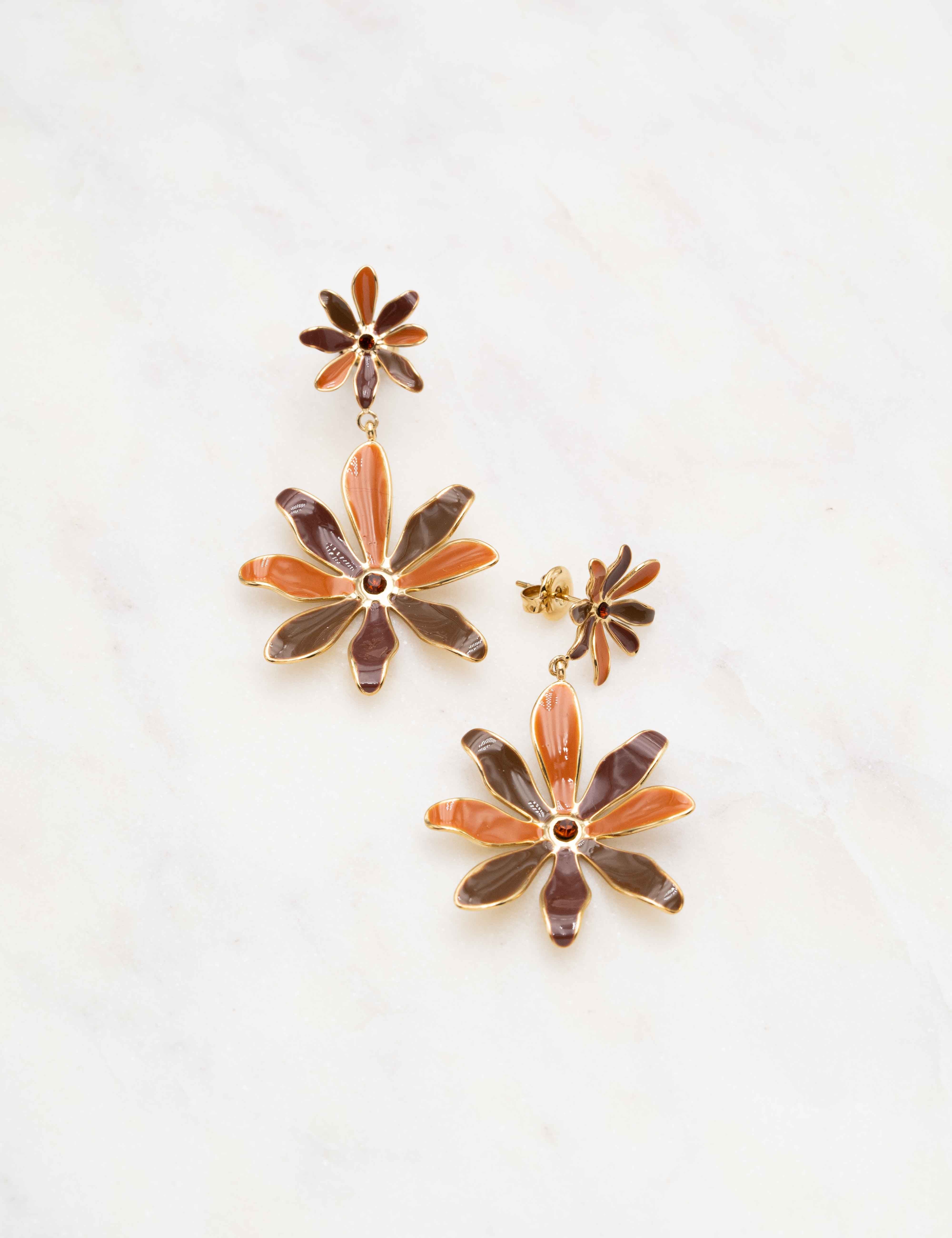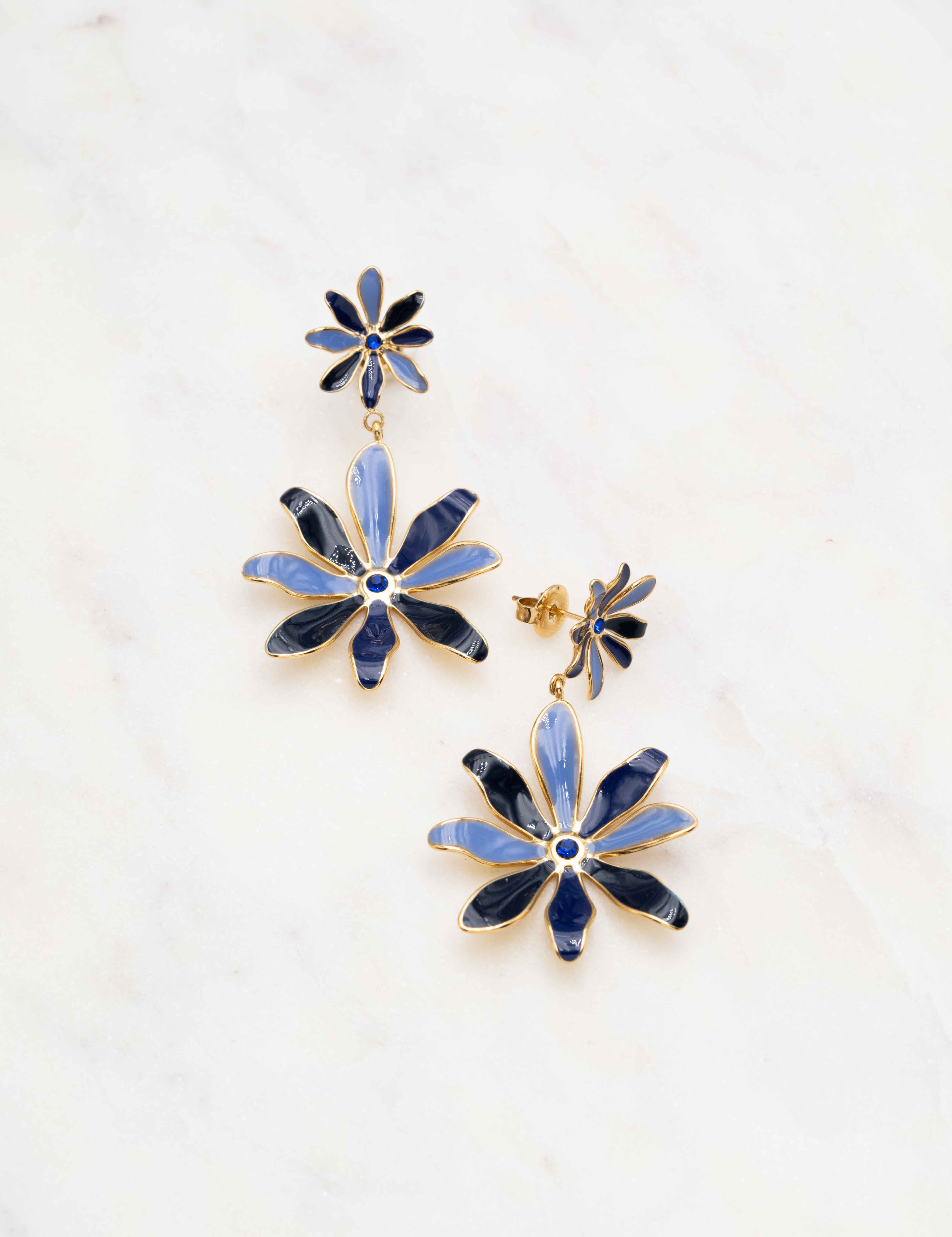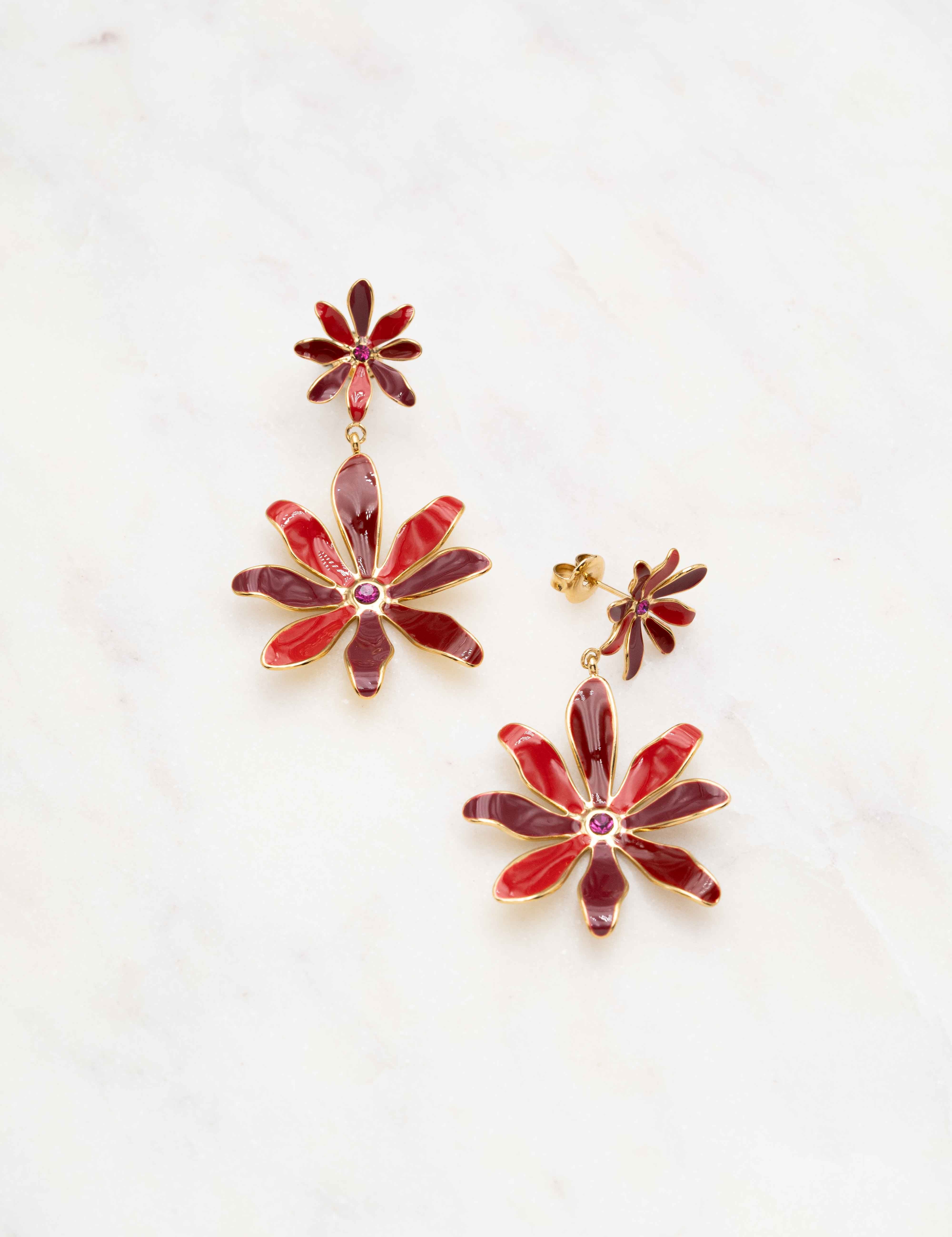 Boucles d'oreilles à puce composée de deux pièces au motif floral émaillé coloré orné d'un strass.