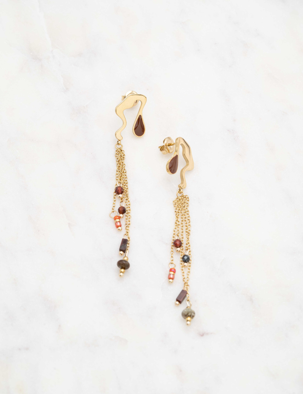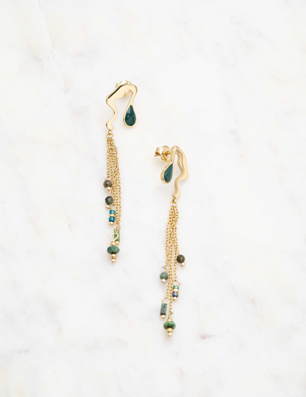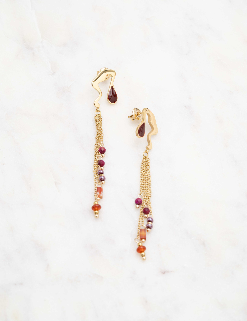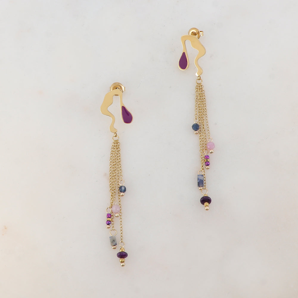 Boucles d'oreilles graphiques à puce composées d'une pièce émaillée colorée sur laquelle est suspendue des chaines pendantes ornées de pampilles (perles en pierres naturelles, pate de verre).