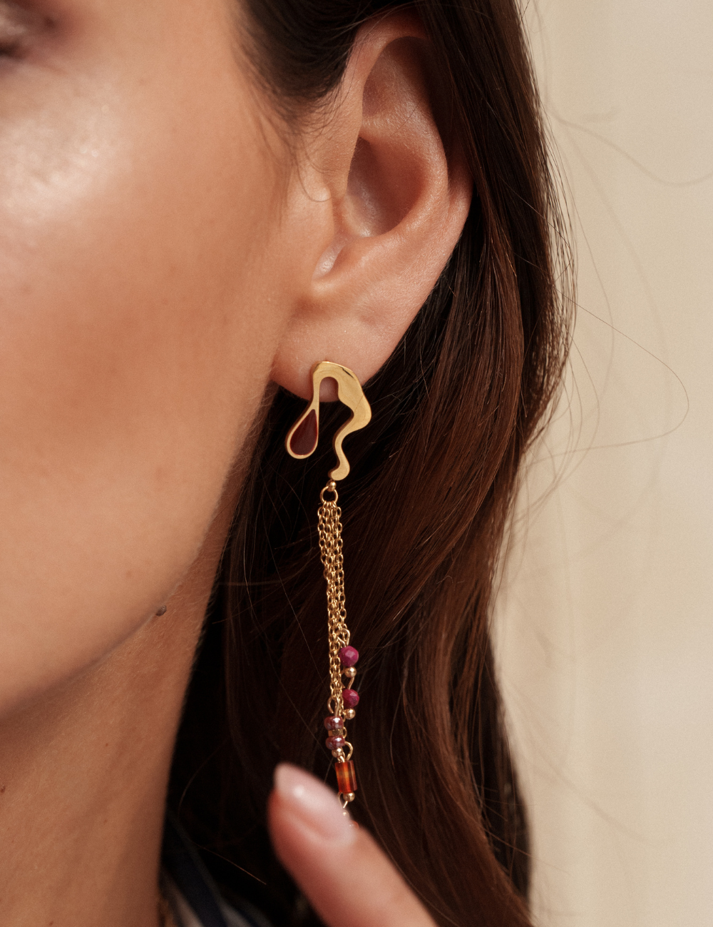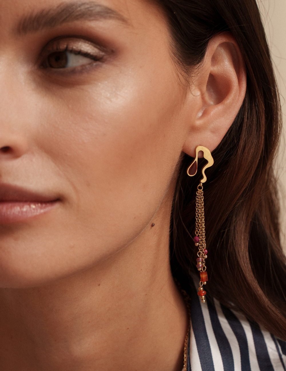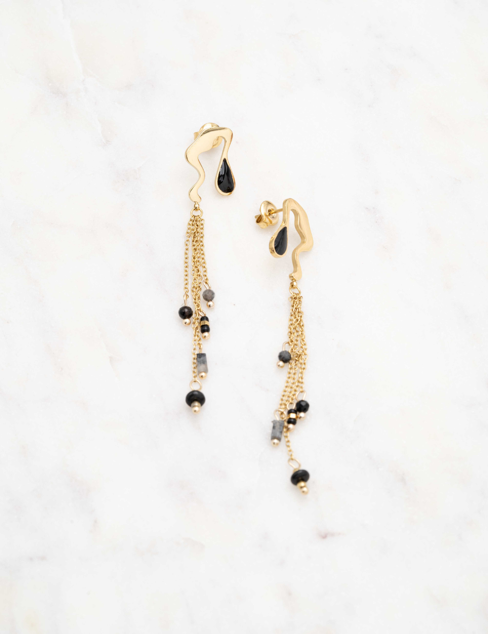 Boucles d'oreilles graphiques à puce composées d'une pièce émaillée colorée sur laquelle est suspendue des chaines pendantes ornées de pampilles (perles en pierres naturelles, pate de verre).