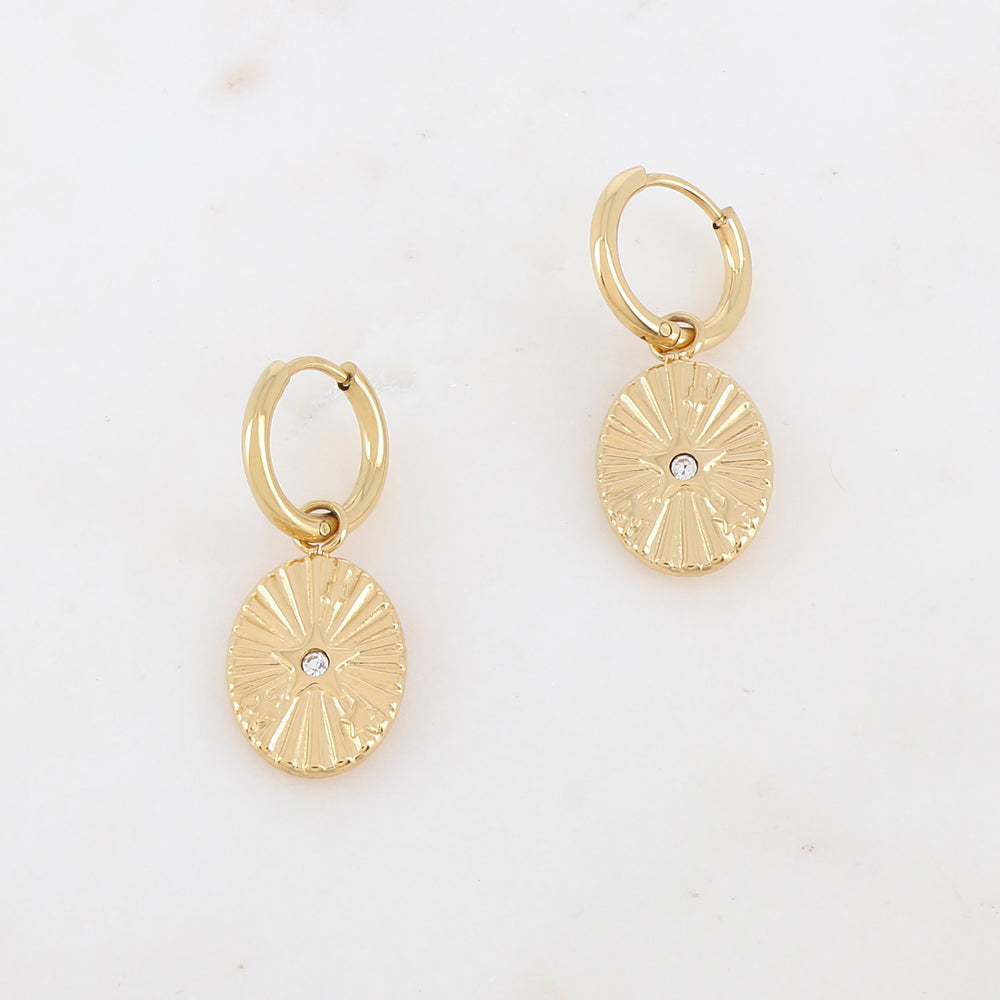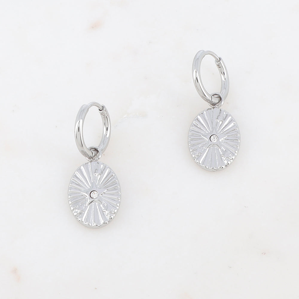 Boucles d'oreilles type créoles composées d'une pièce ronde martelée avec un motif étoilé. Fermoir charnière.