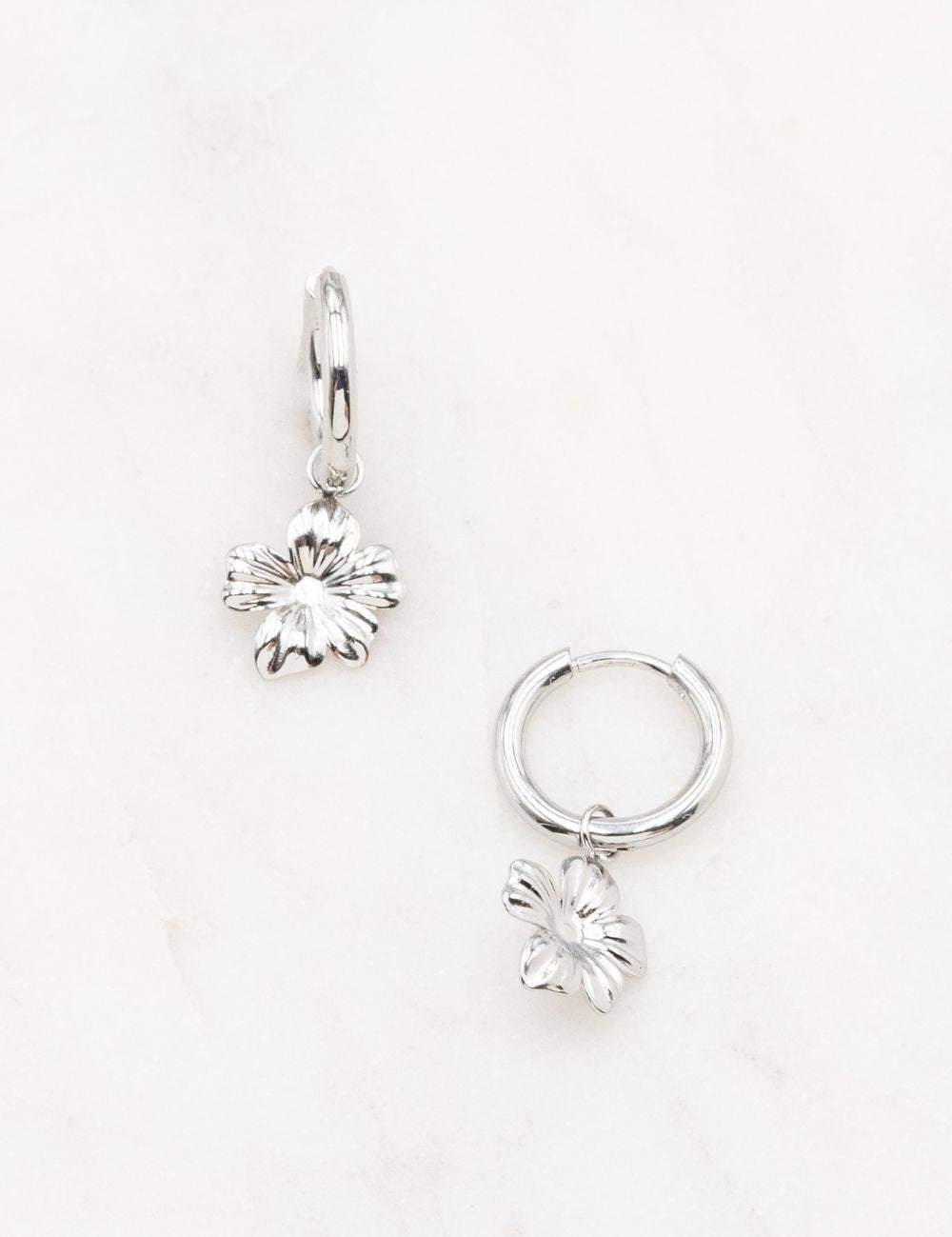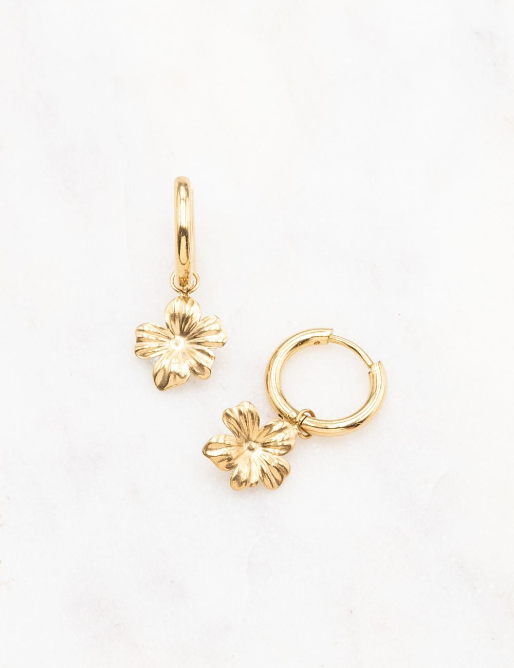 Boucles d'oreilles graphiques type créoles composées une pampille en forme de fleur texturée.