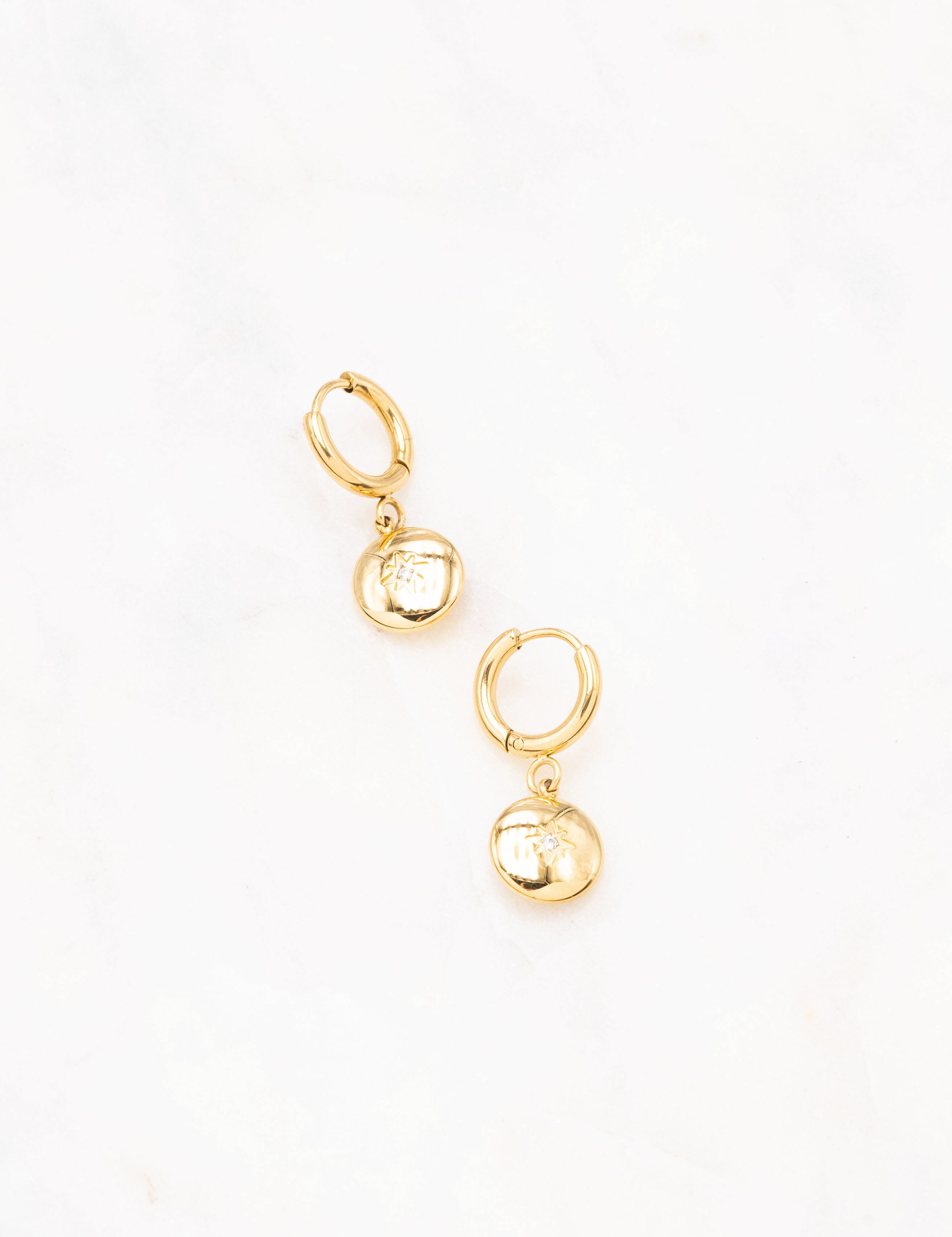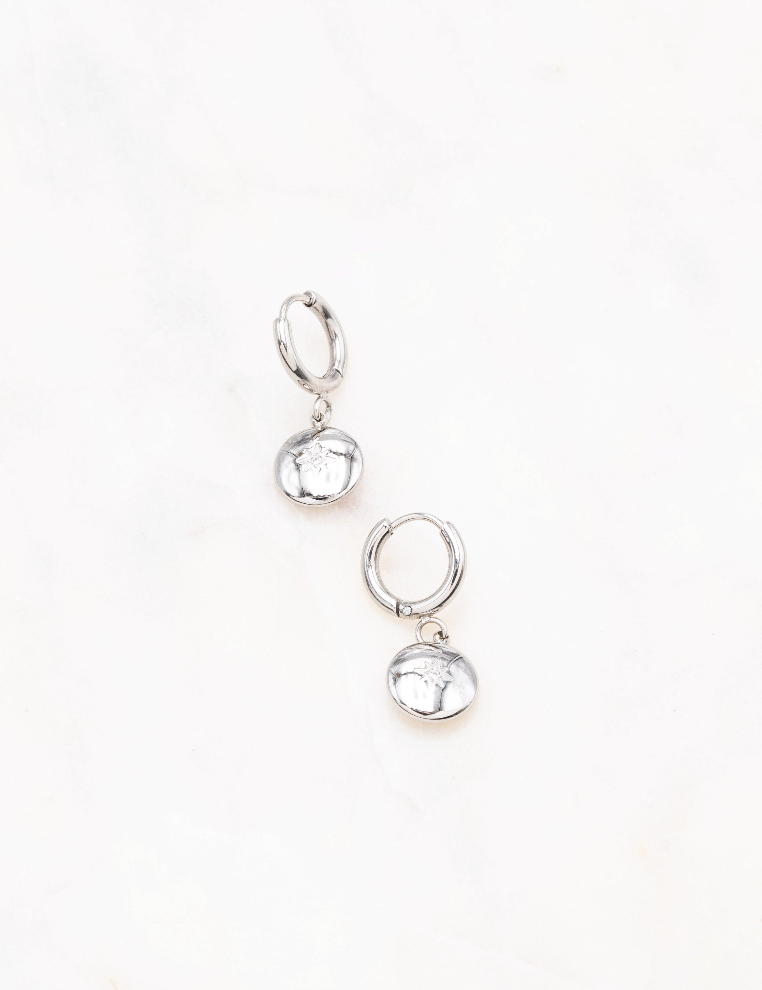 Boucles d'oreilles type créoles composées d'une pièce ronde ornée d'un motif étoilé et d'un strass.