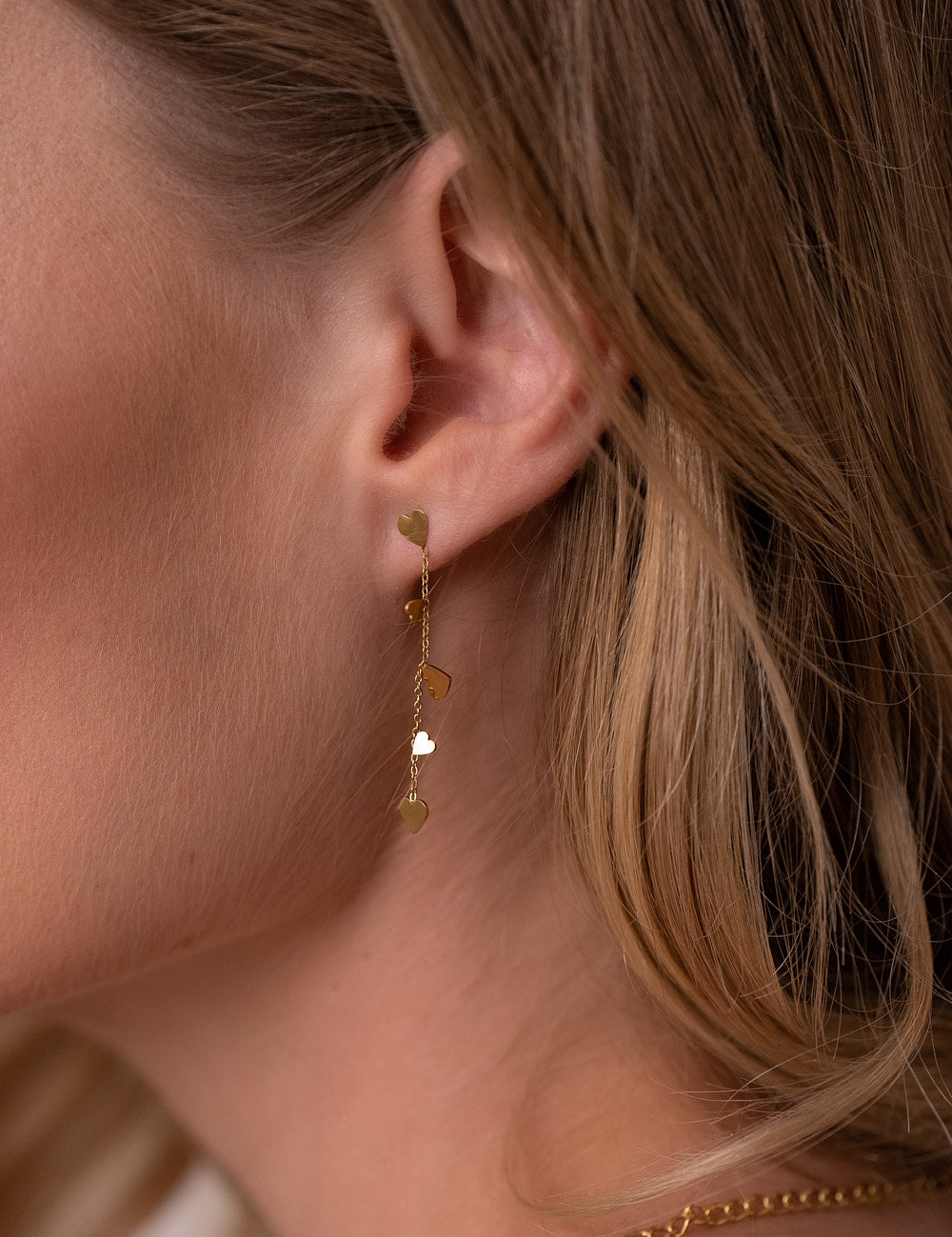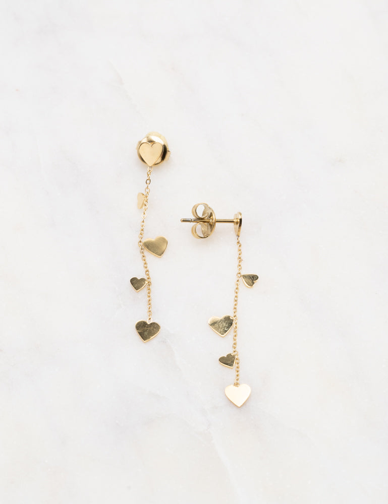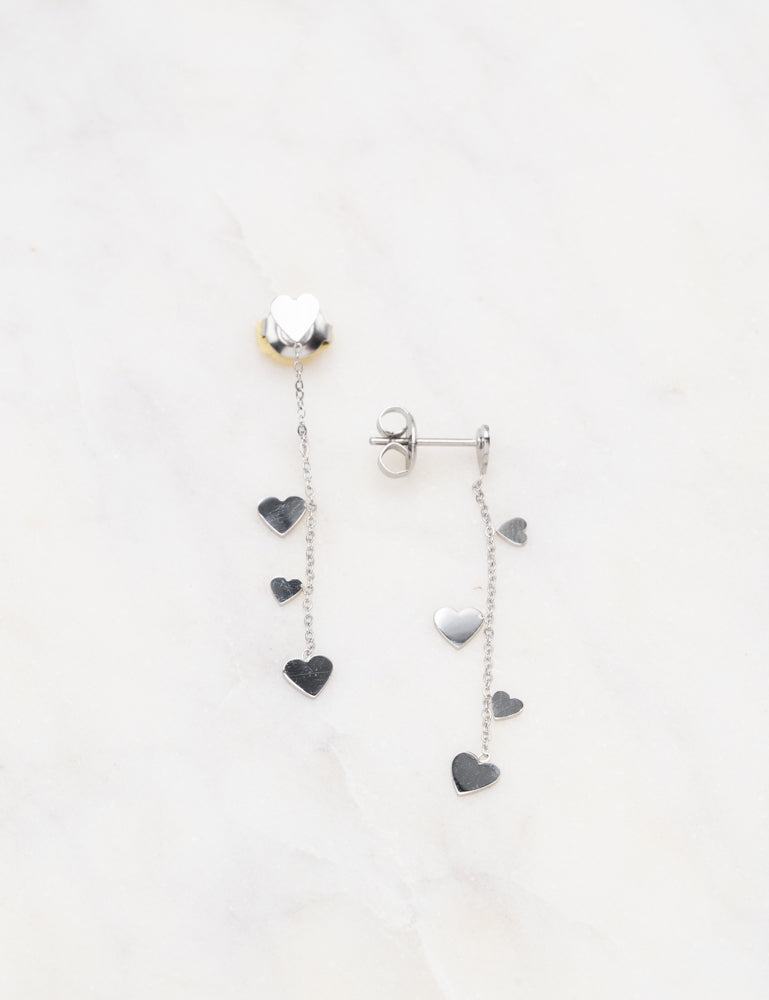 Boucles d'oreilles pendantes à puce composées de pampilles coeur. Fermoir papillon.