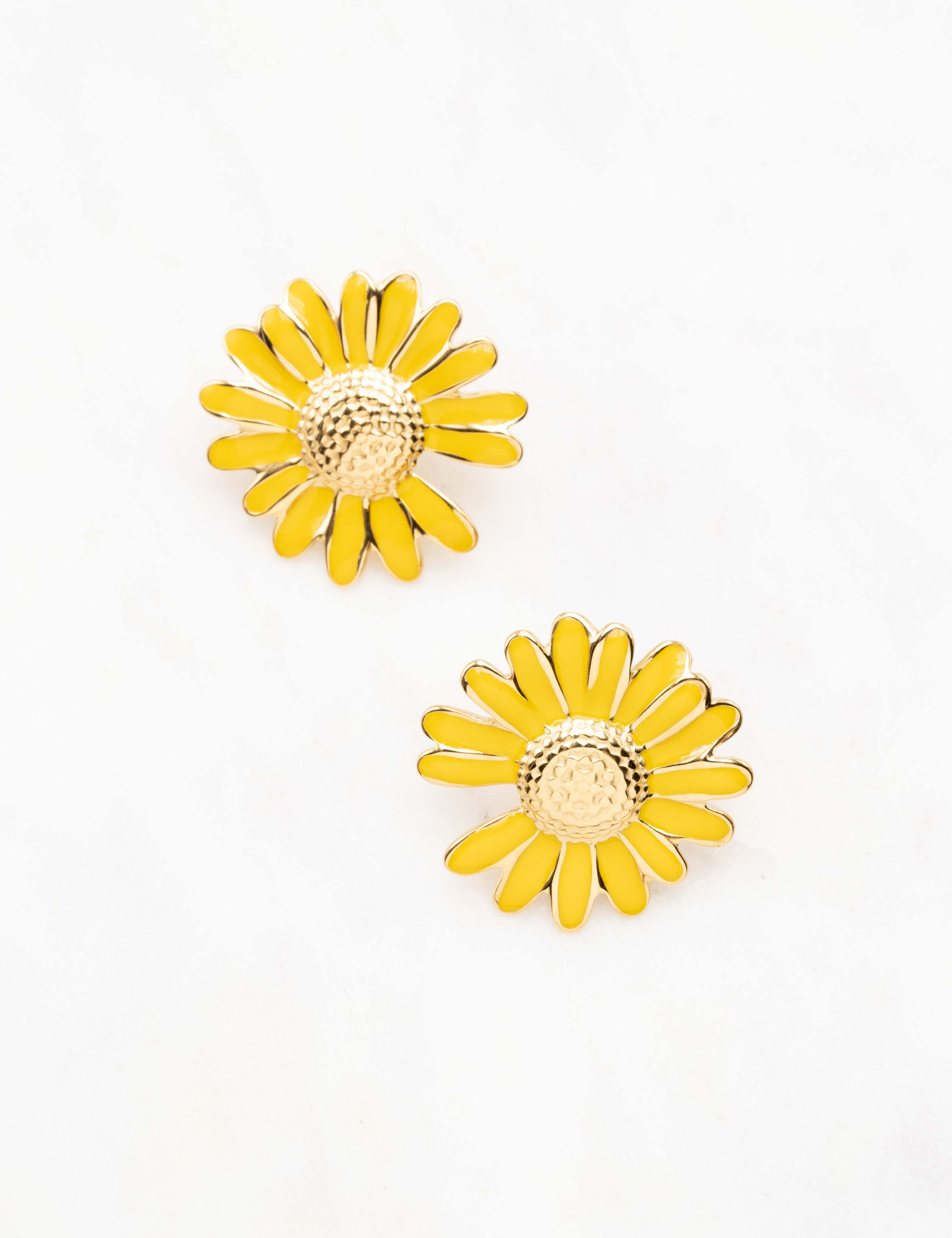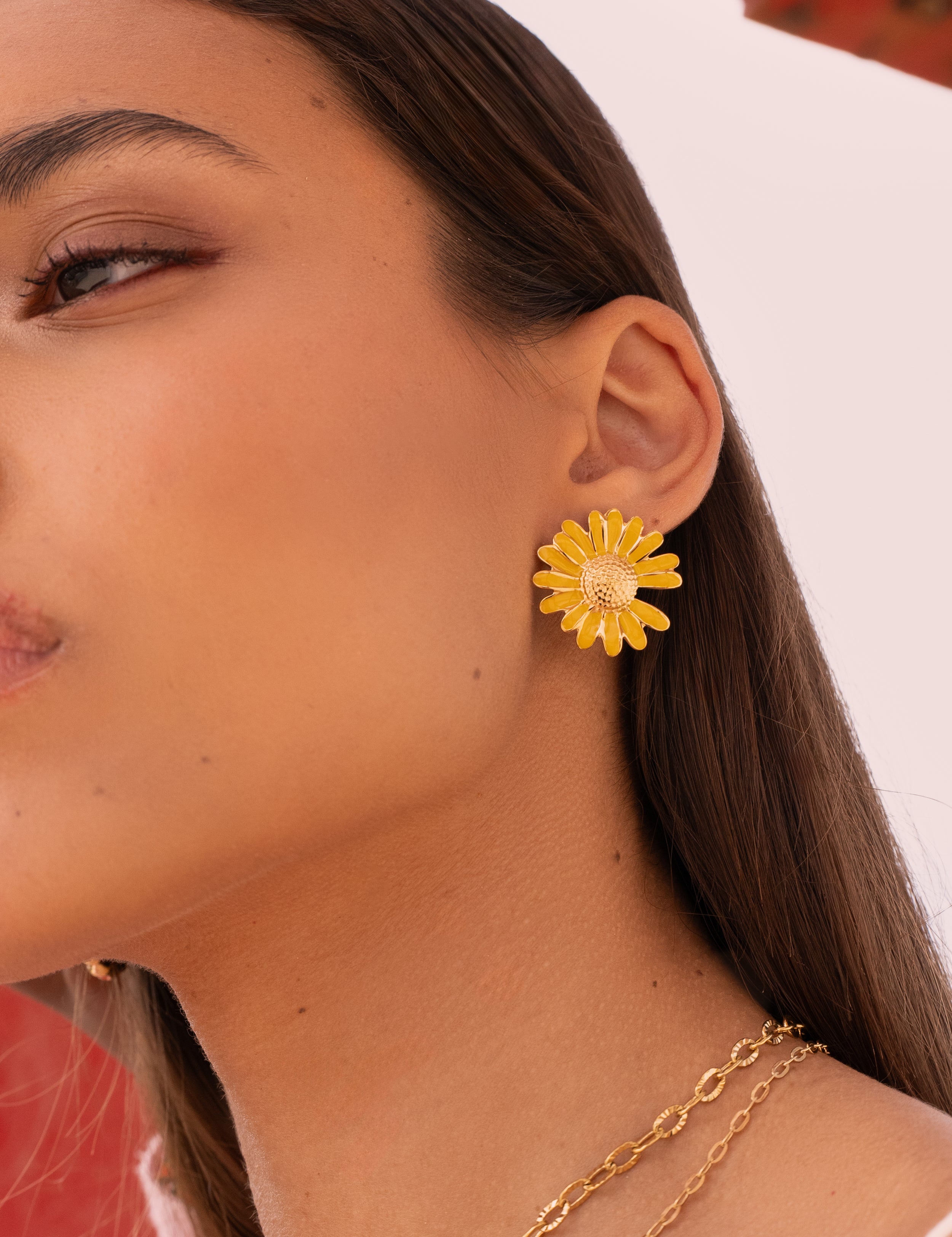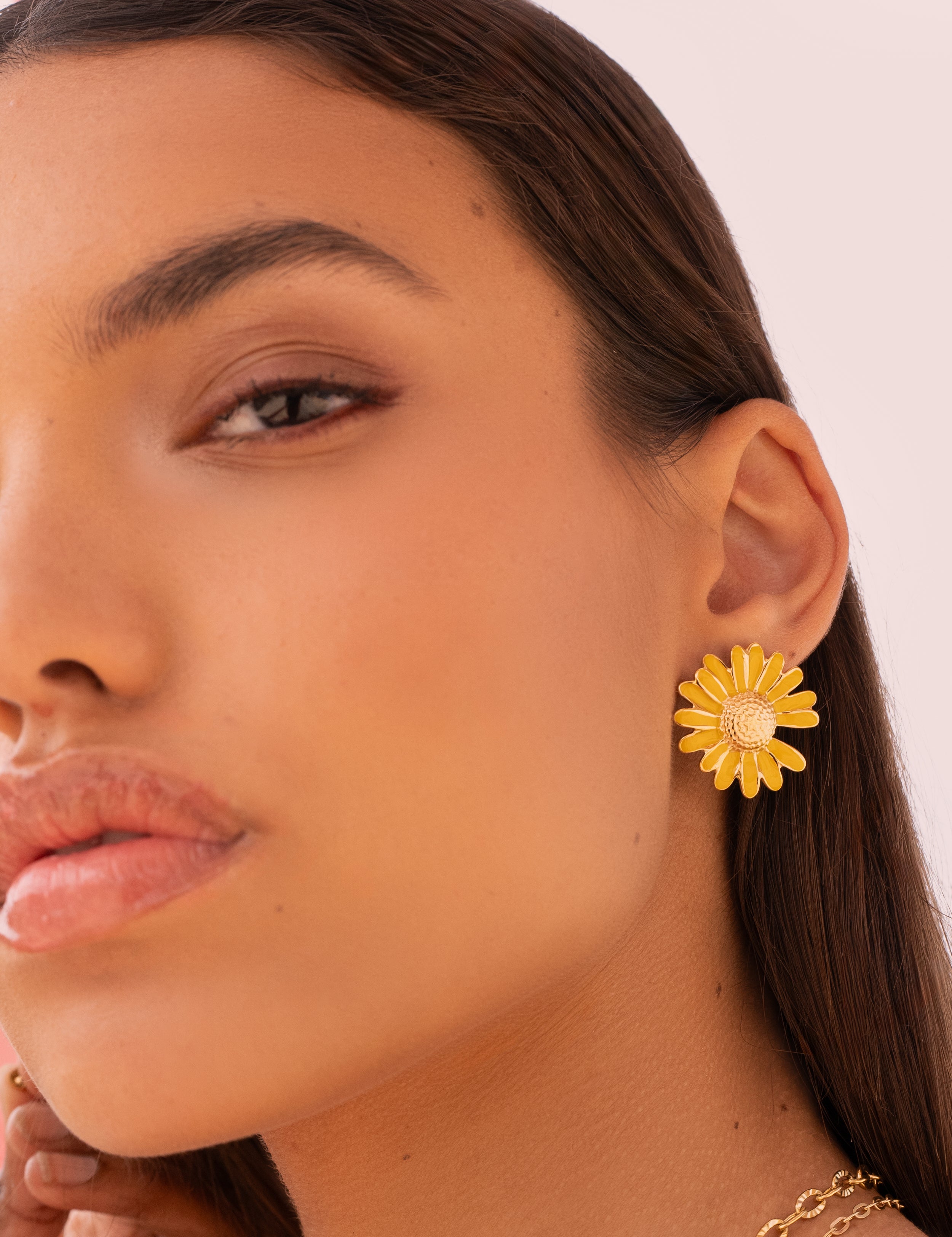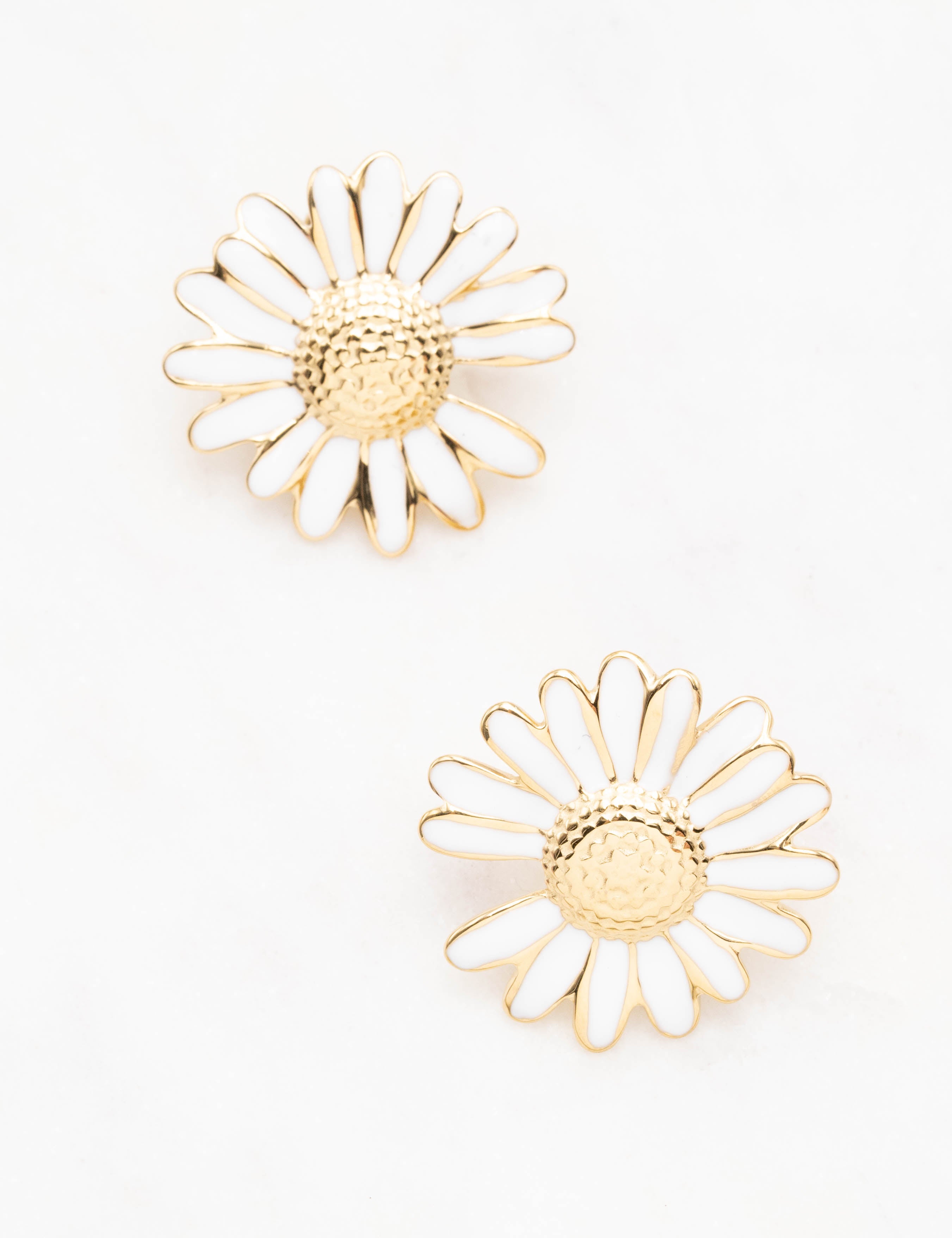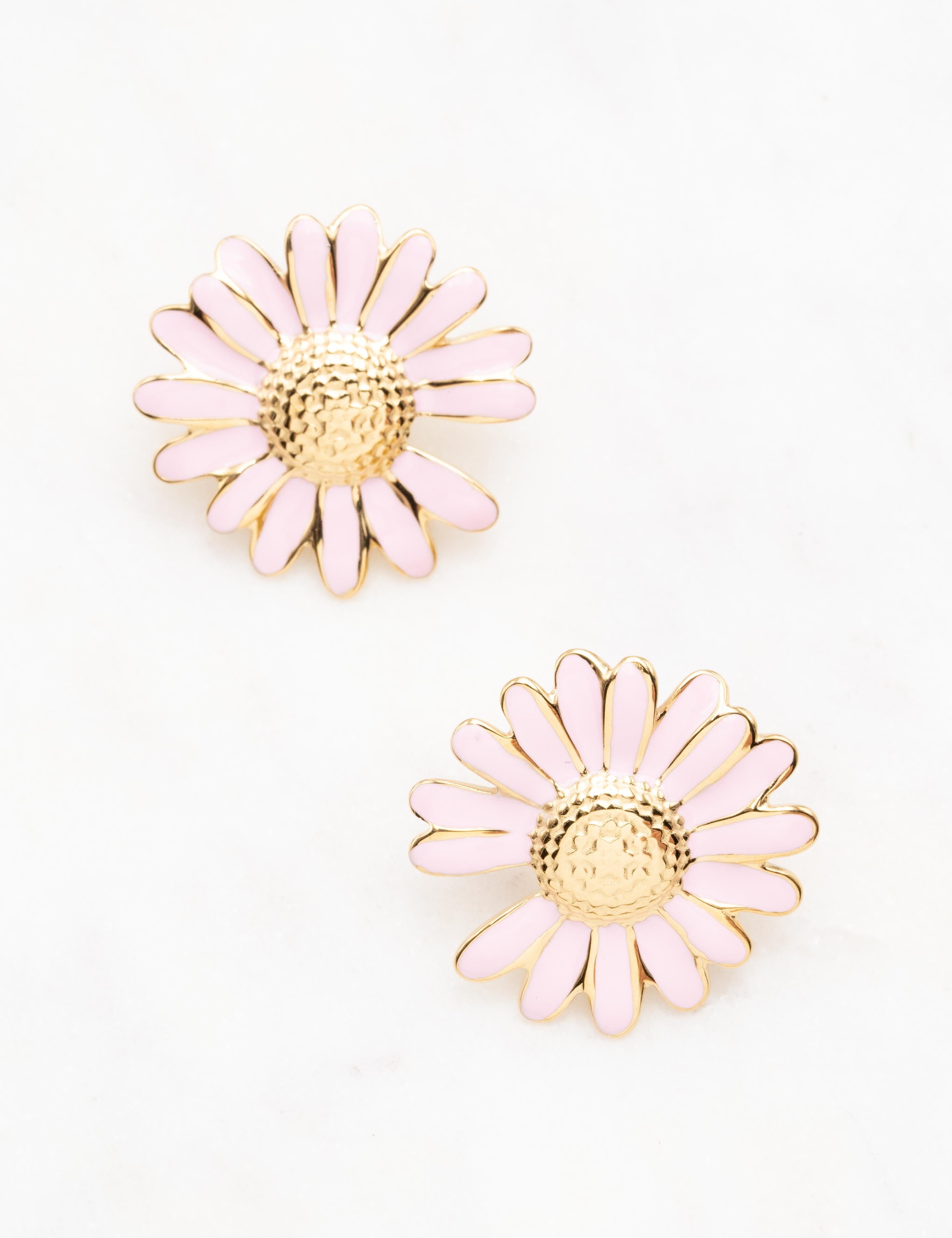 Boucles d'oreilles à puce formant une fleur style marguerite émaillée colorée.