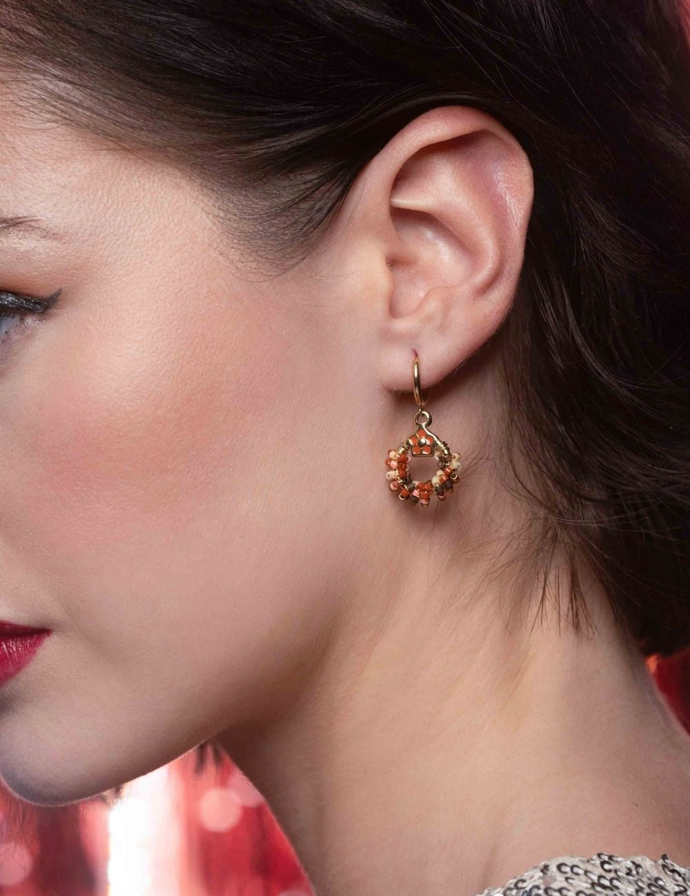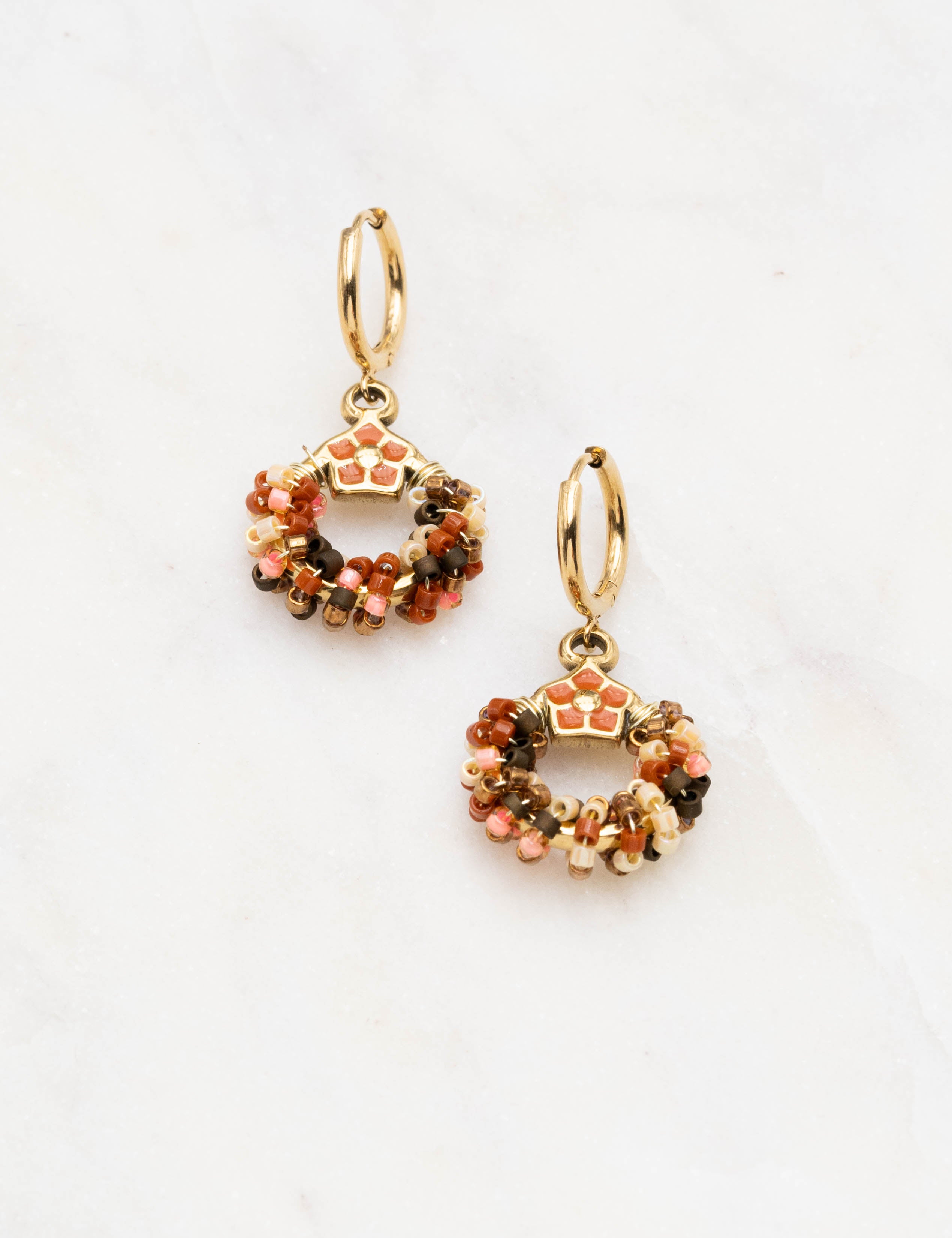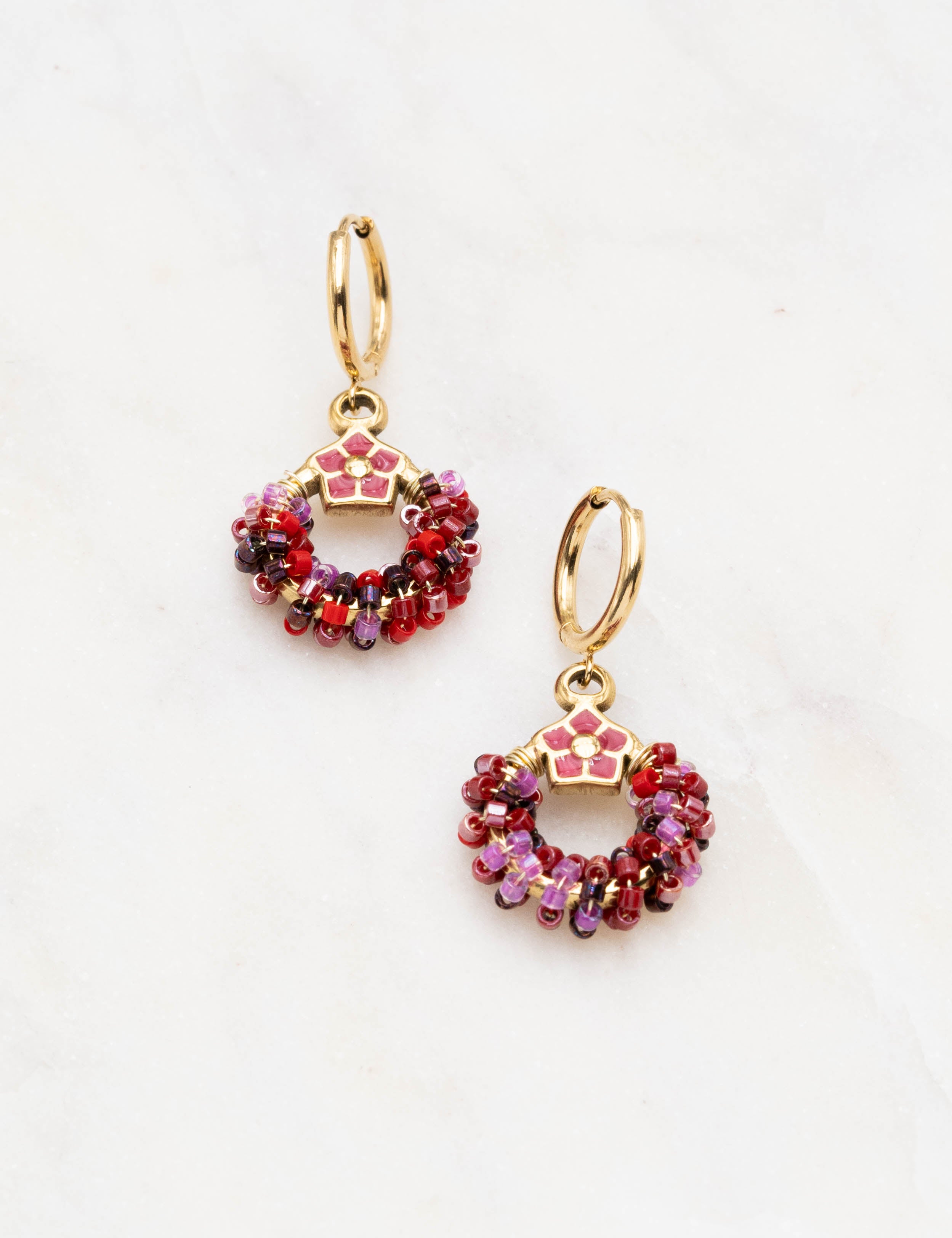 Boucles d'oreilles type créoles à puce de composées d'un anneau orné de perles colorées en pate de verre et d'une petite pièce style floral émaillée.