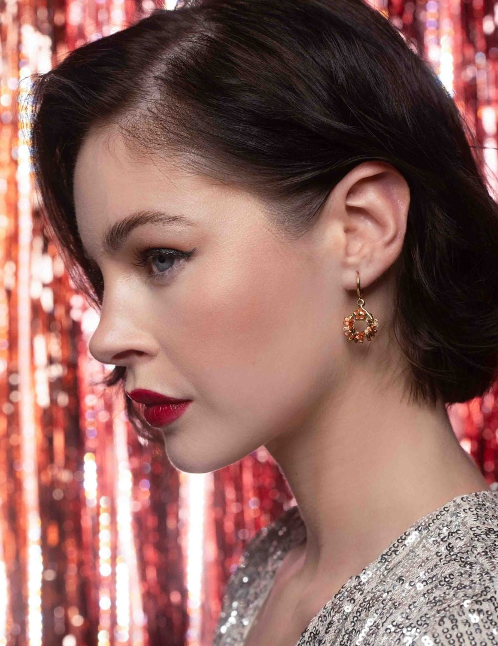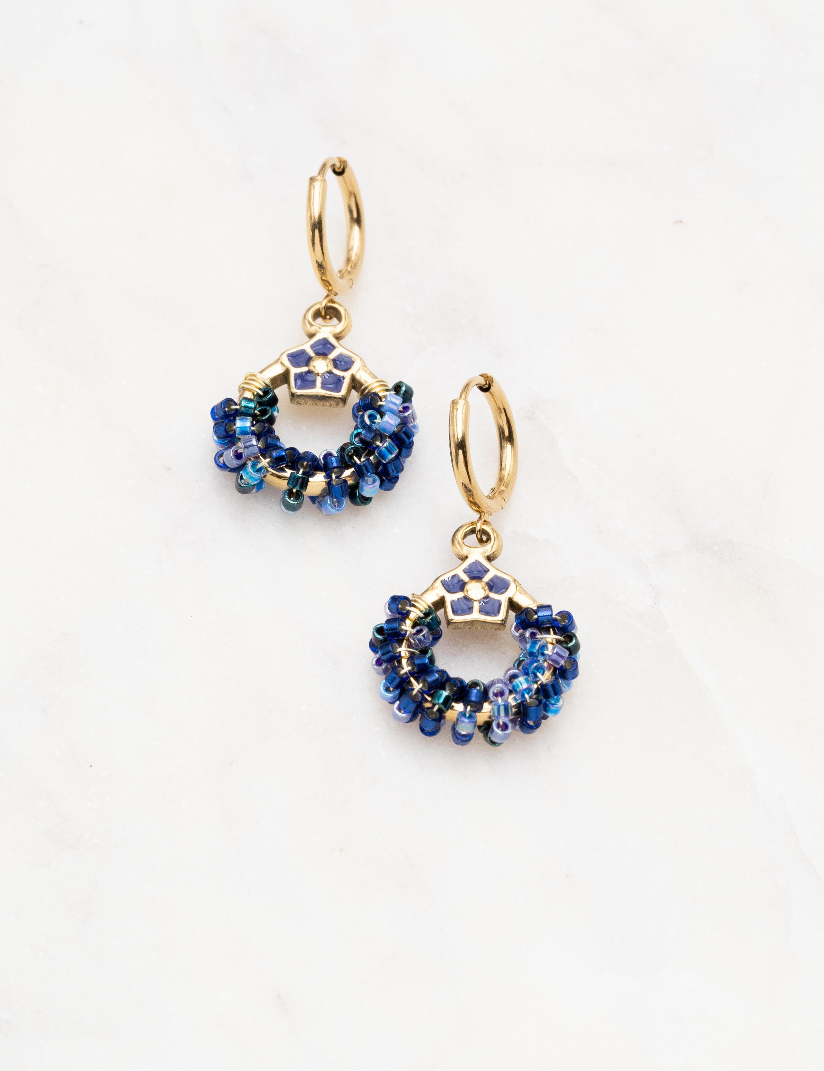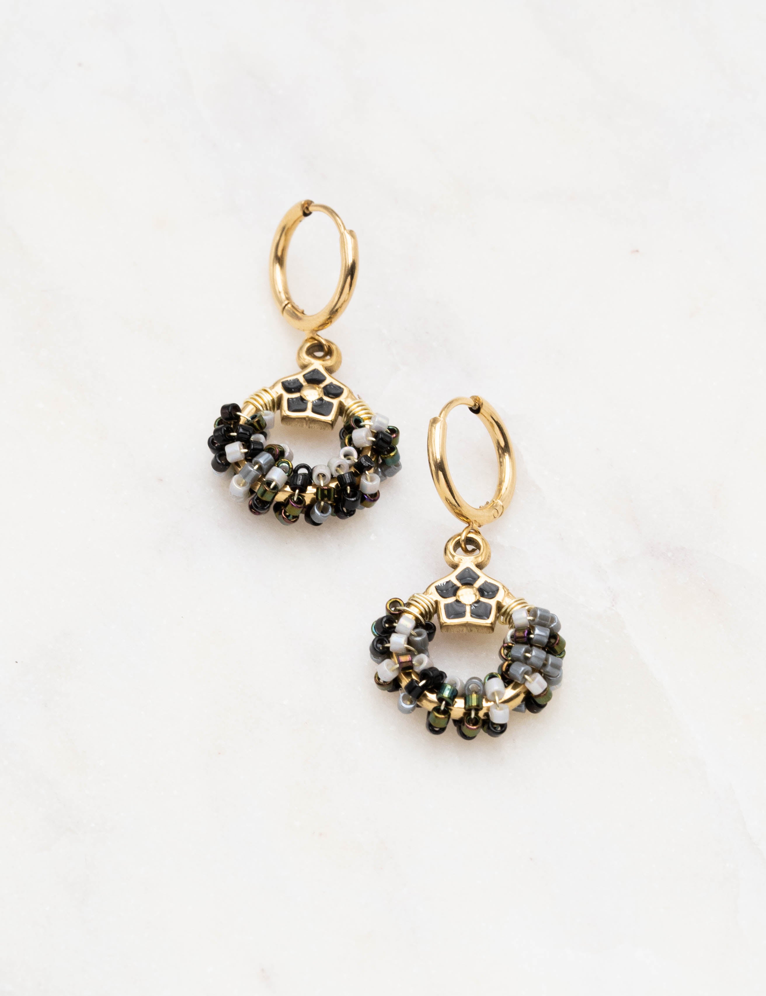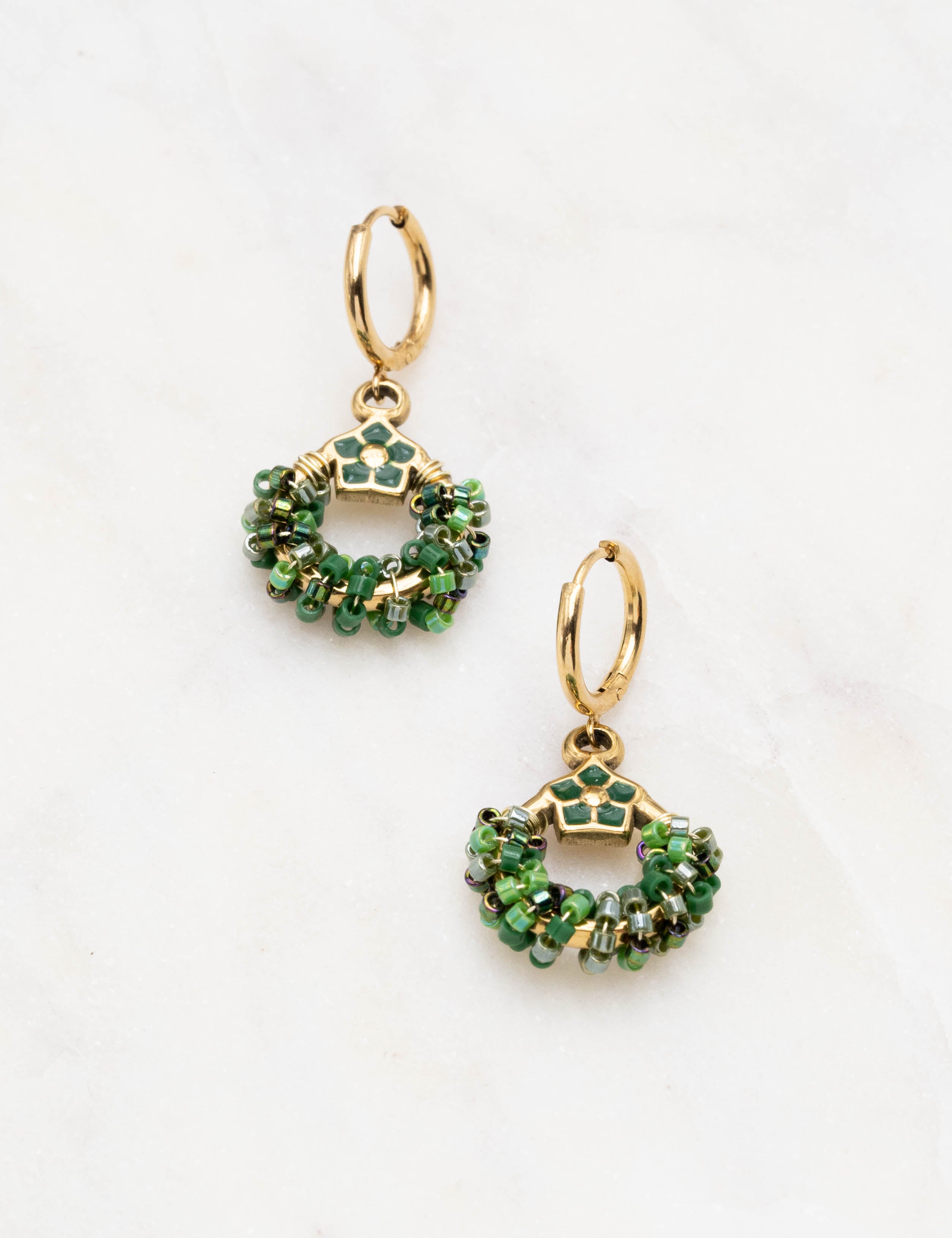 Boucles d'oreilles type créoles à puce de composées d'un anneau orné de perles colorées en pate de verre et d'une petite pièce style floral émaillée.