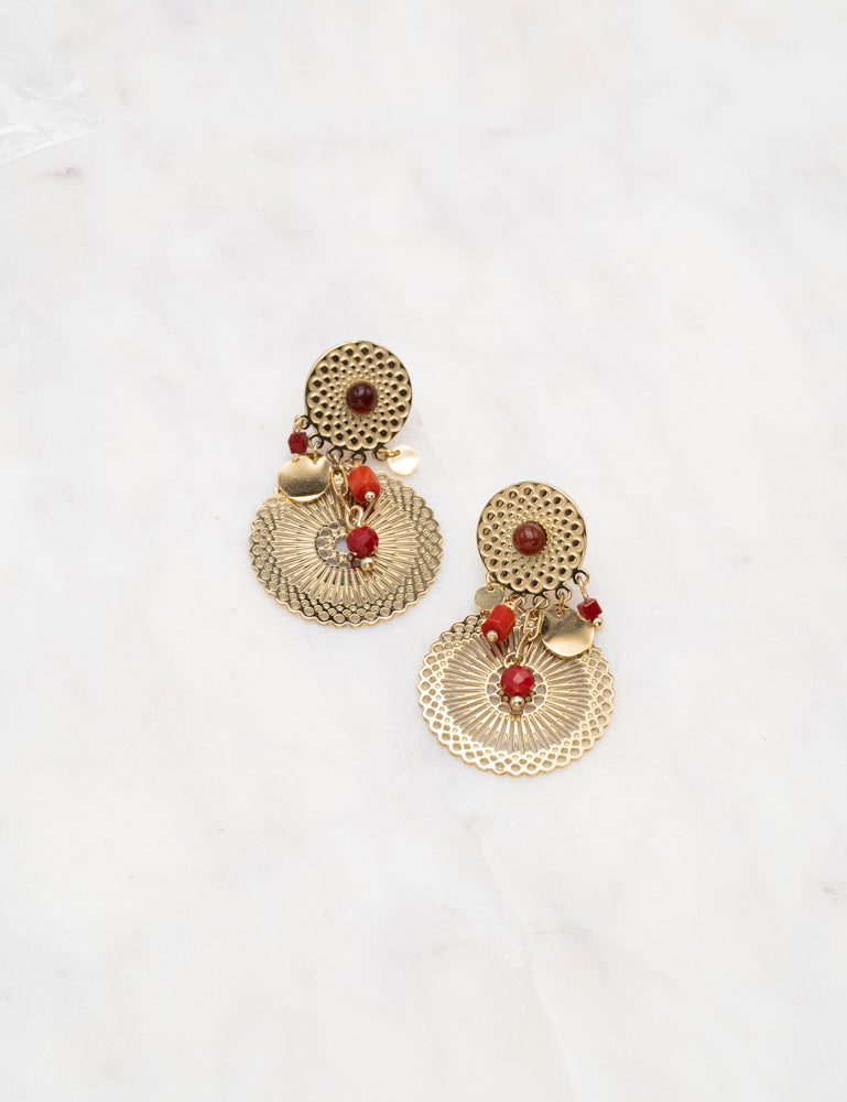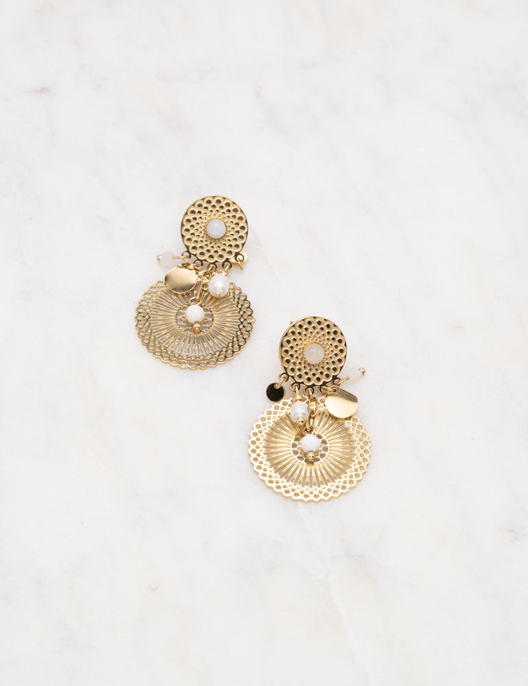 Boucles d'oreilles à puce graphiques composées d'une pièce au style rosacé ornée d'une pierre naturelle et d'une pièce pendante stylisée avec des pampilles en pate de verre.