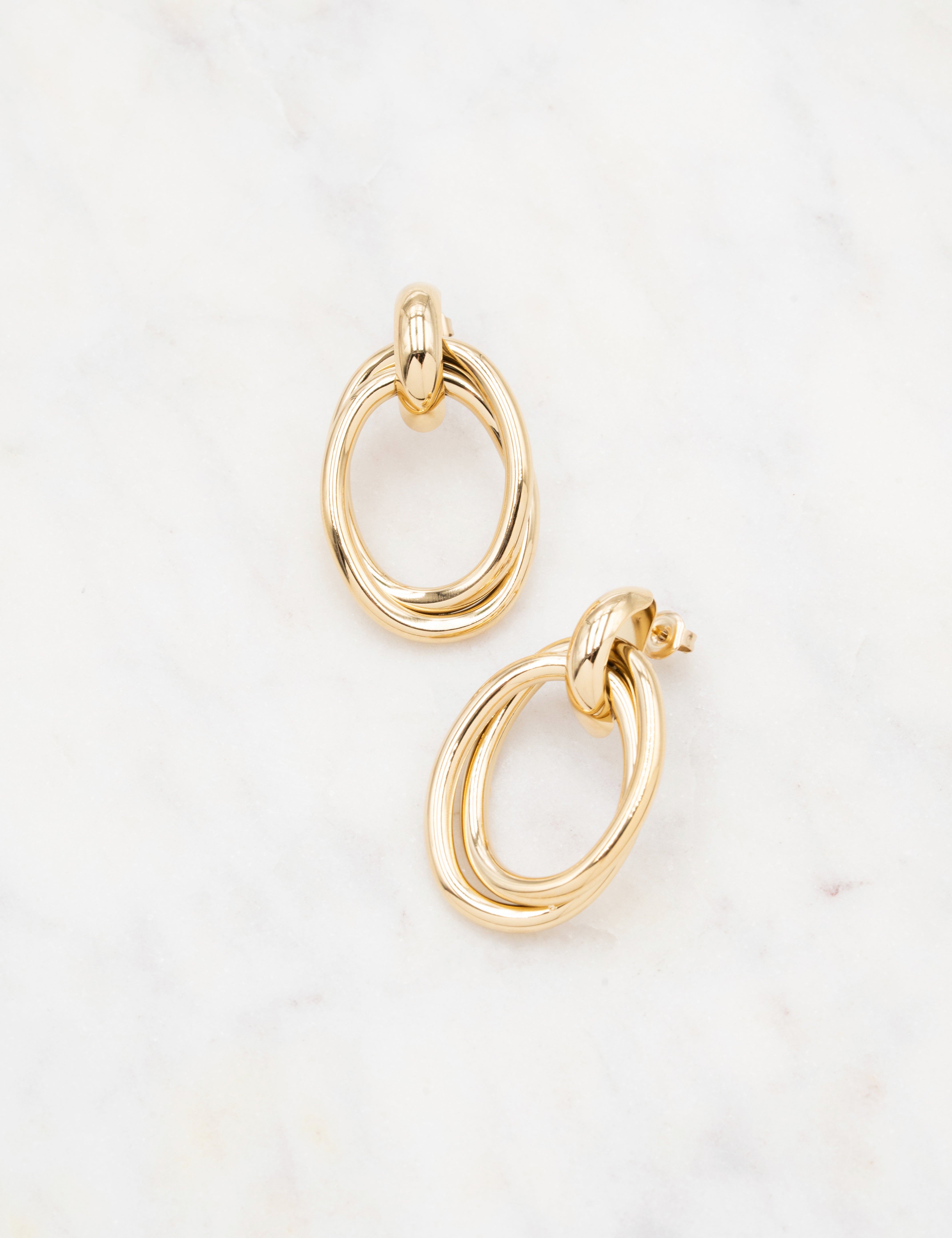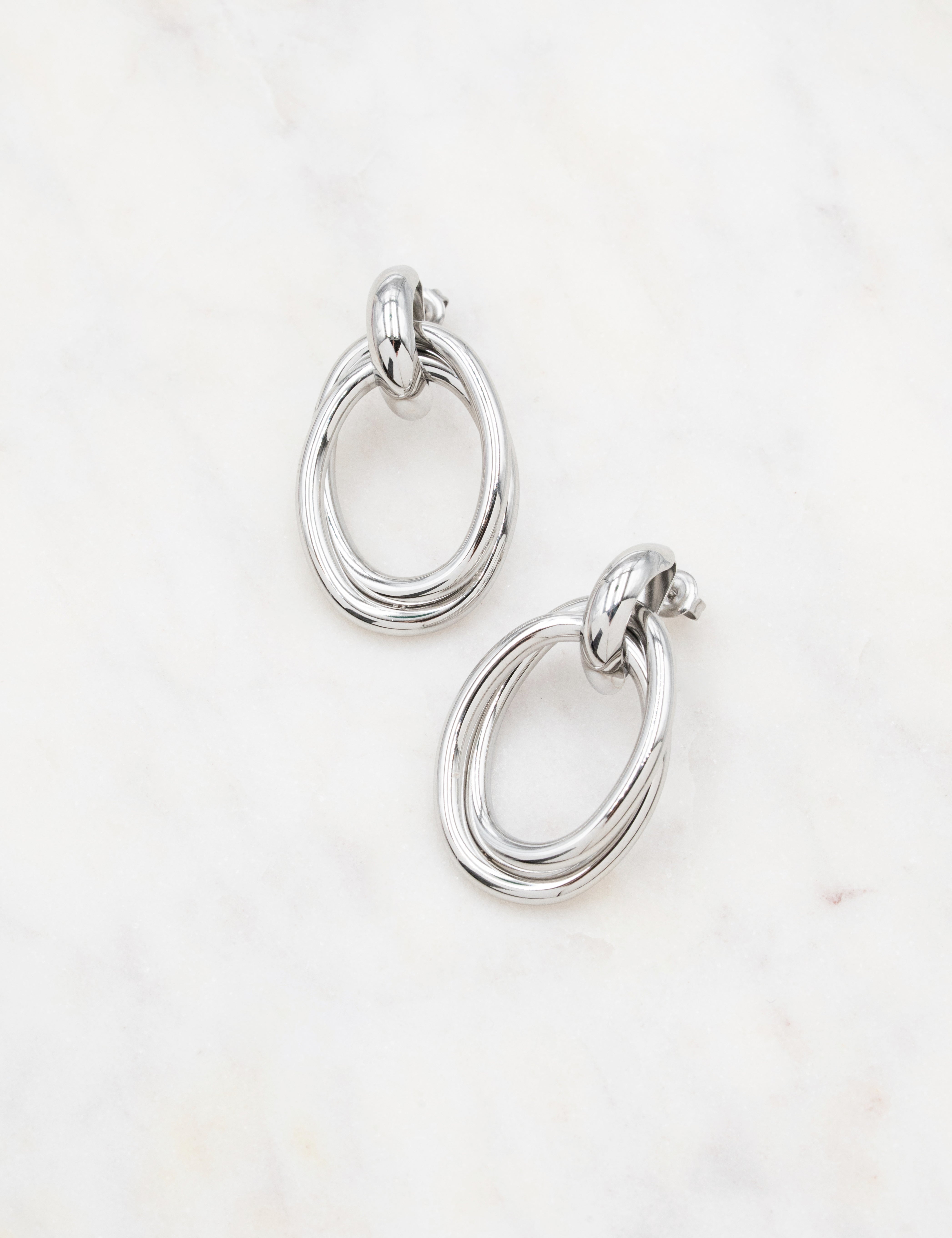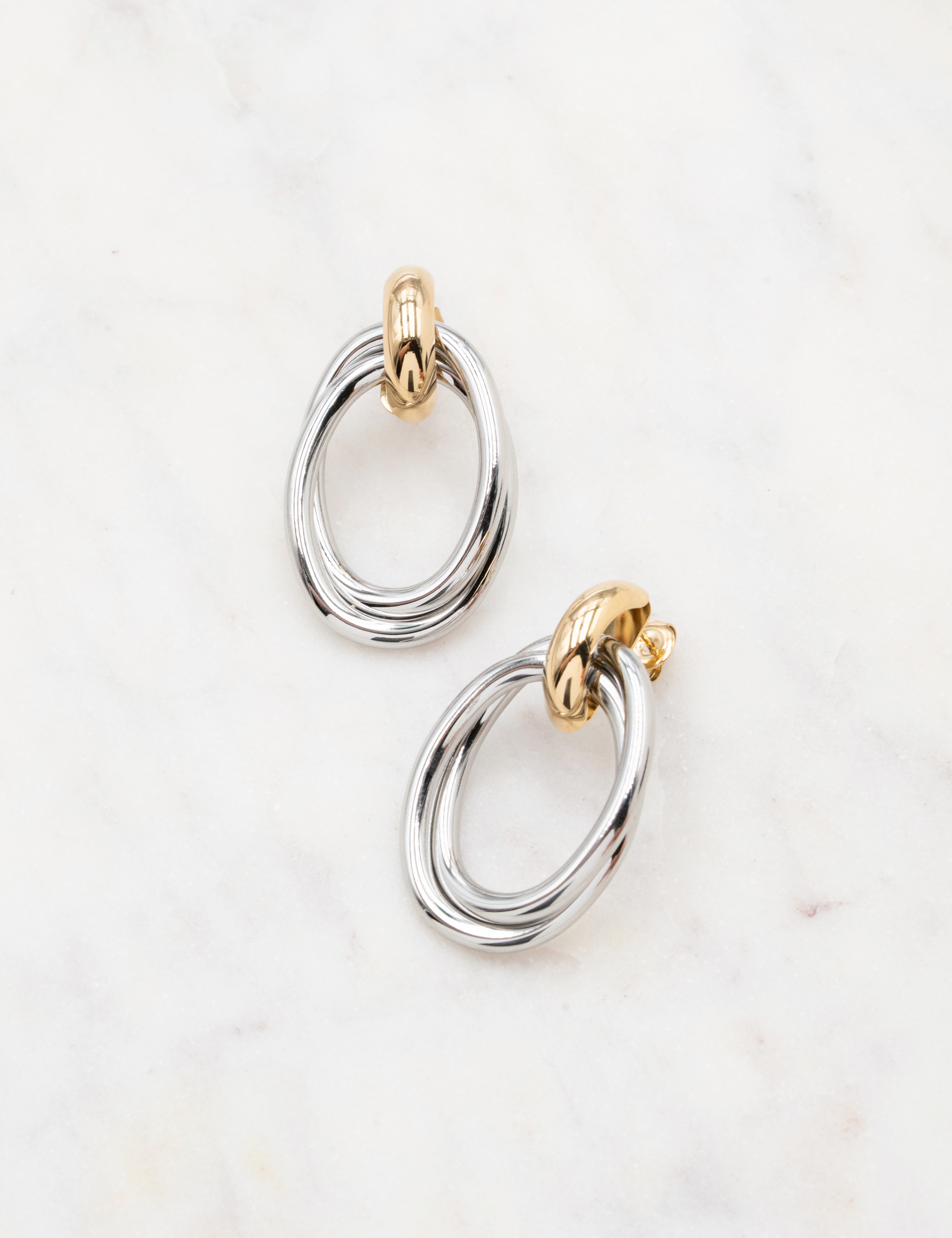 Boucles d'oreilles graphiques à puce composées de deux anneaux ovales entrelacés avec un effet miroir.