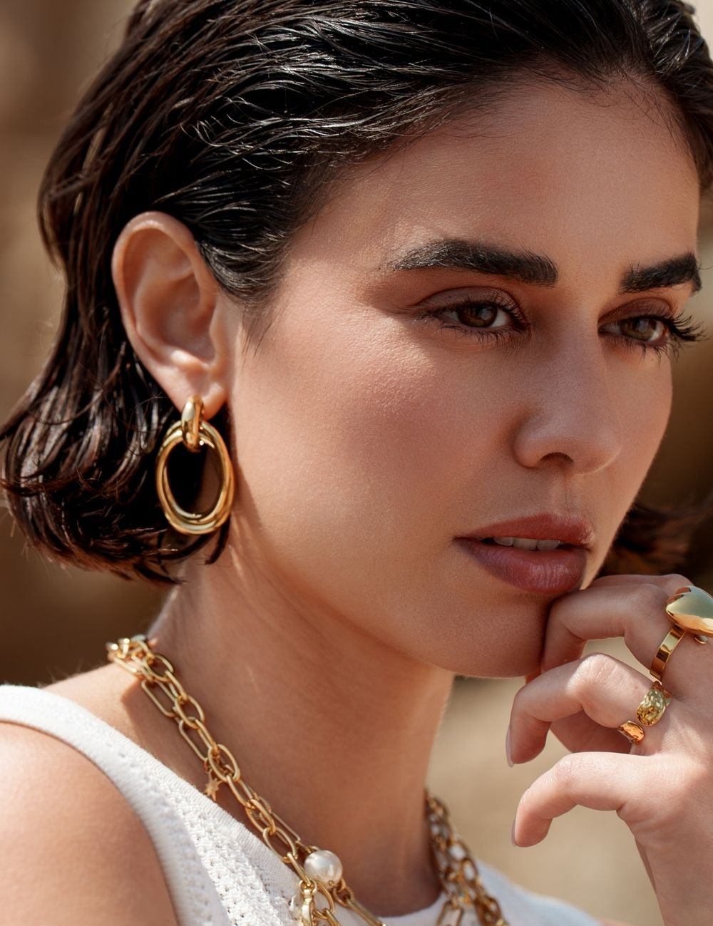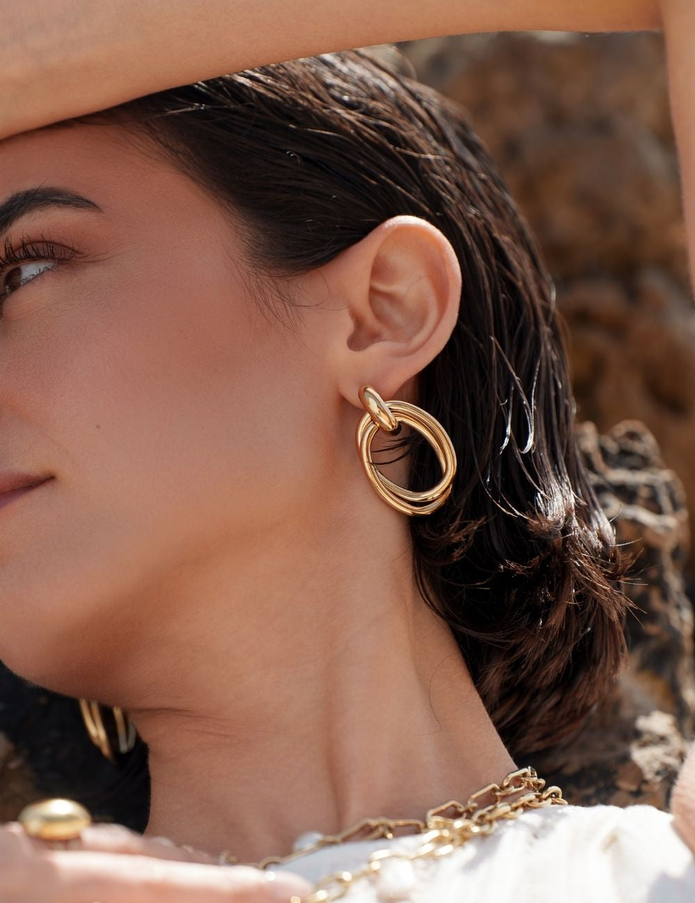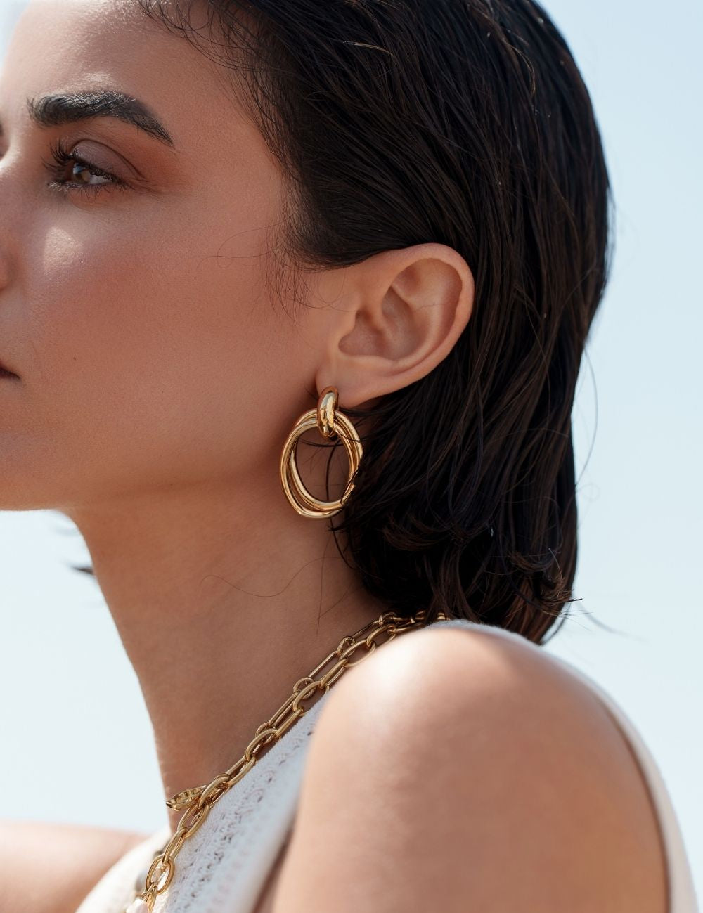 Boucles d'oreilles graphiques à puce composées de deux anneaux ovales entrelacés avec un effet miroir.