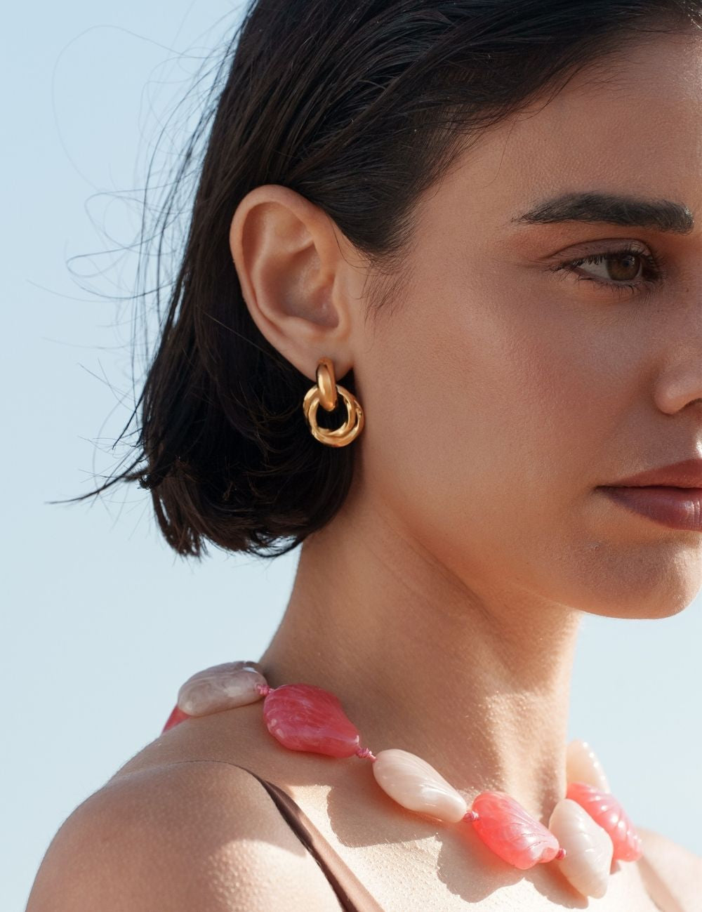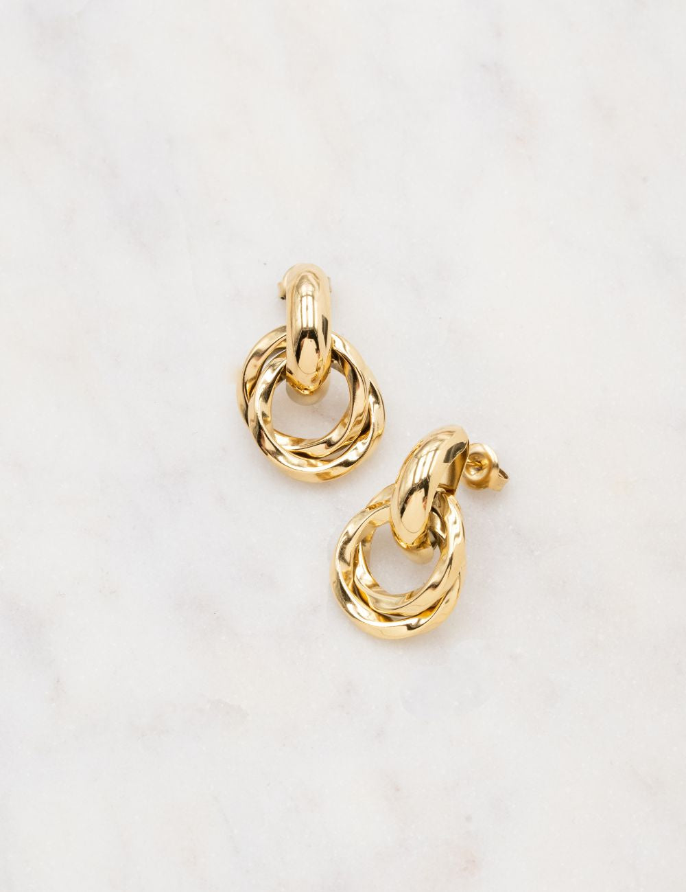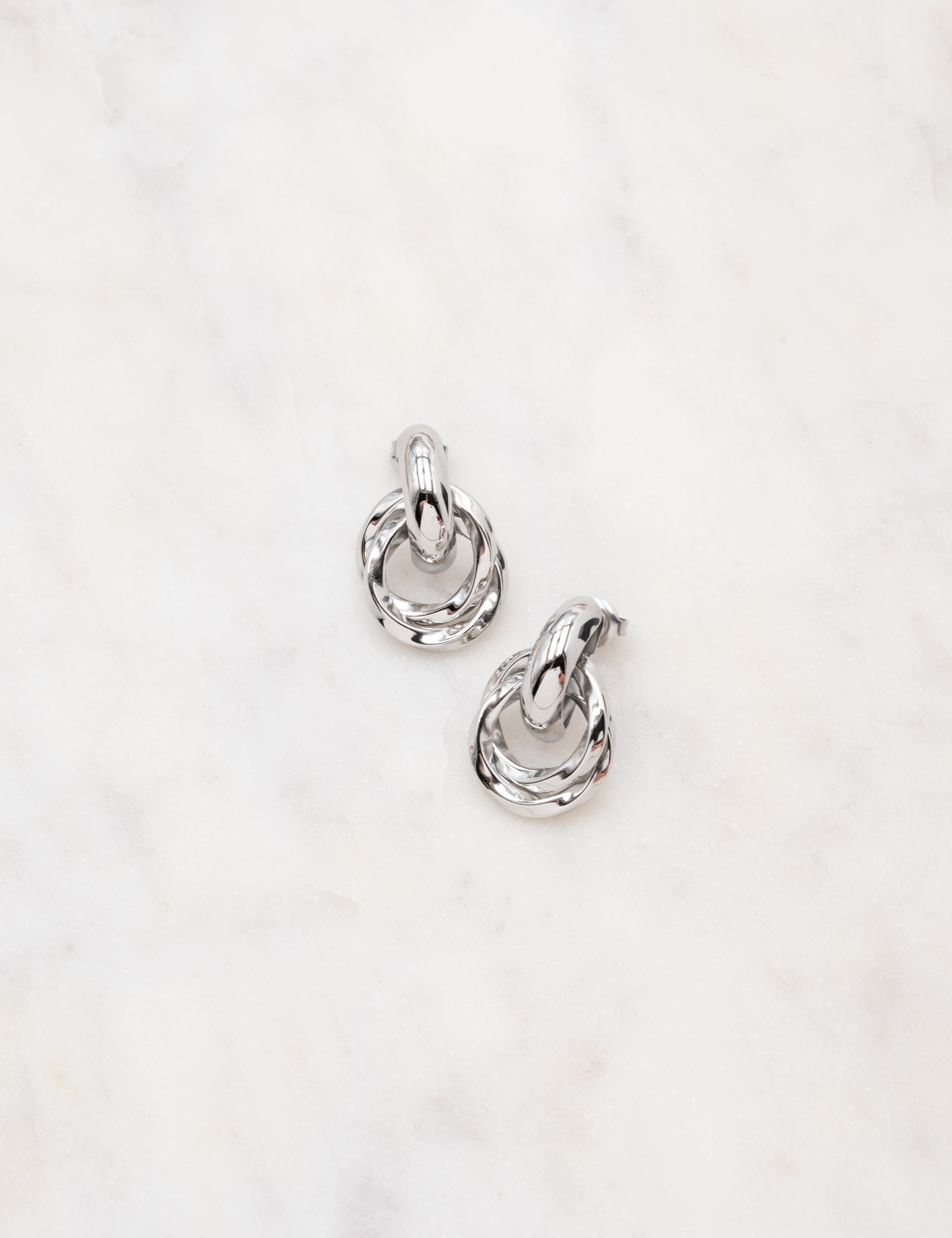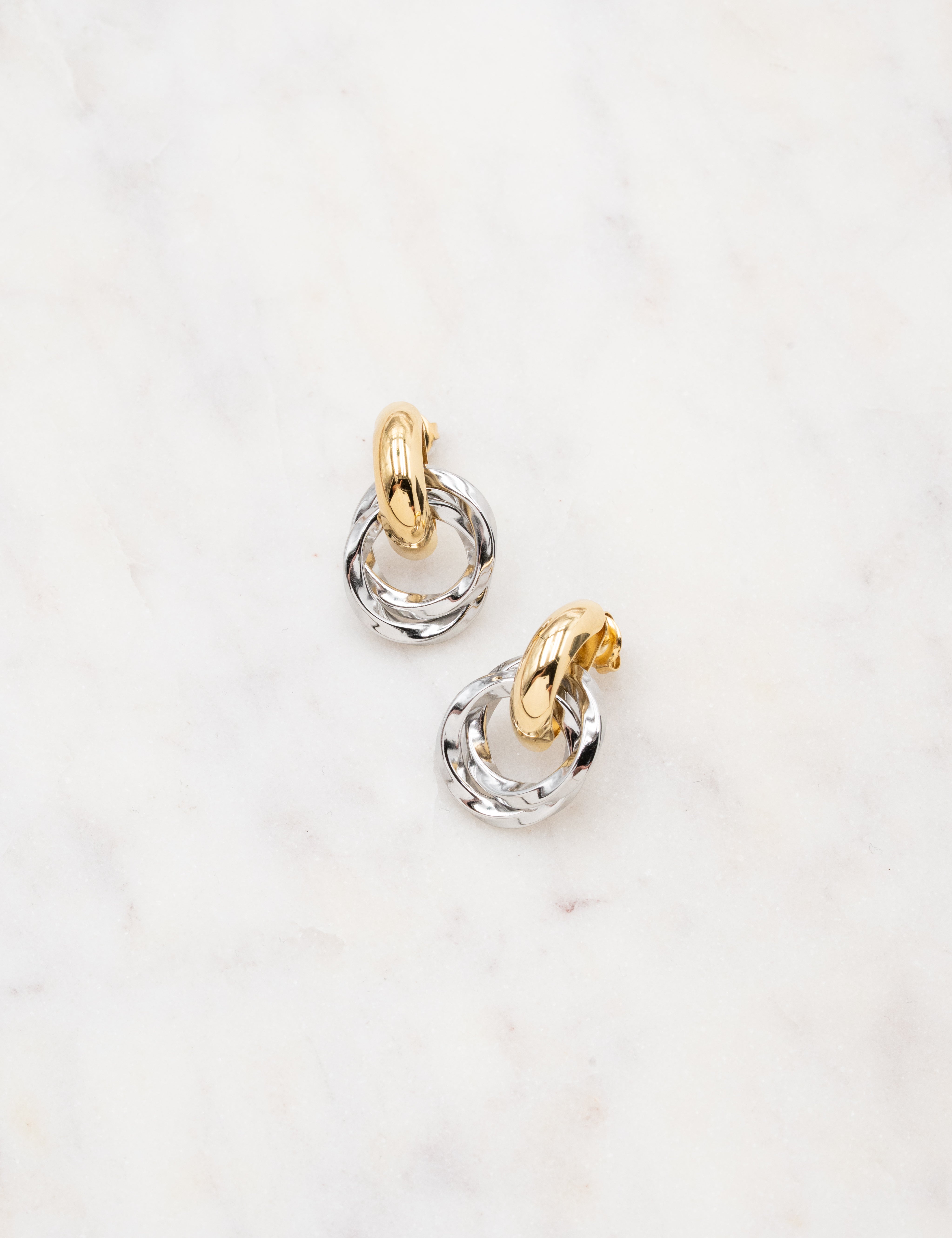 Boucles d'oreilles graphiques à puce composées de deux anneaux rondes entrelacés avec un effet miroir.