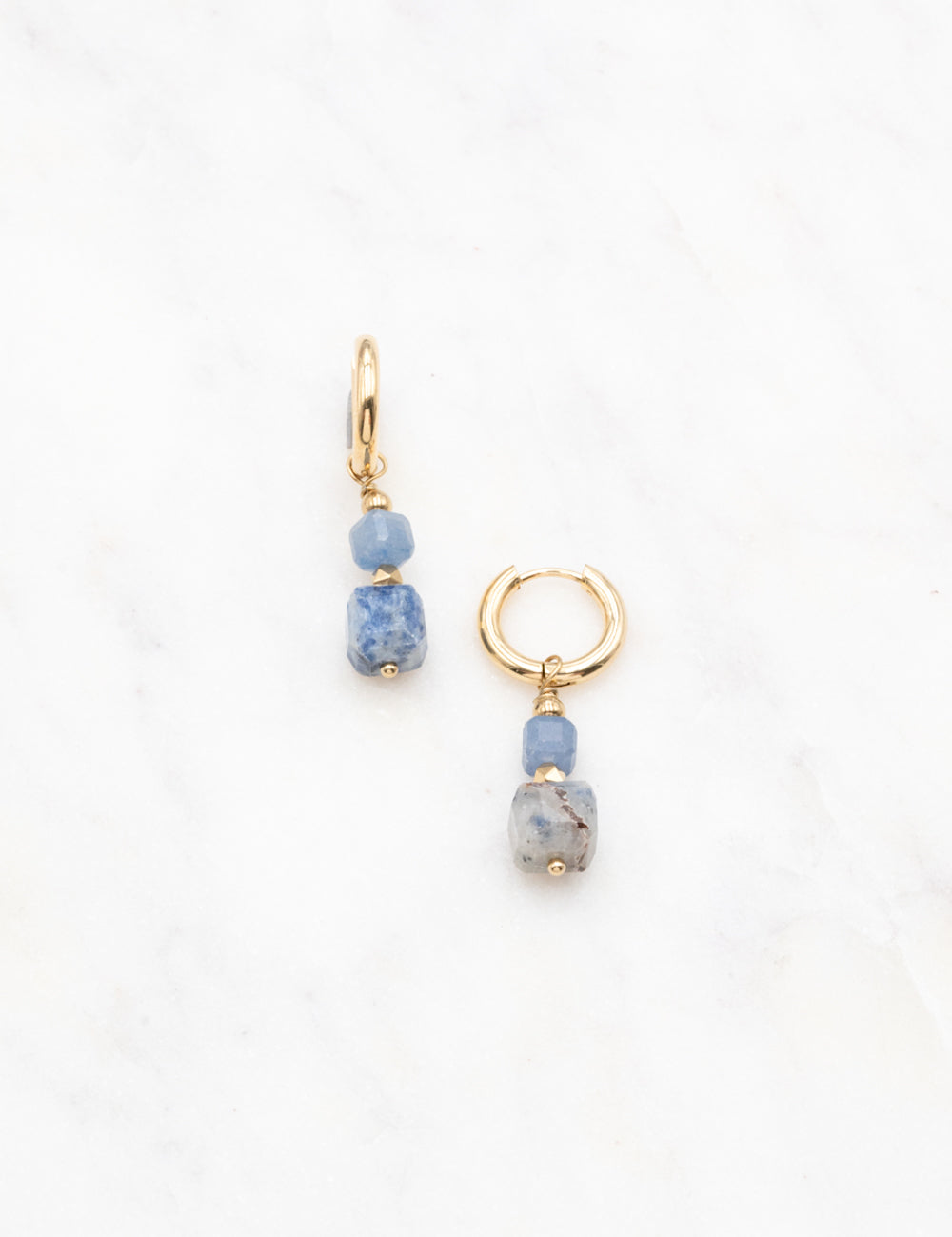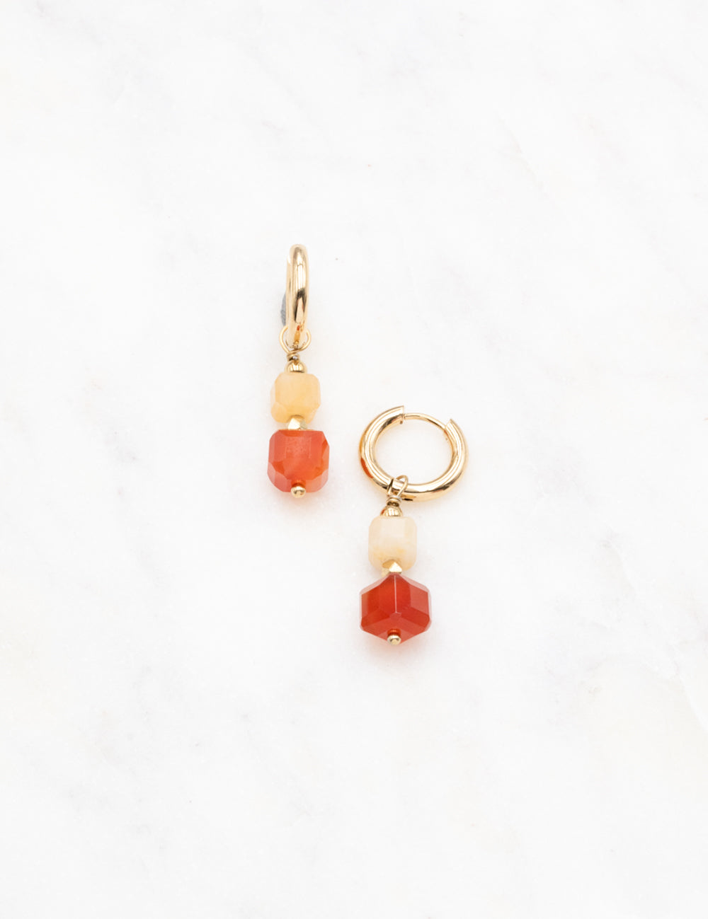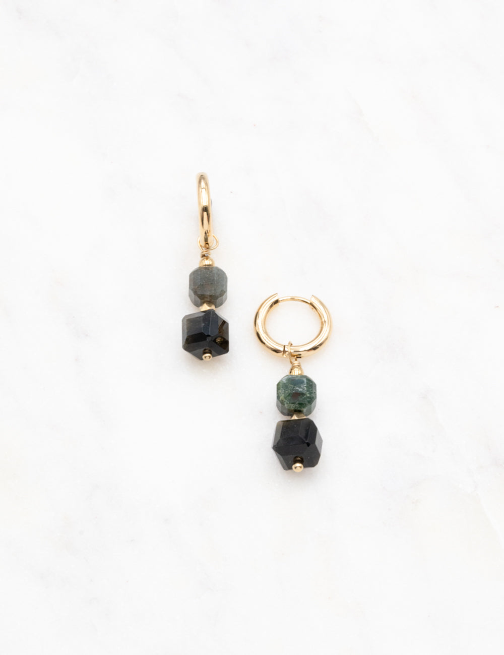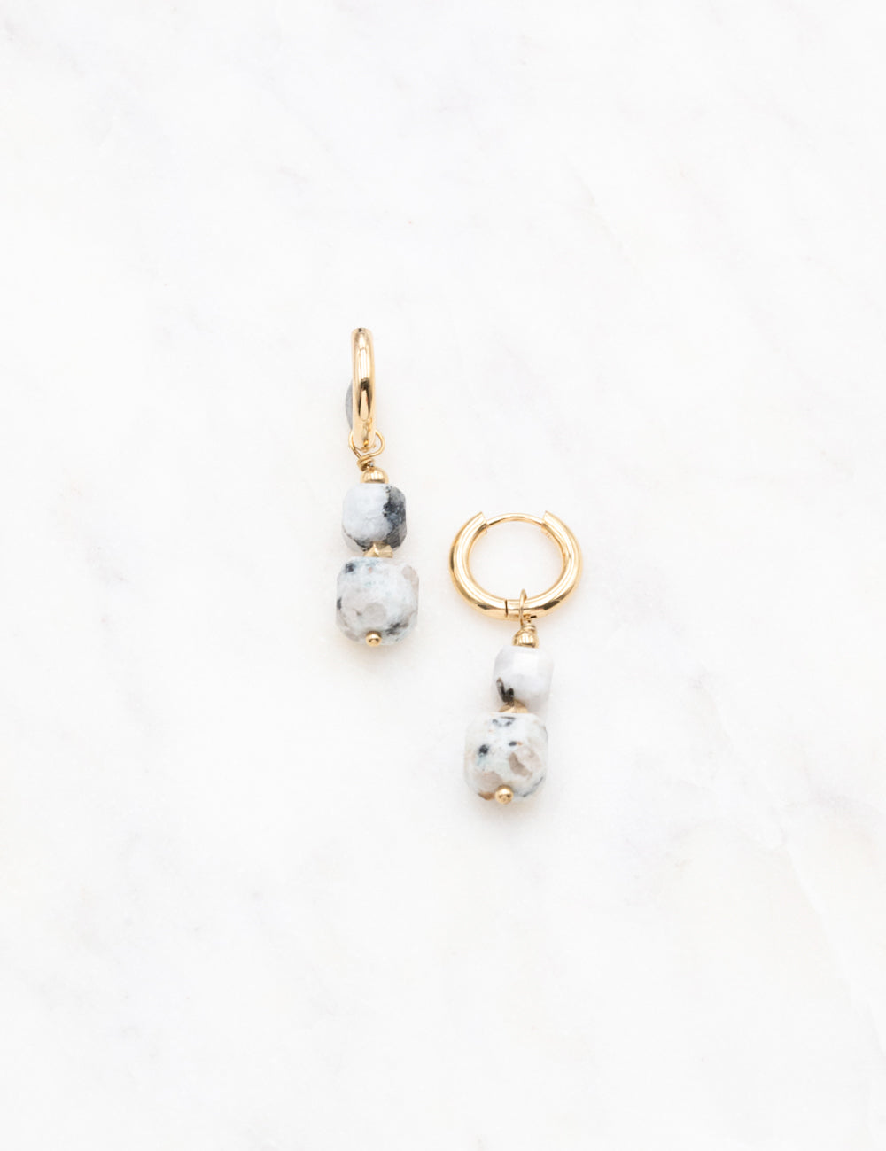 Boucles d'oreilles pendantes de type créoles composées de deux perles en pierres naturelles.
