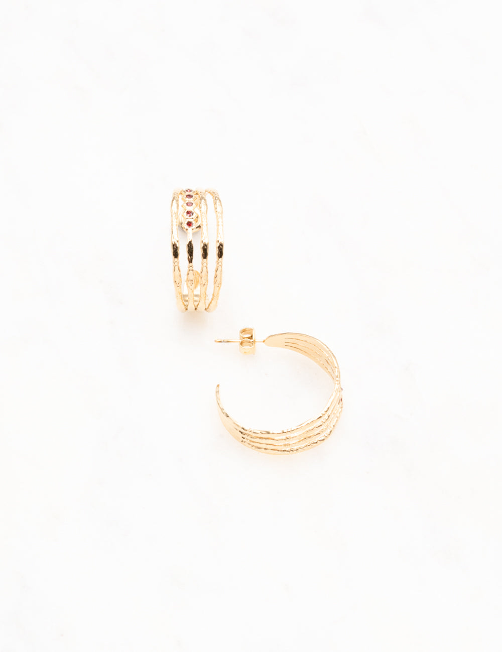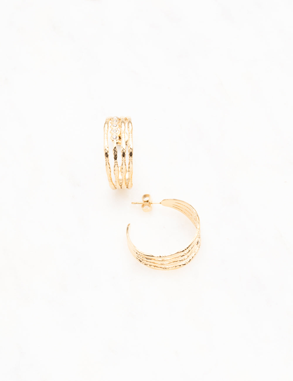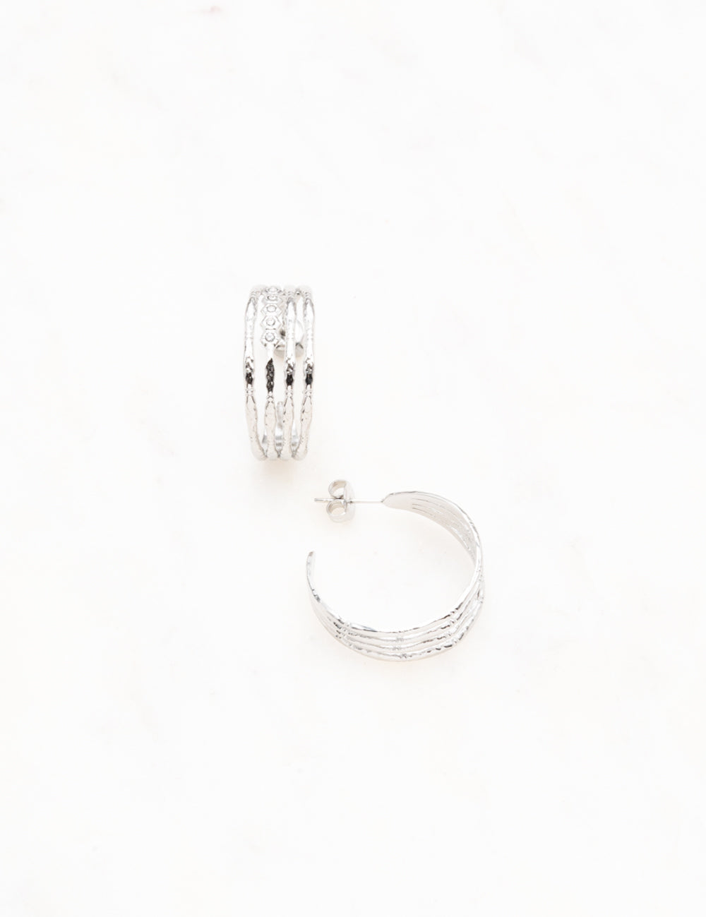 Boucles d'oreilles graphiques de type créoles à puce quatre rangs texturés ornées de 5 strass zirconium.