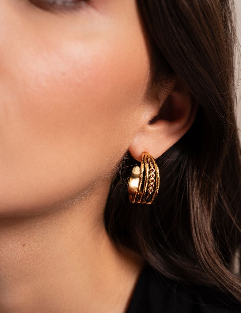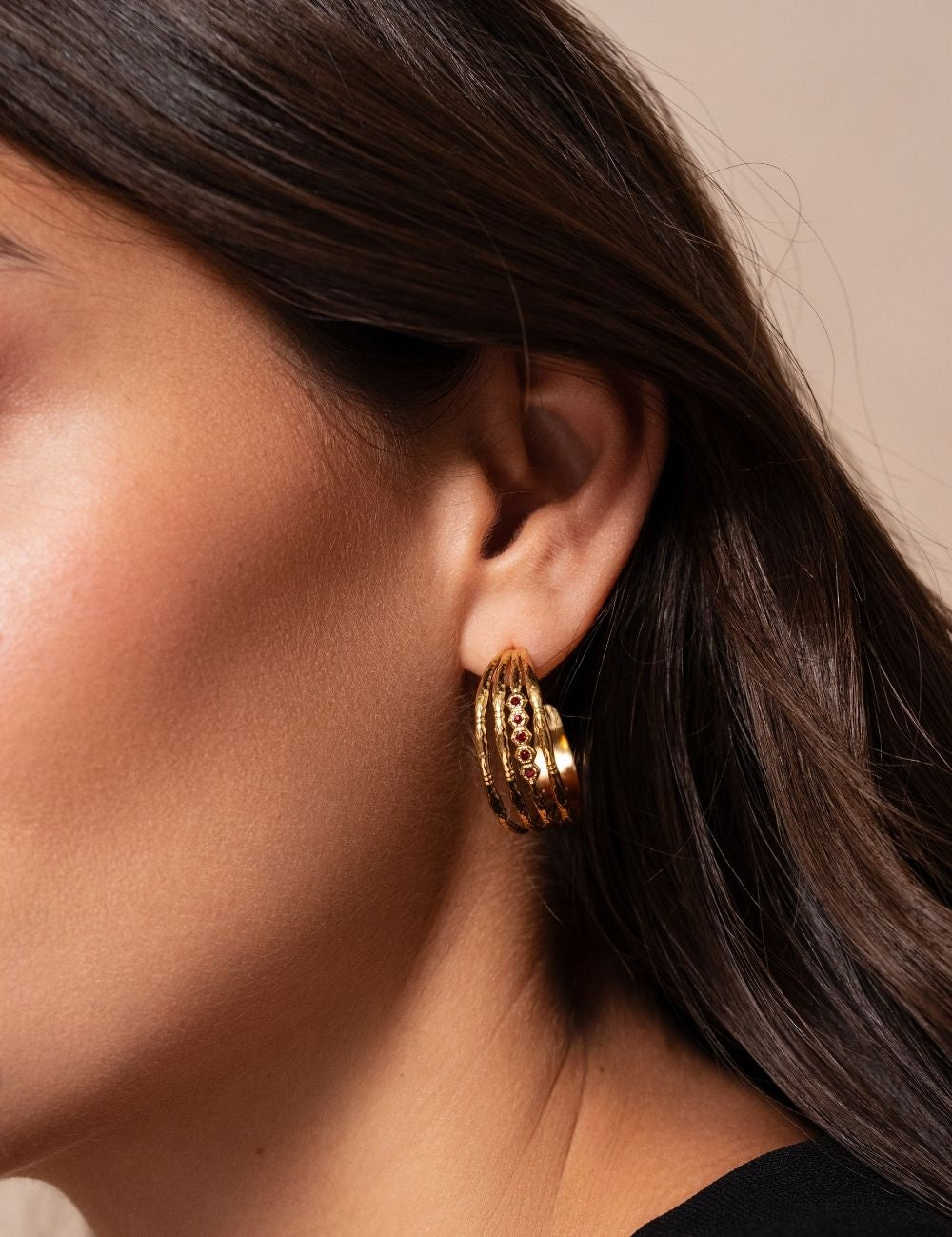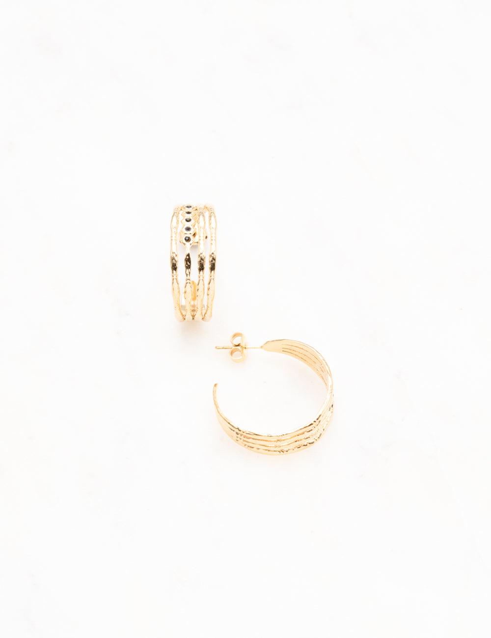 Boucles d'oreilles graphiques de type créoles à puce quatre rangs texturés ornées de 5 strass zirconium.