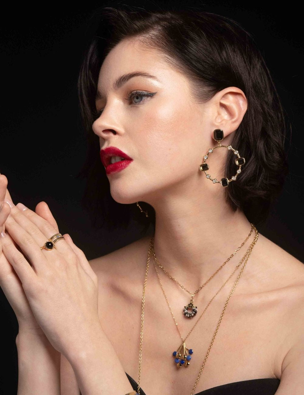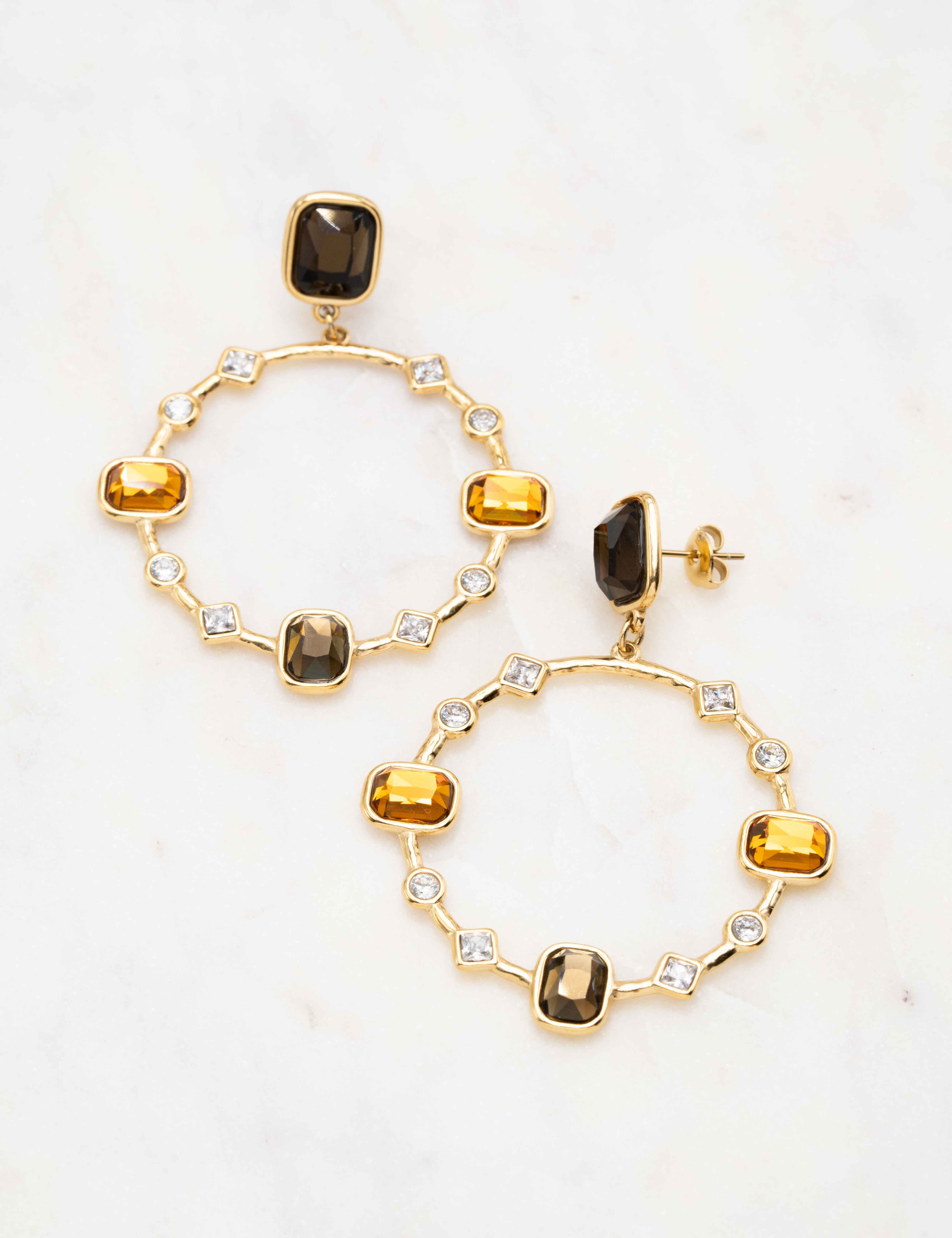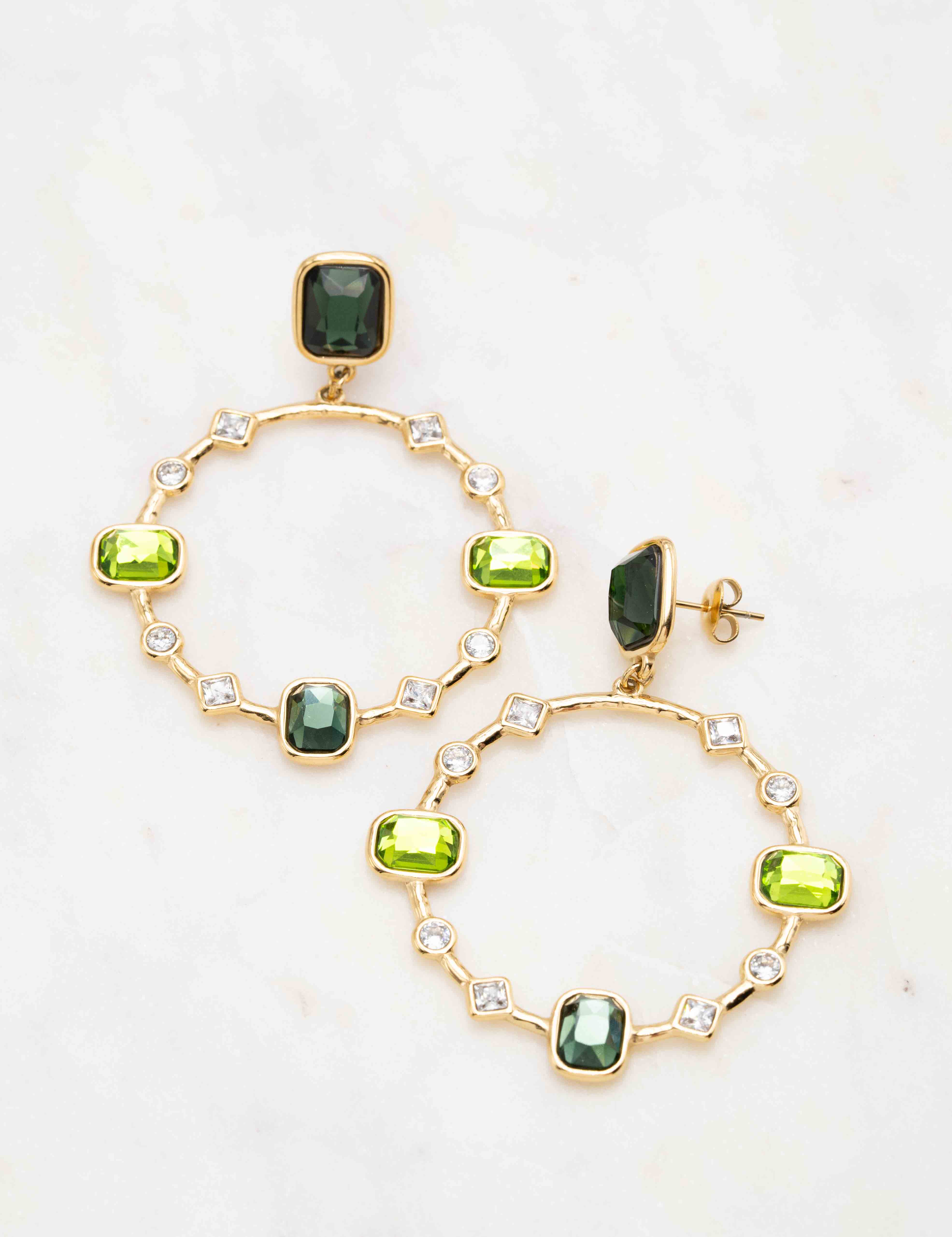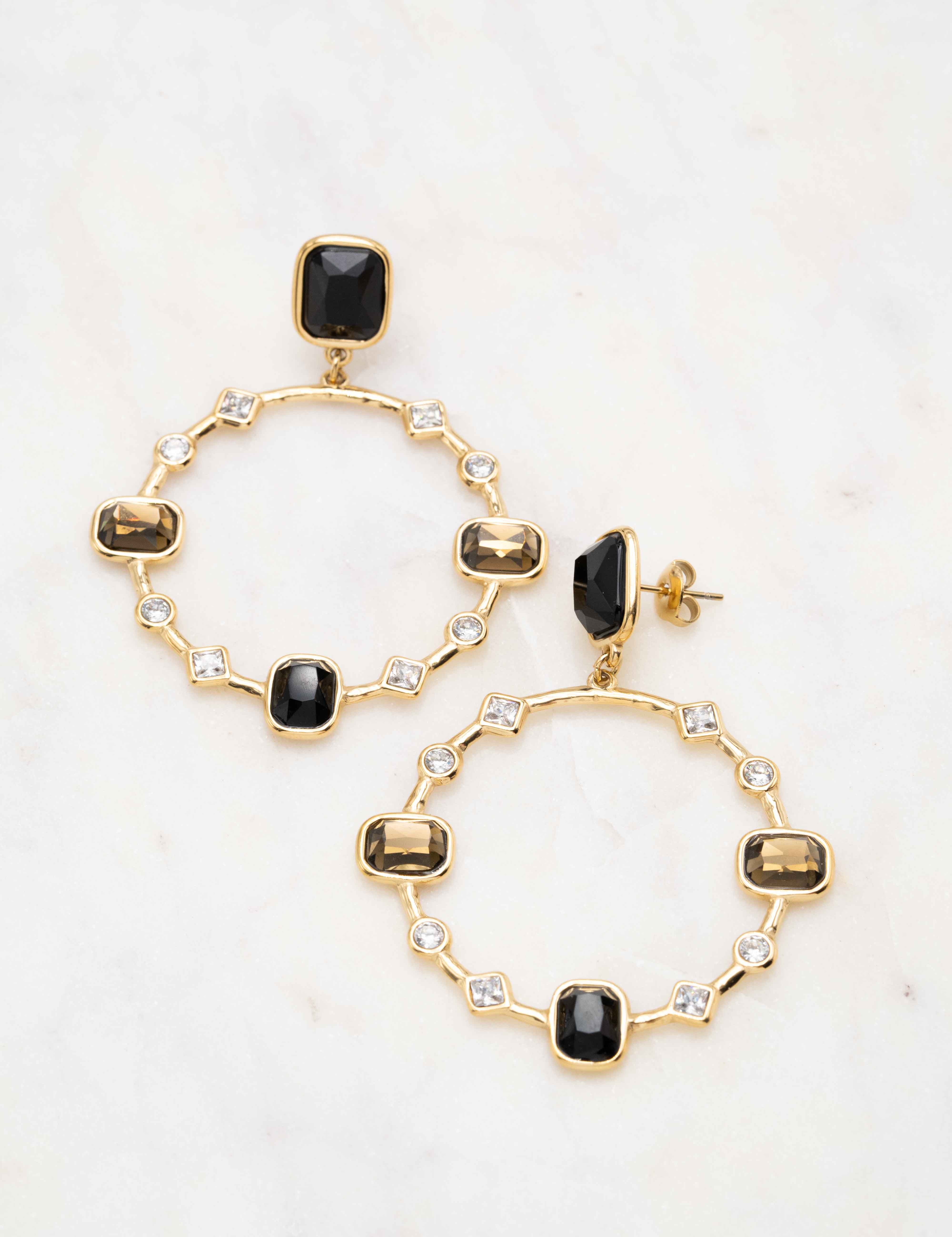 Boucles d'oreilles graphiques à puce pendantes composées d'un anneau avec des pièces géométriques ornées de strass et de pâtes de verres.