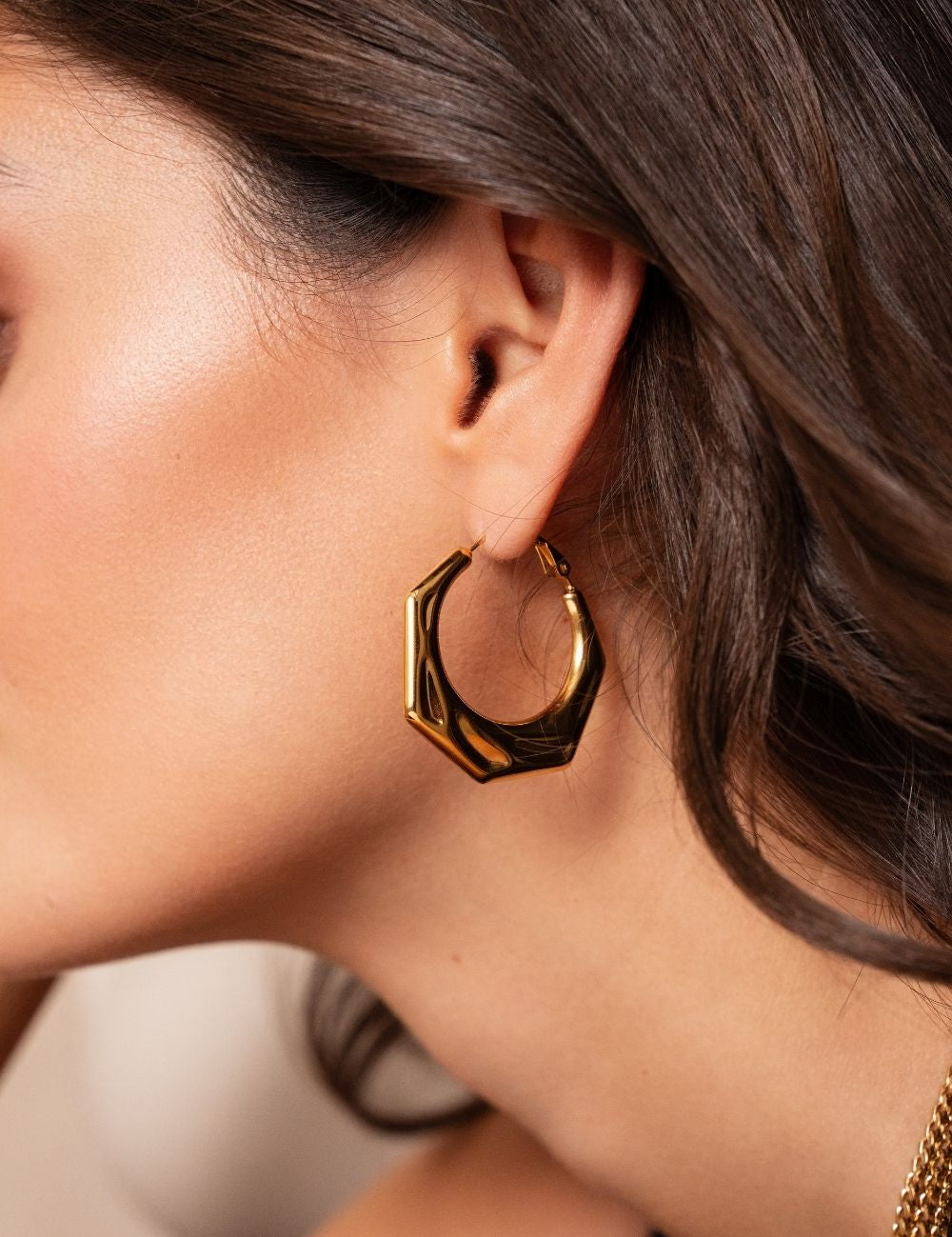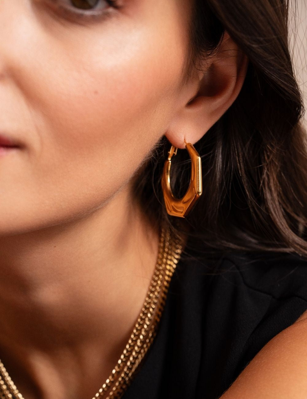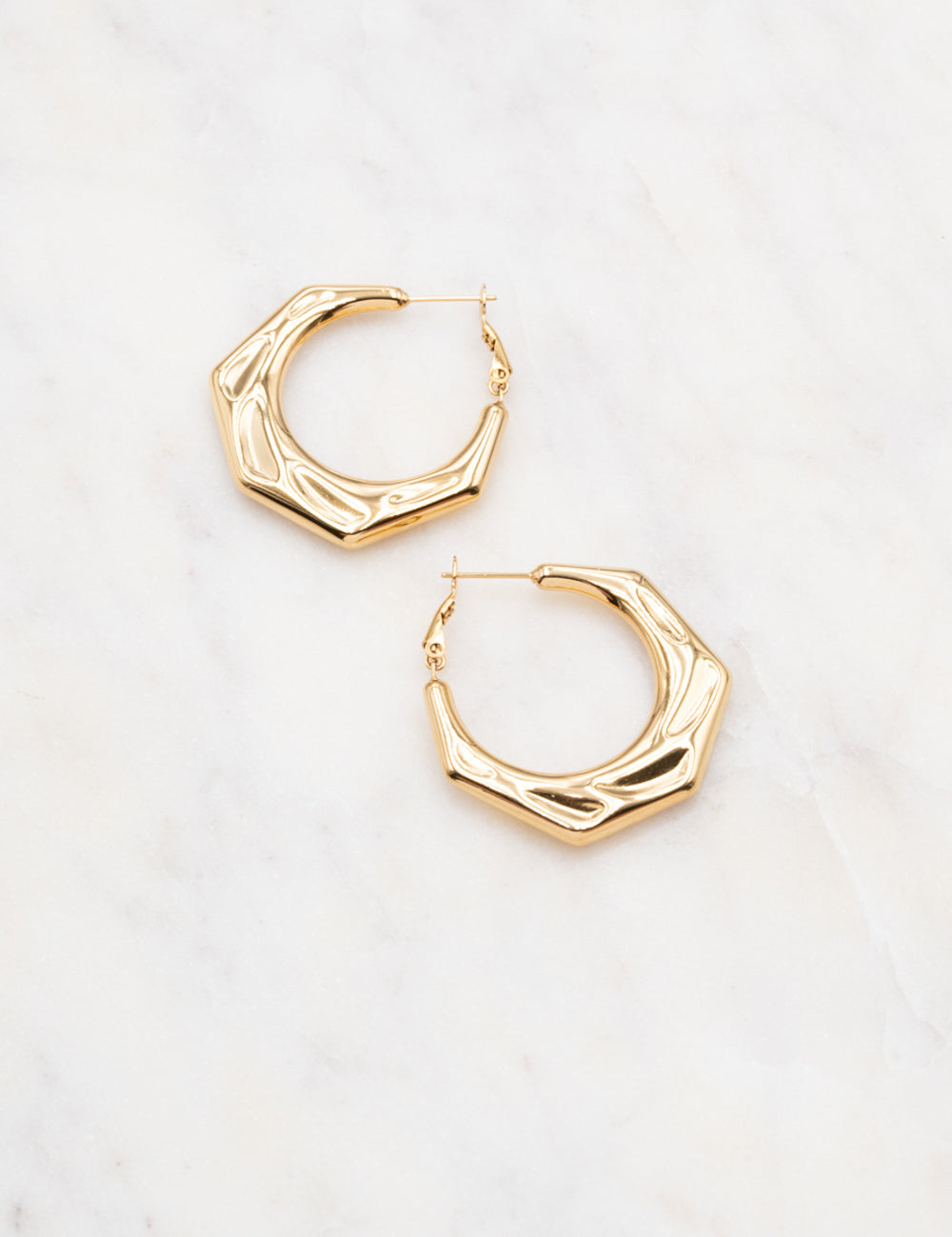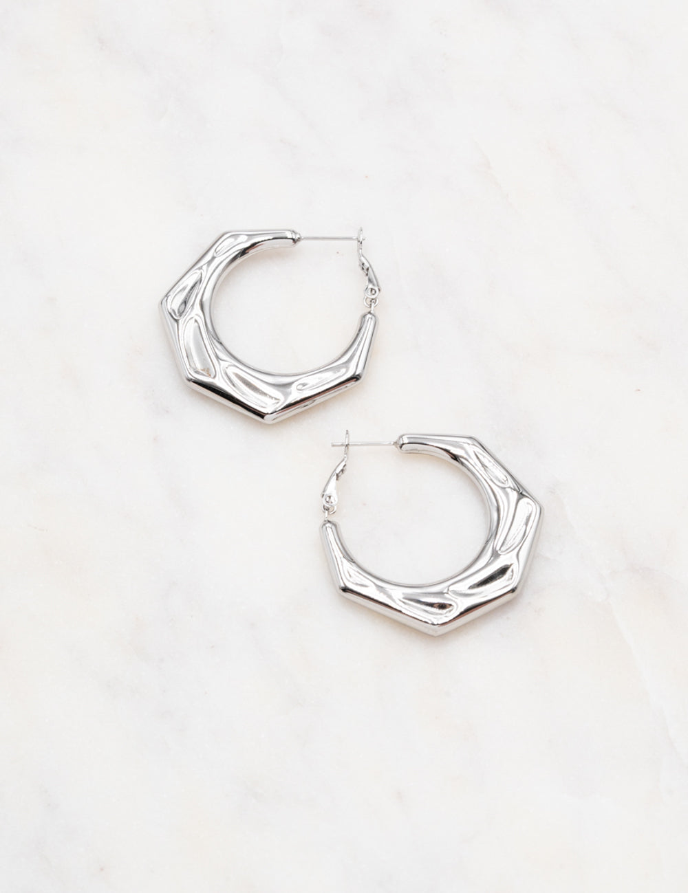 Boucles d'oreilles graphiques type créoles à puce style hexagone texturées.