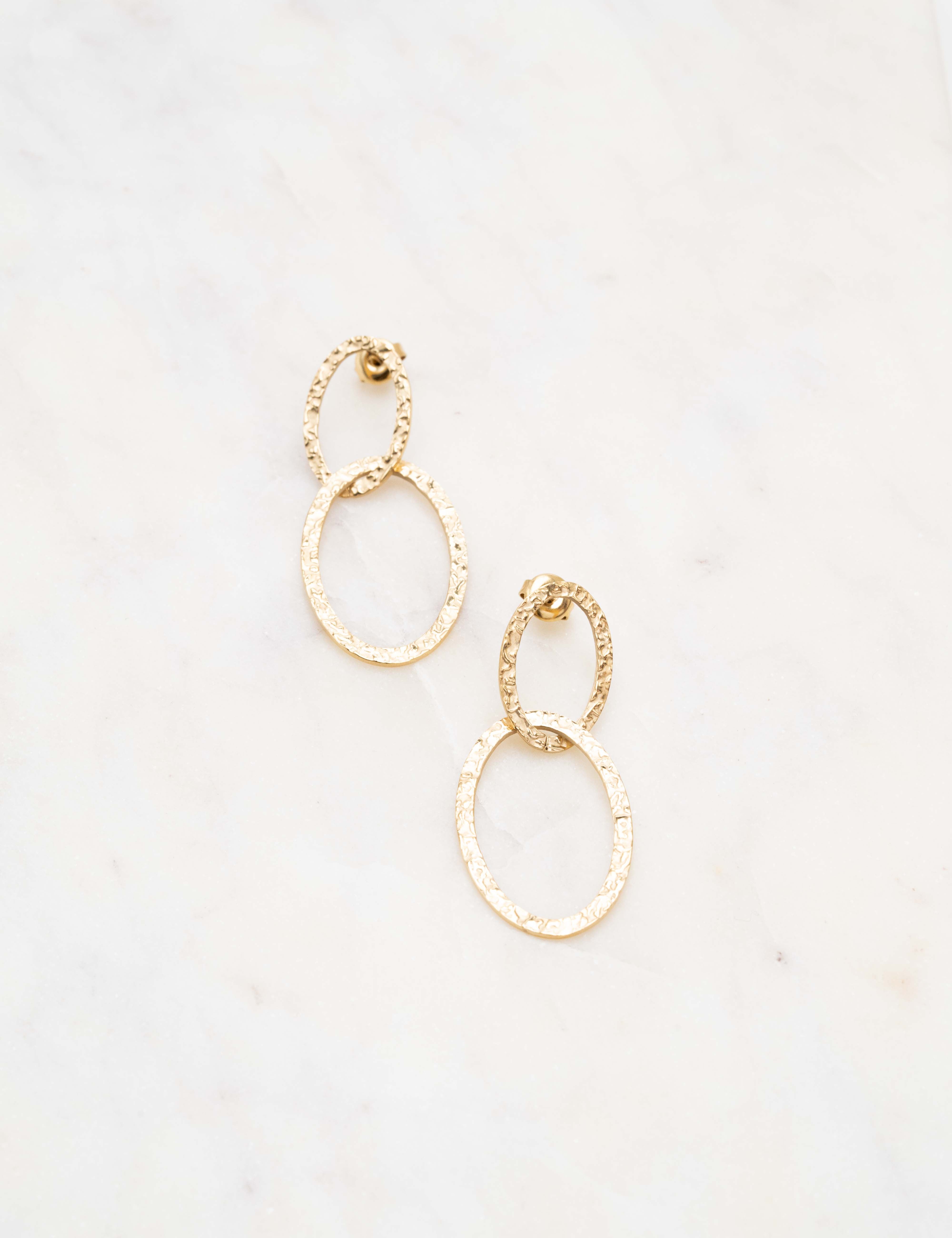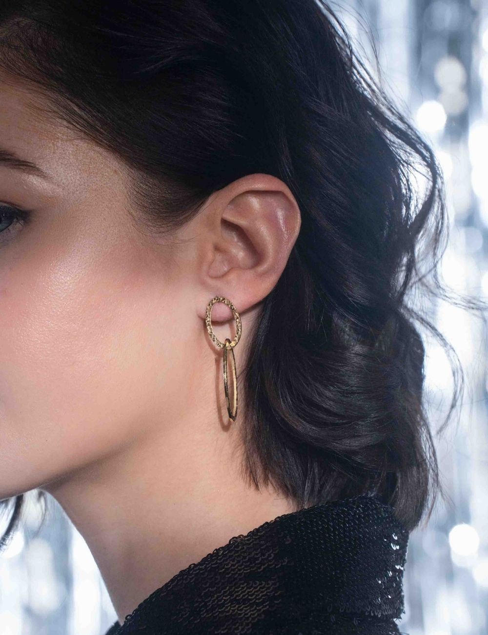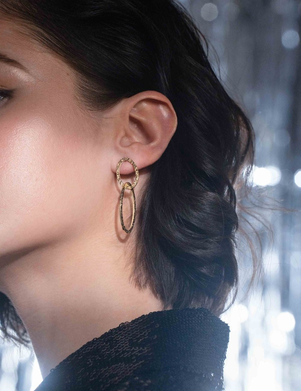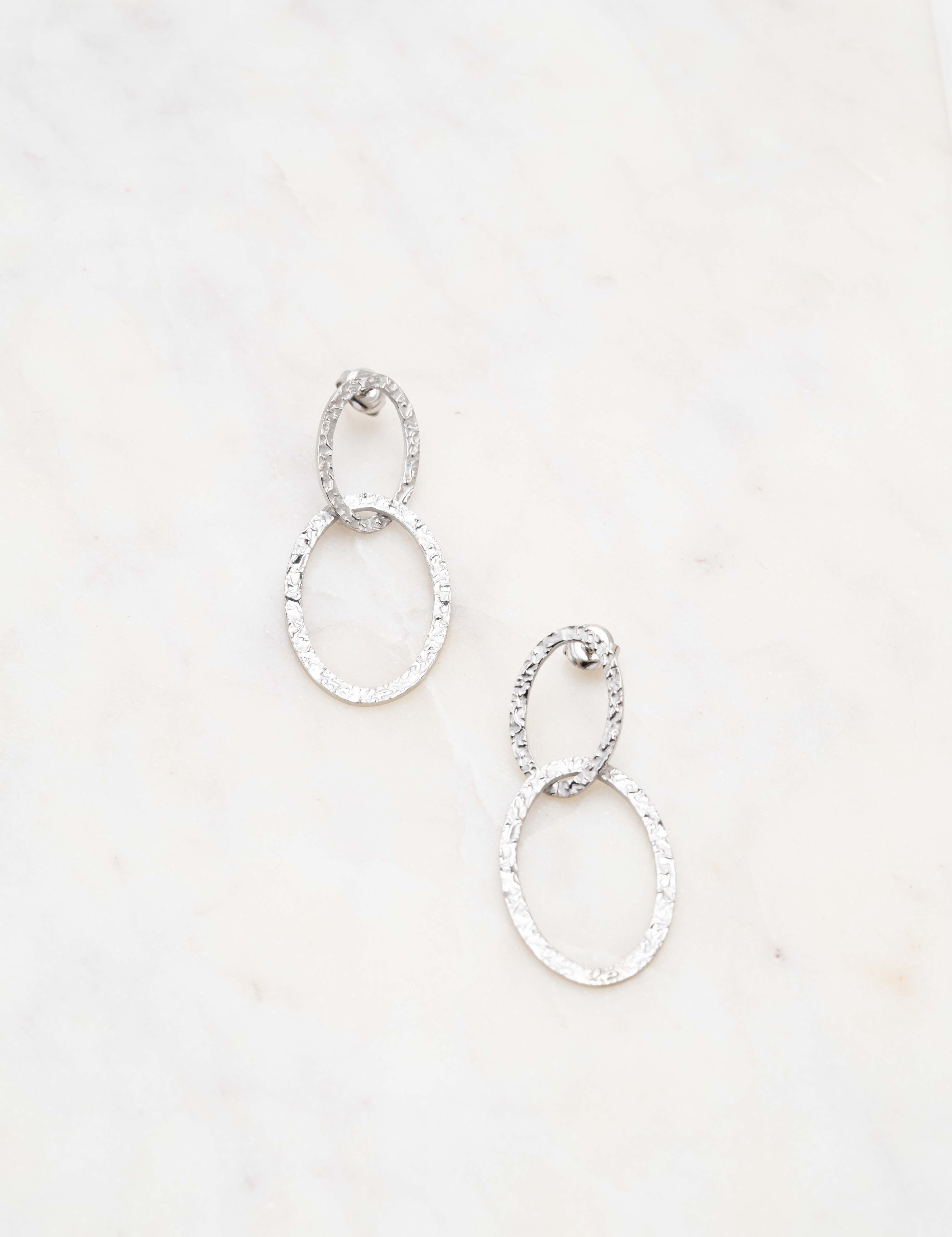 Boucles d'oreilles graphiques à puce composées de double anneaux ovales martelés.