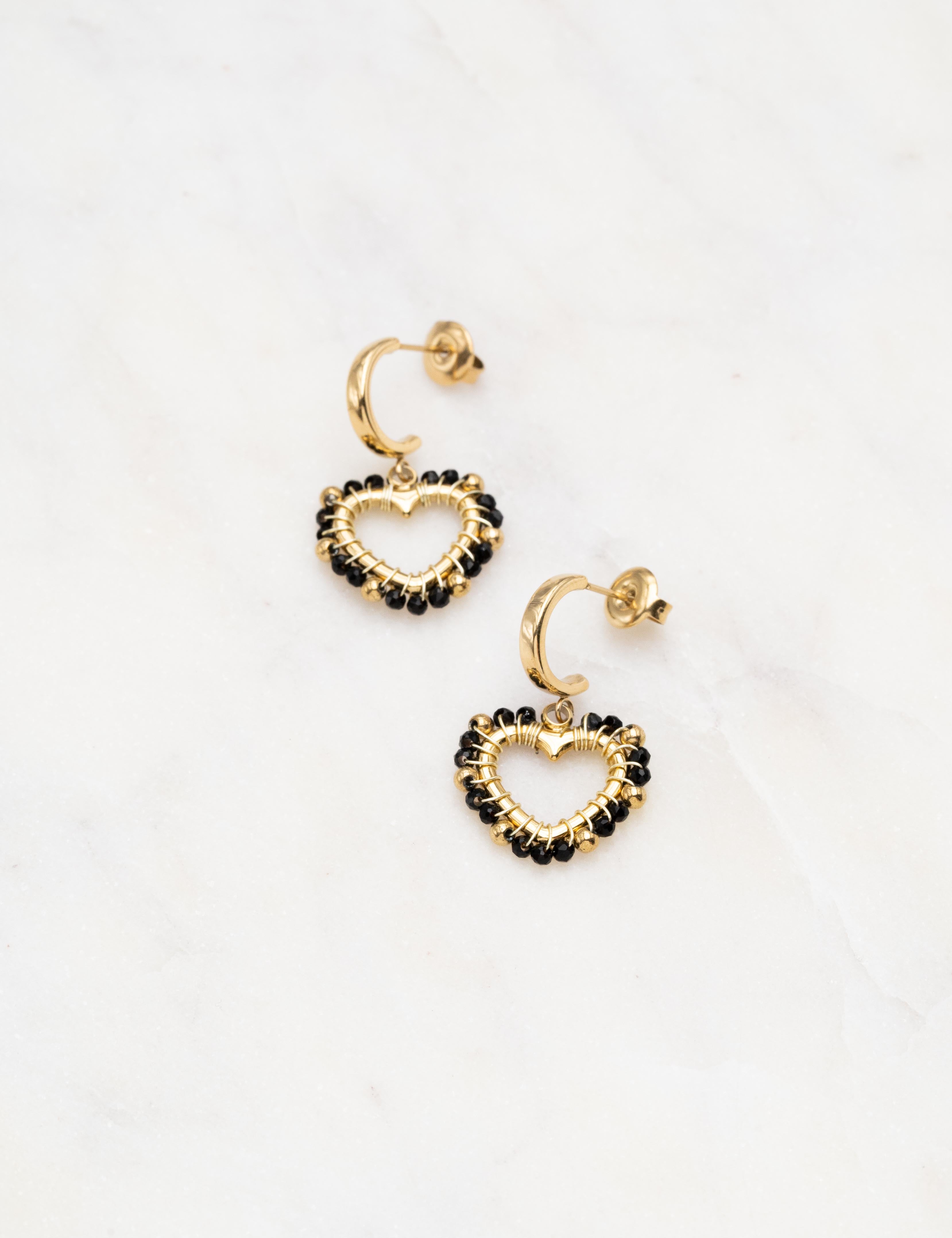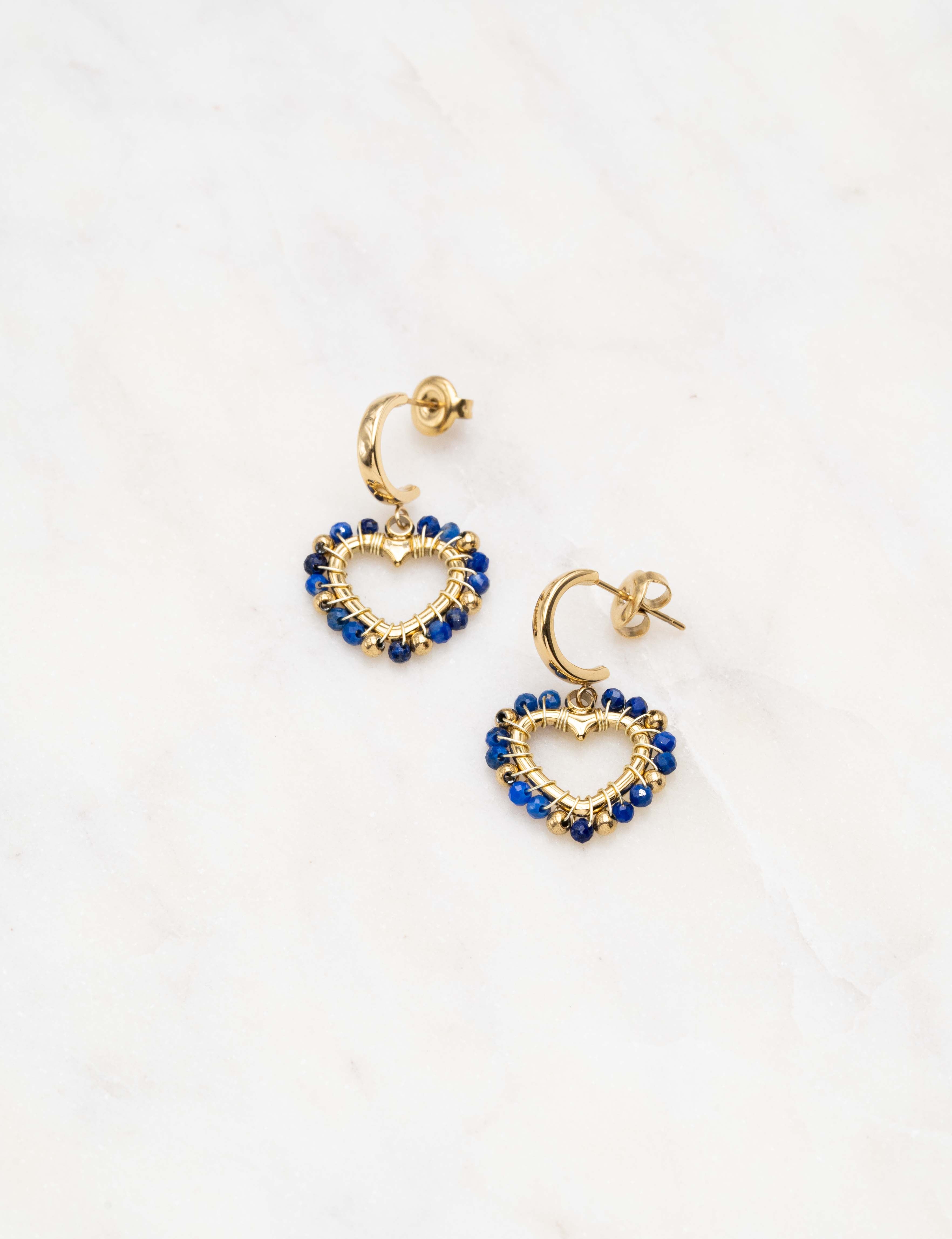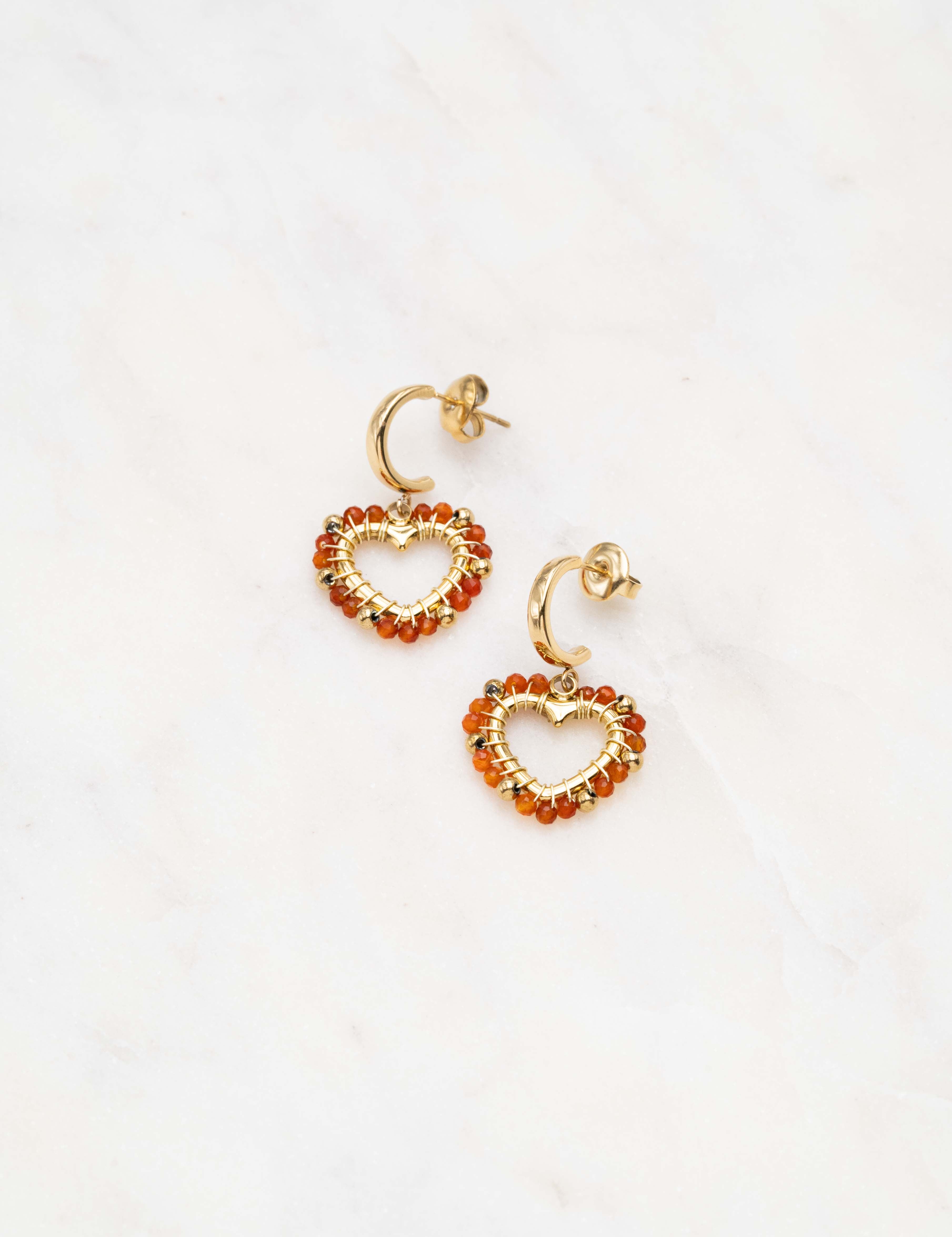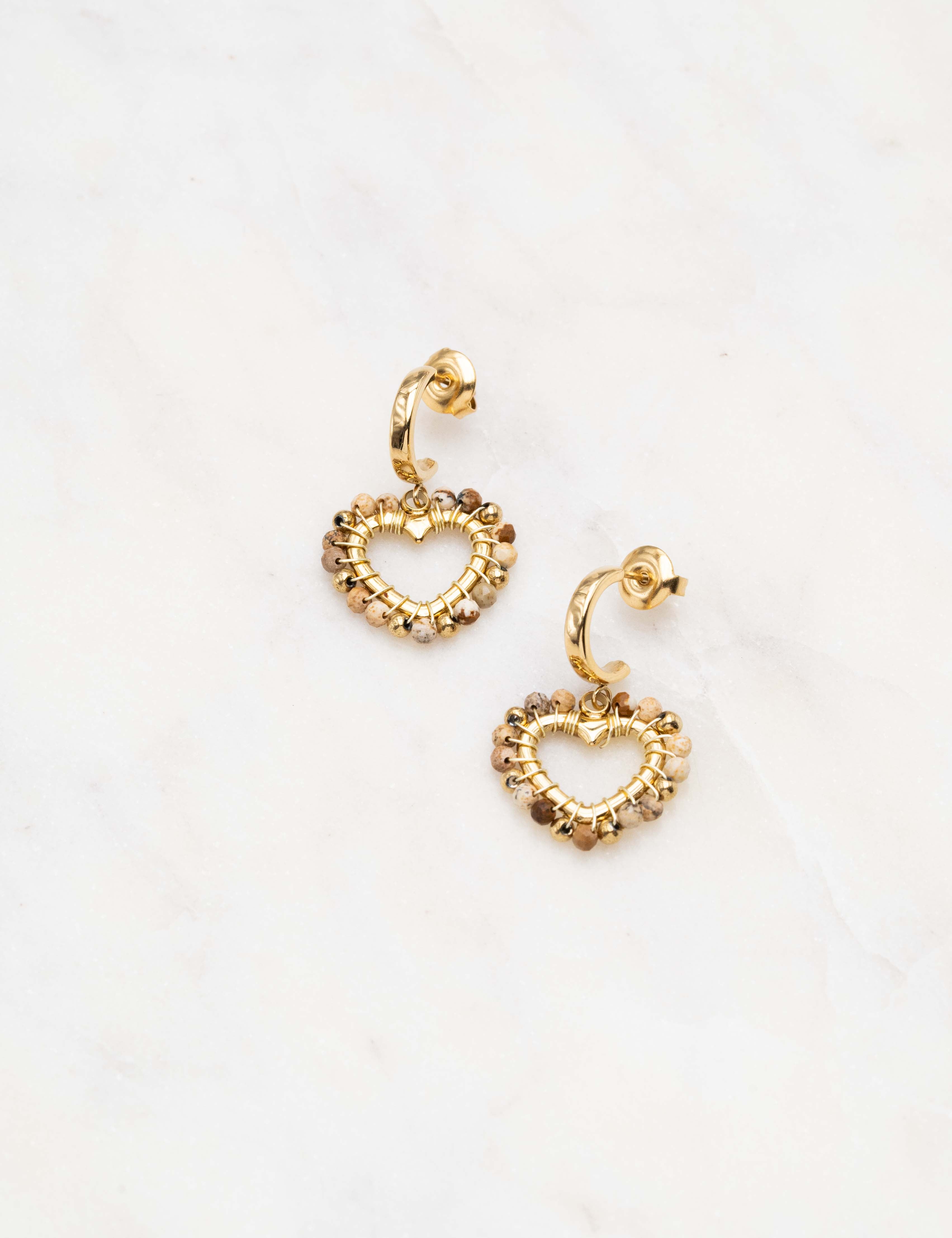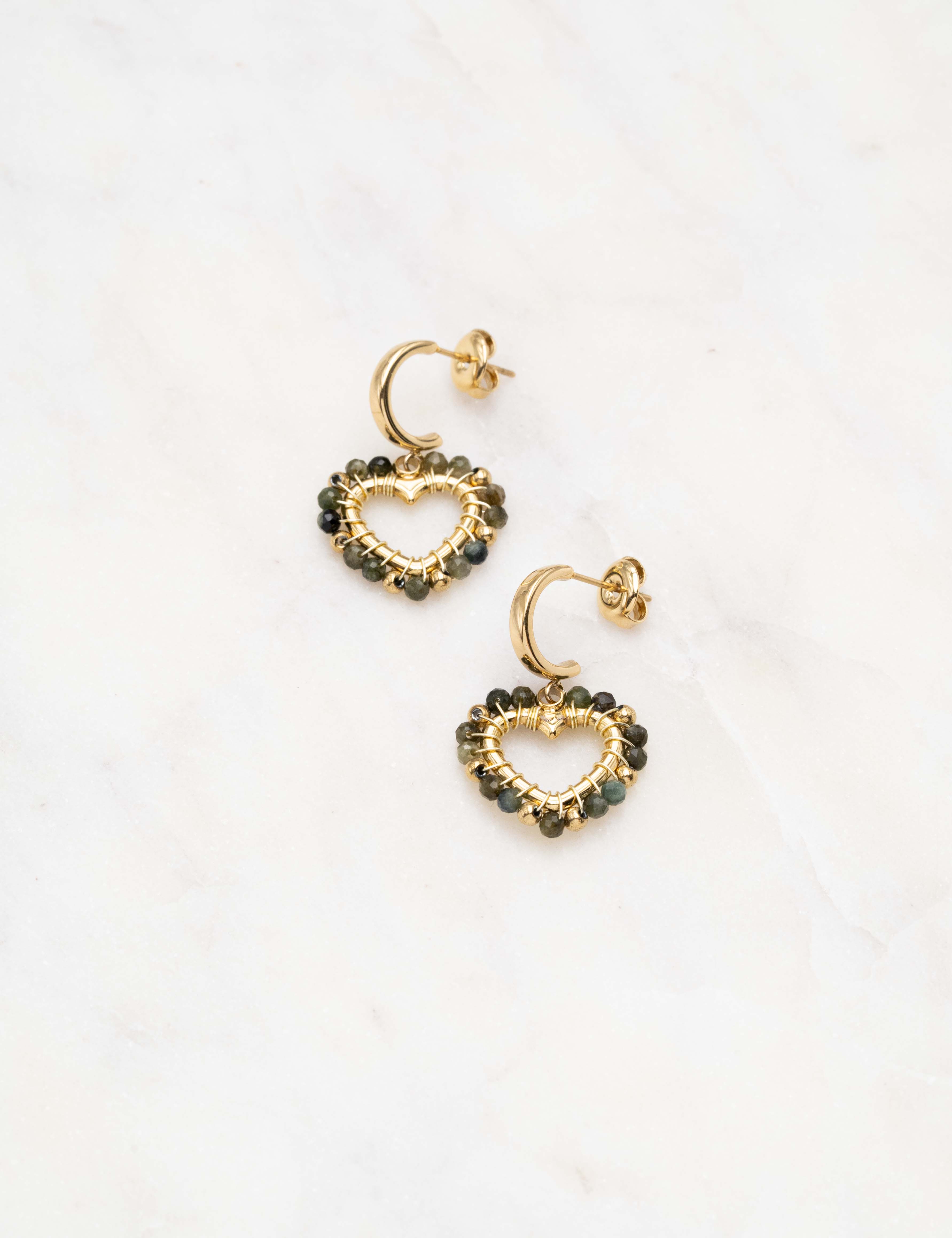 Boucles d'oreilles type créoles à puce composée d'une pièce en forme de coeur ornée de perles en pierre naturelle.
