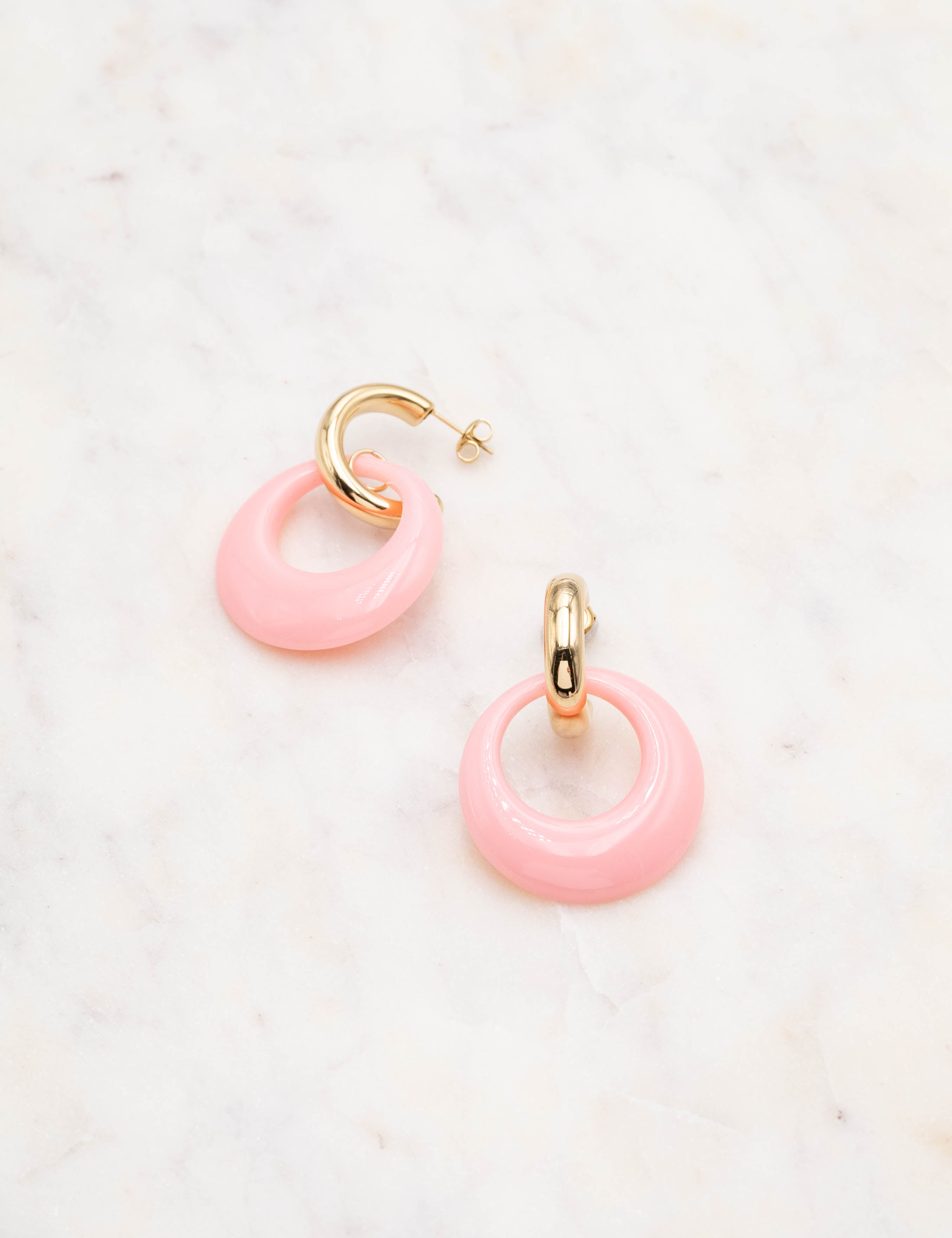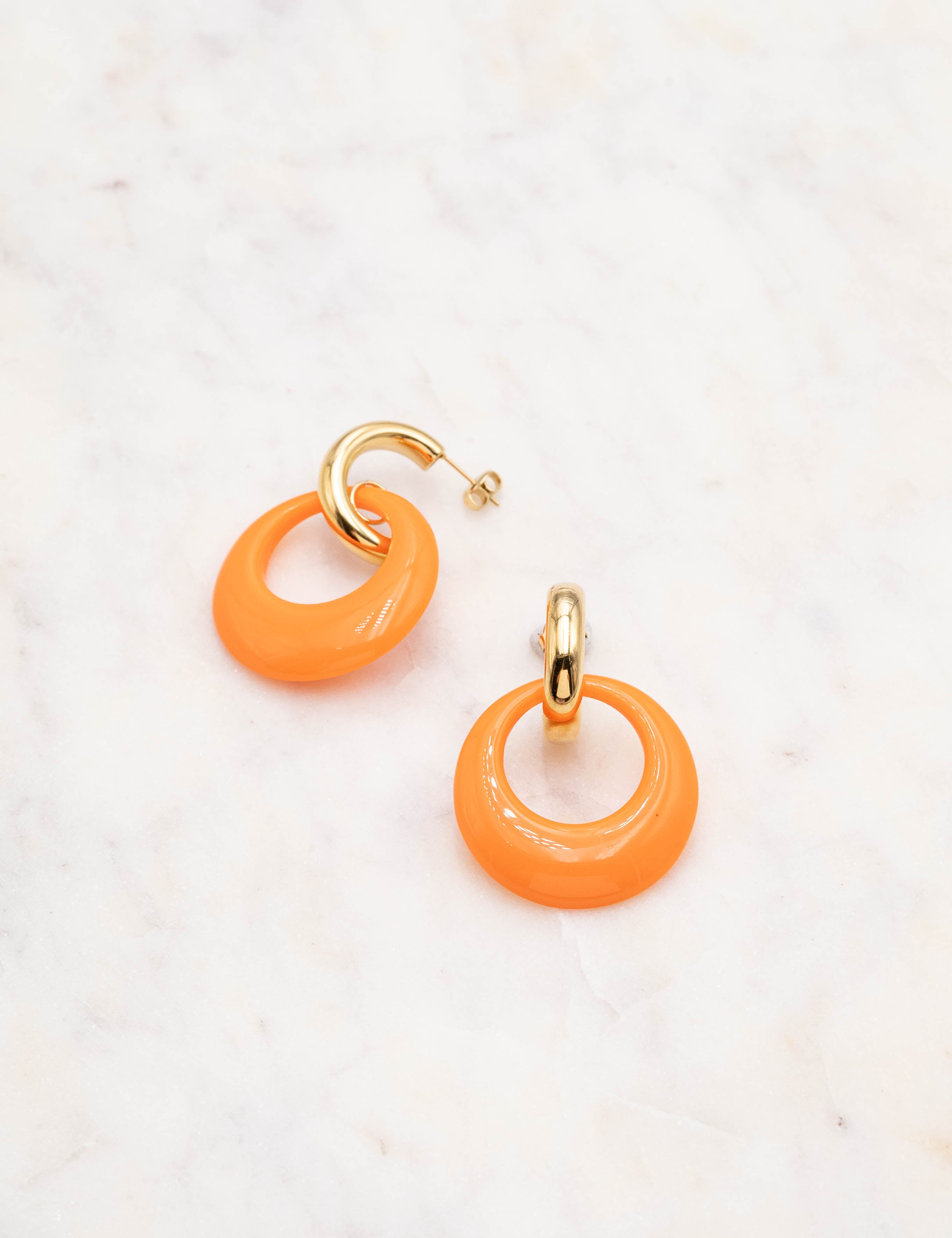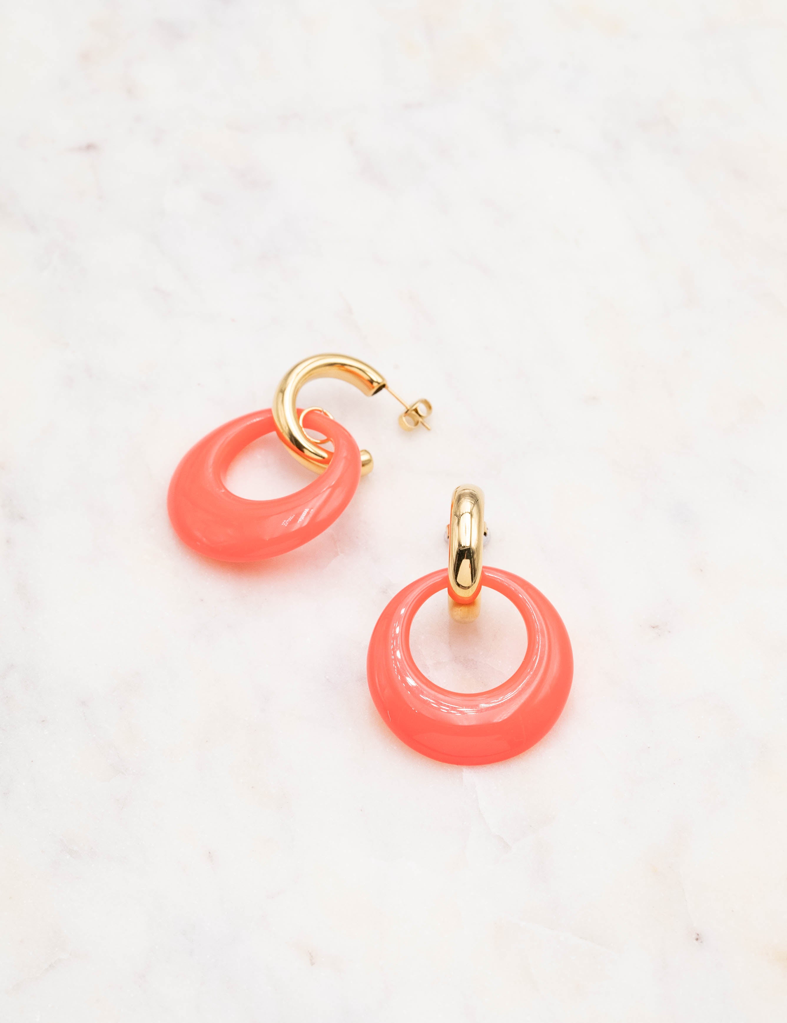 Boucles d'oreilles type créoles à puce composées d'un pendant anneau en résine colorée.
