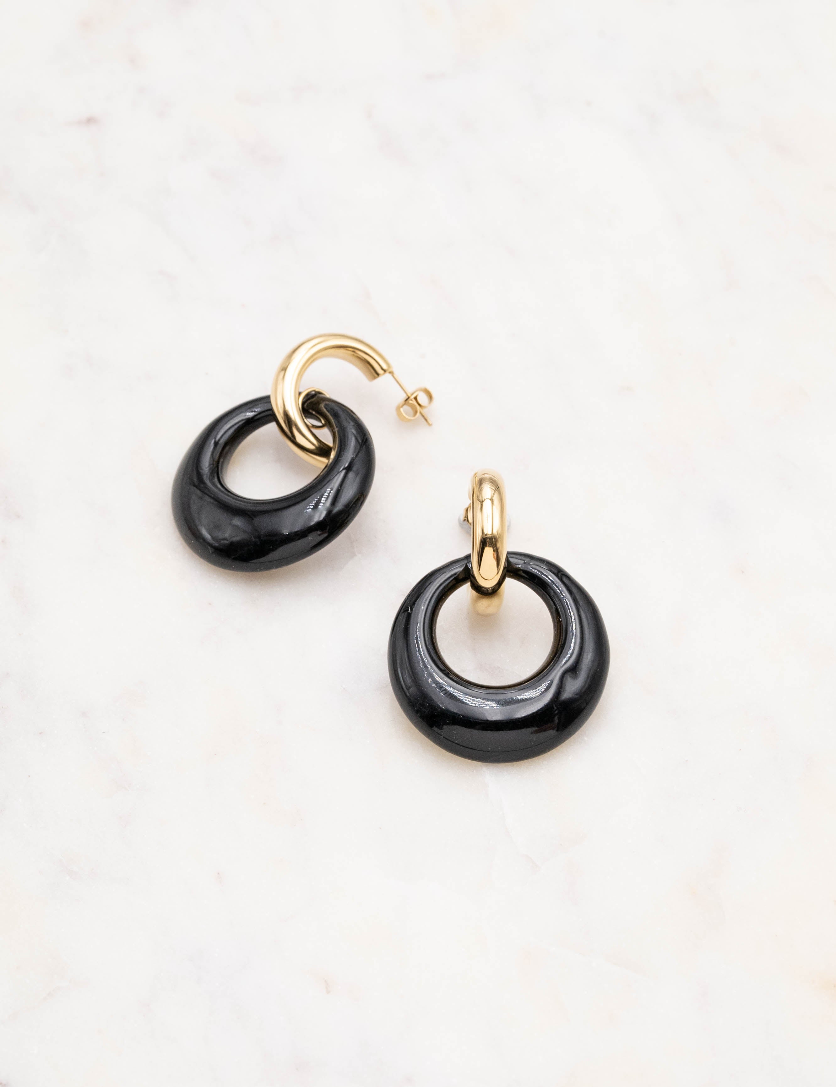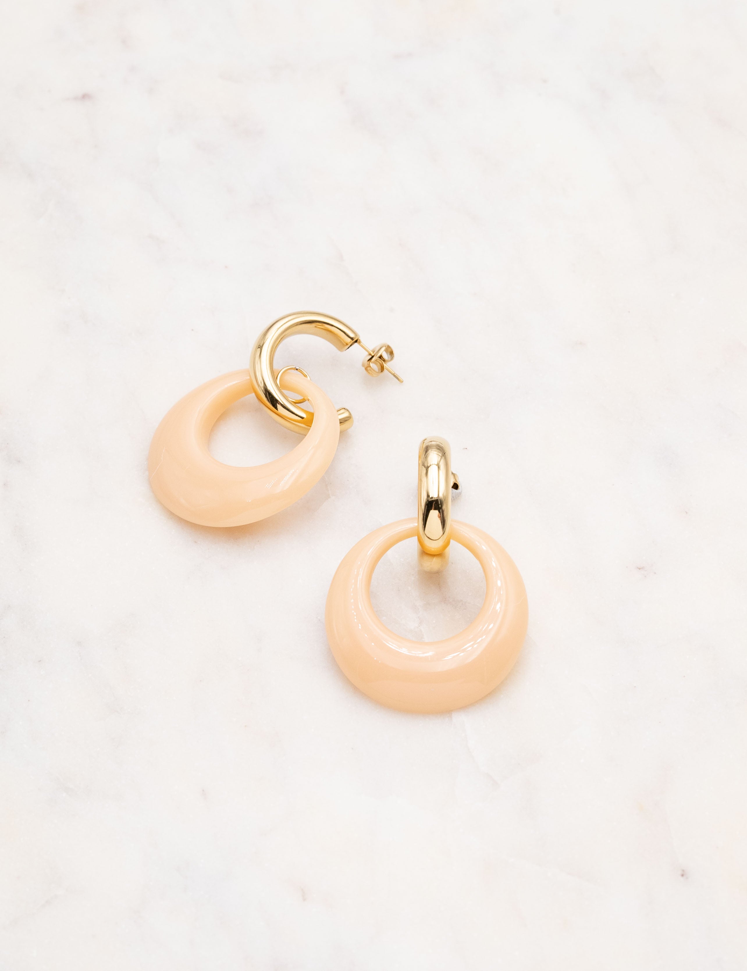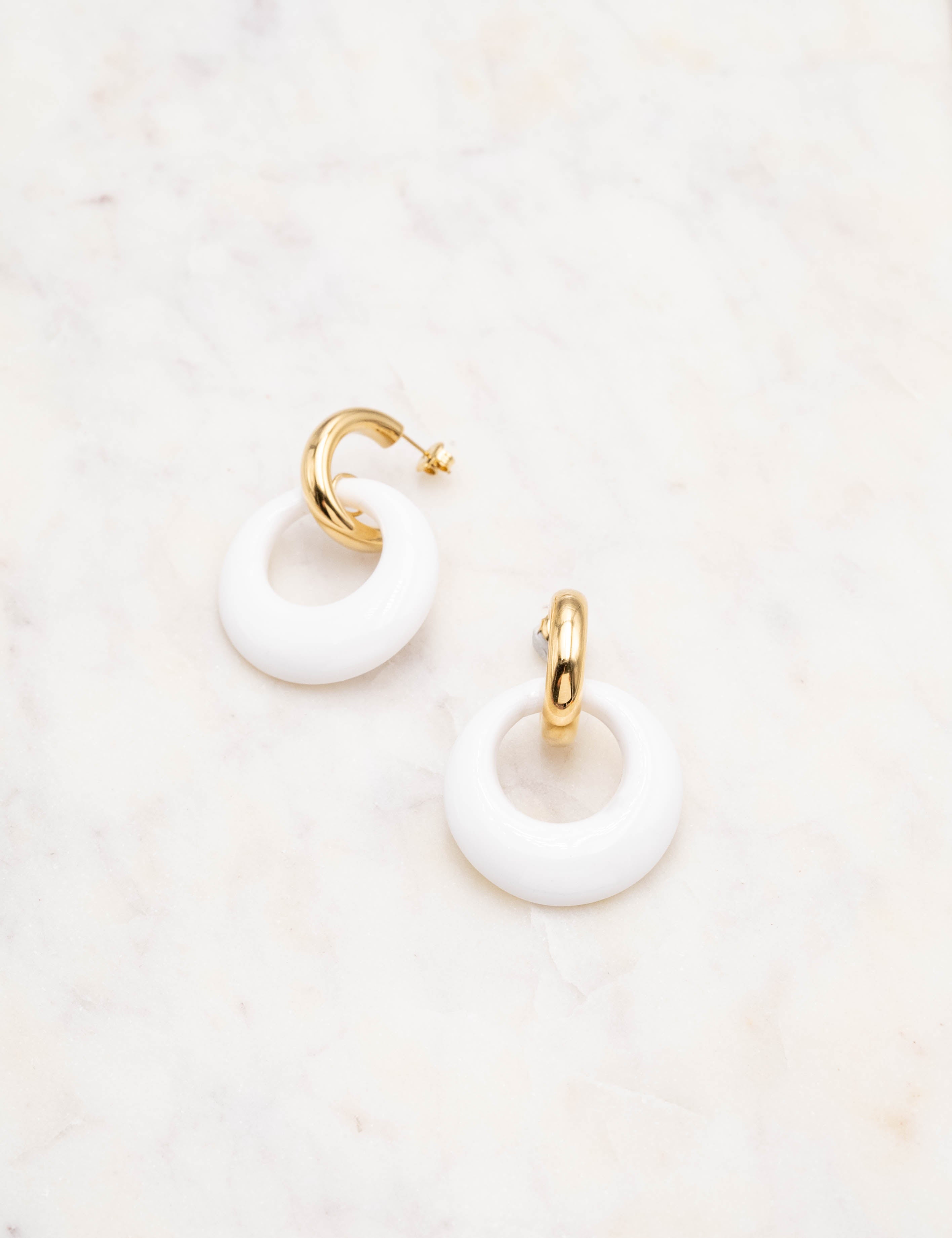 Boucles d'oreilles type créoles à puce composées d'un pendant anneau en résine colorée.