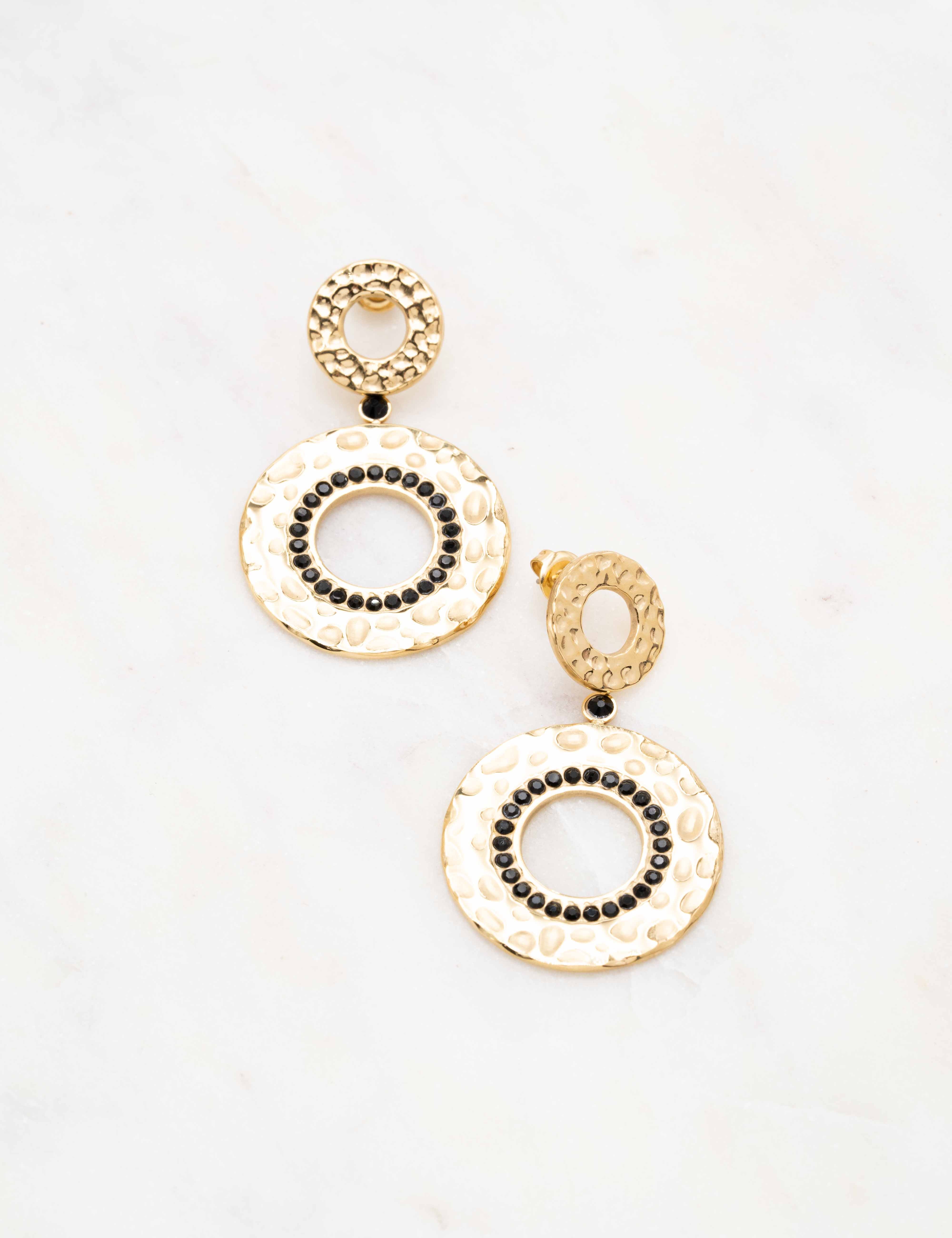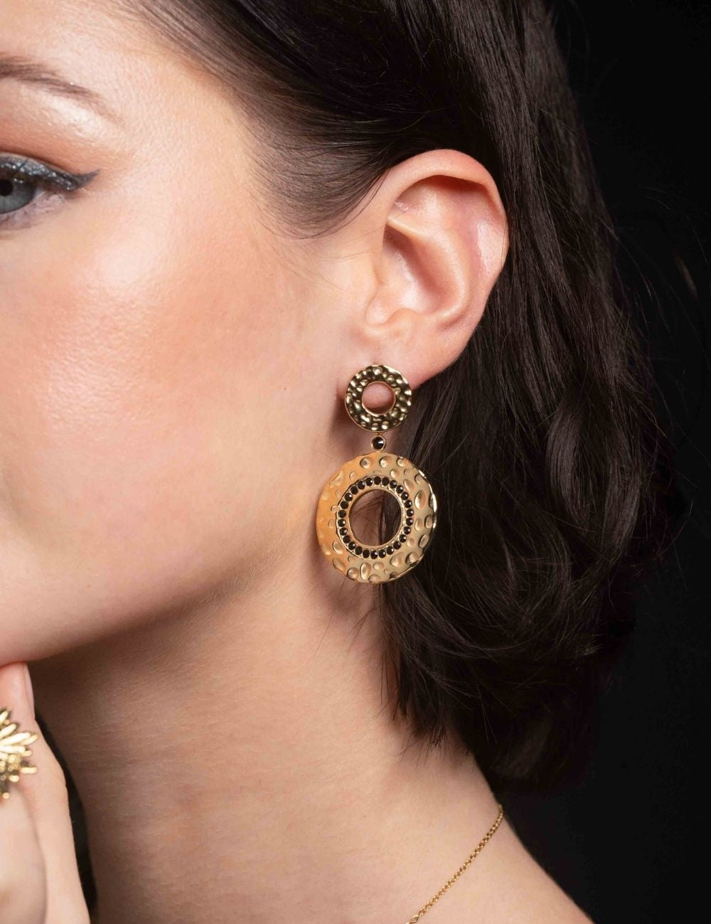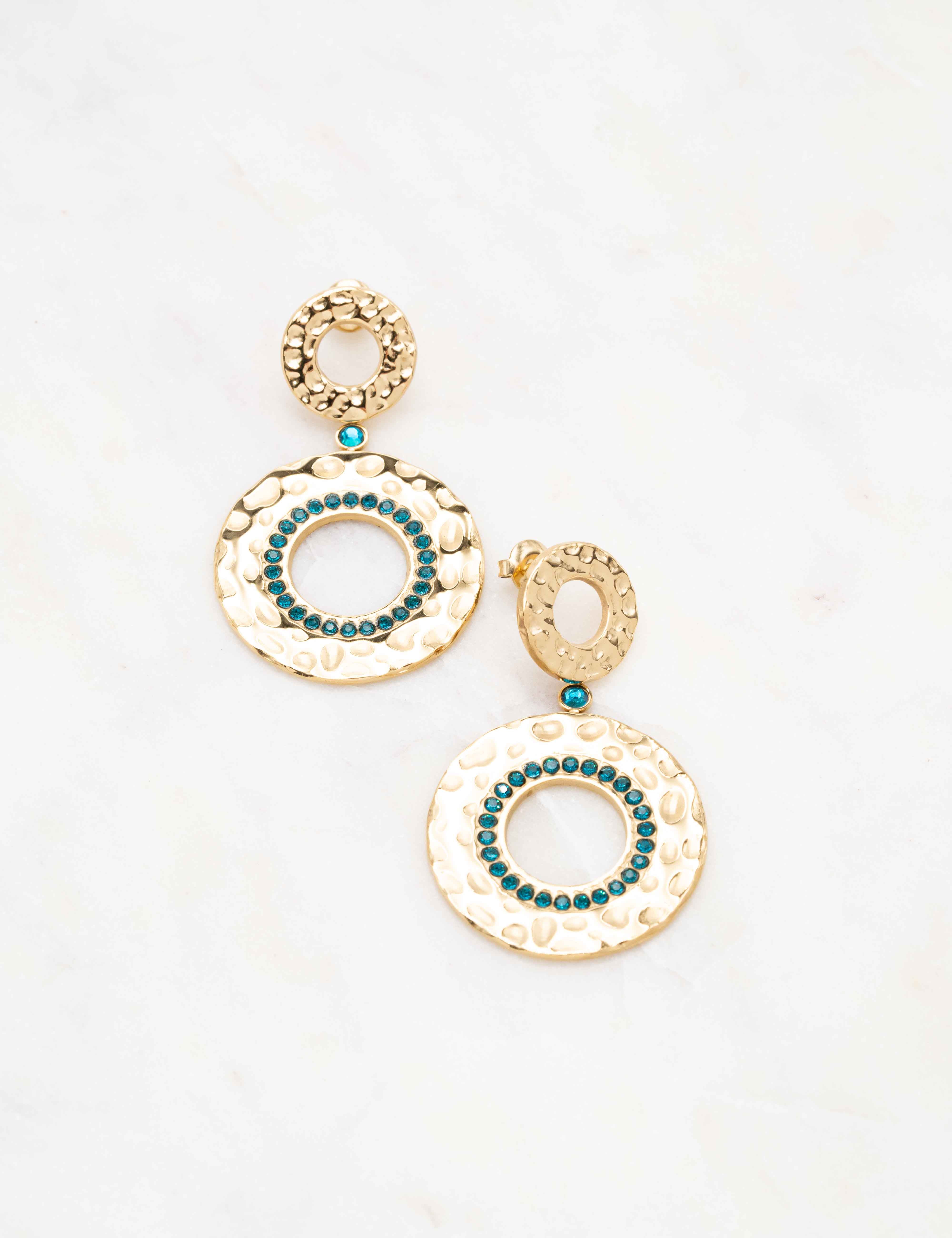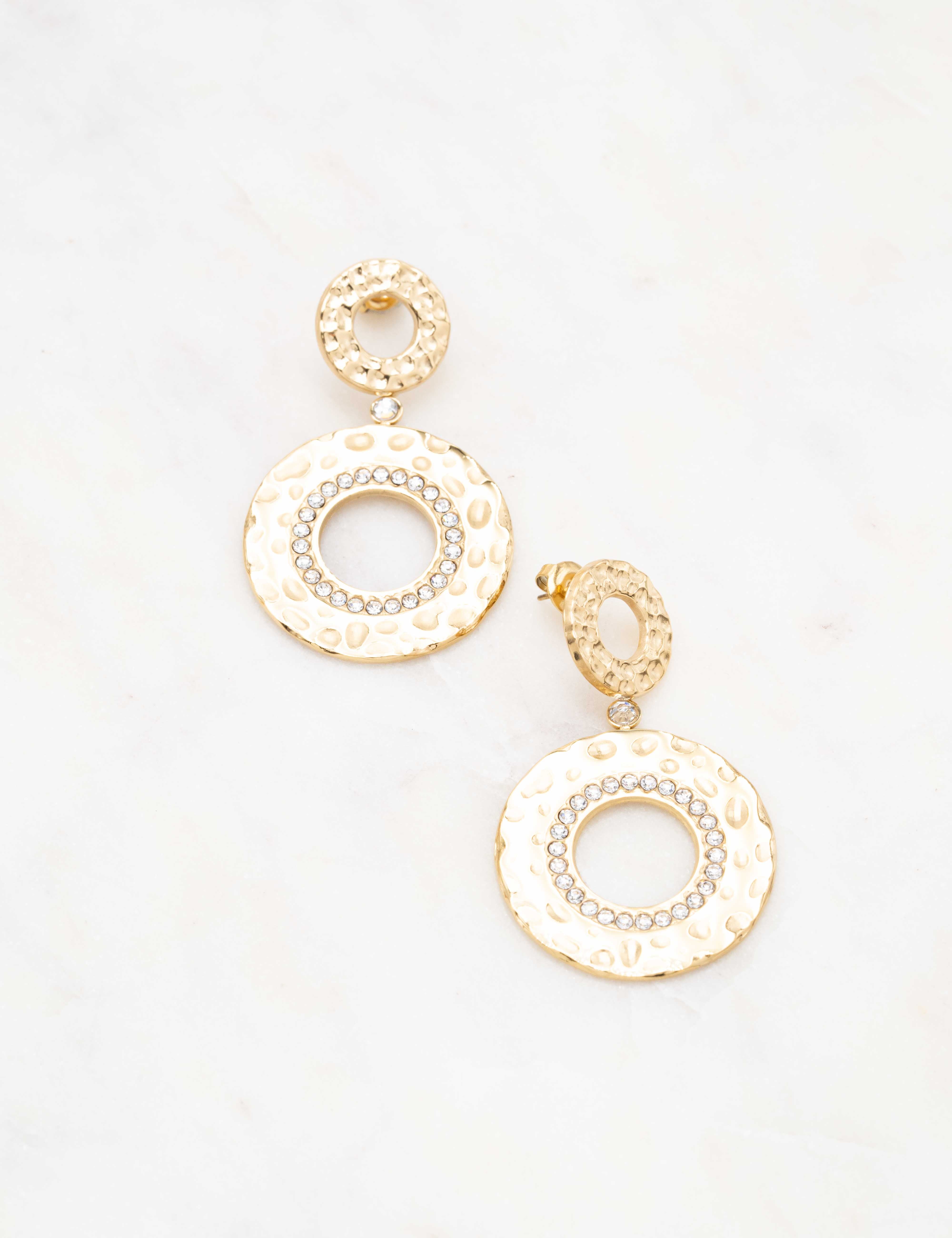 Boucles d'oreilles graphiques à puce composées de deux pièces martelées ajourées et ornées de strass.