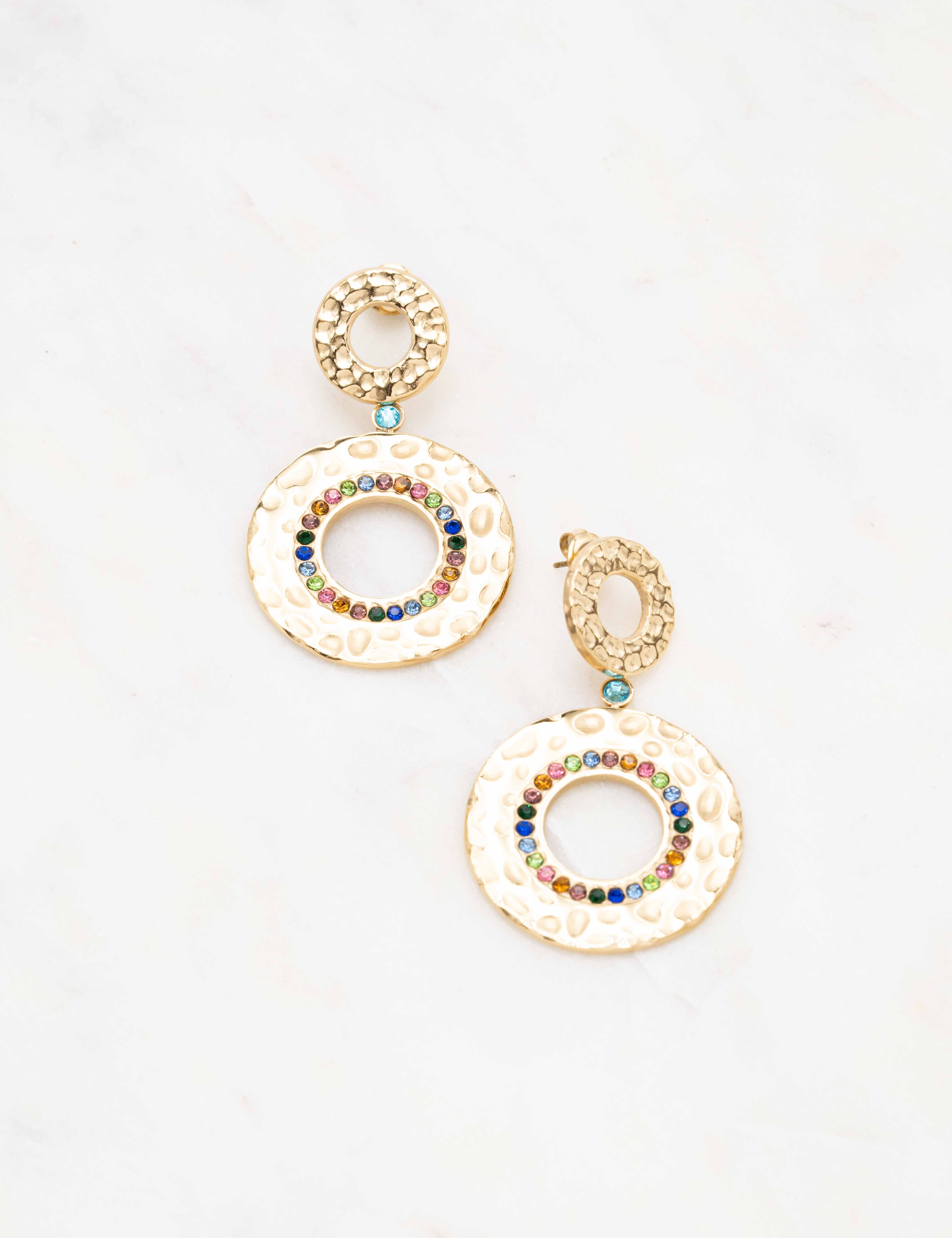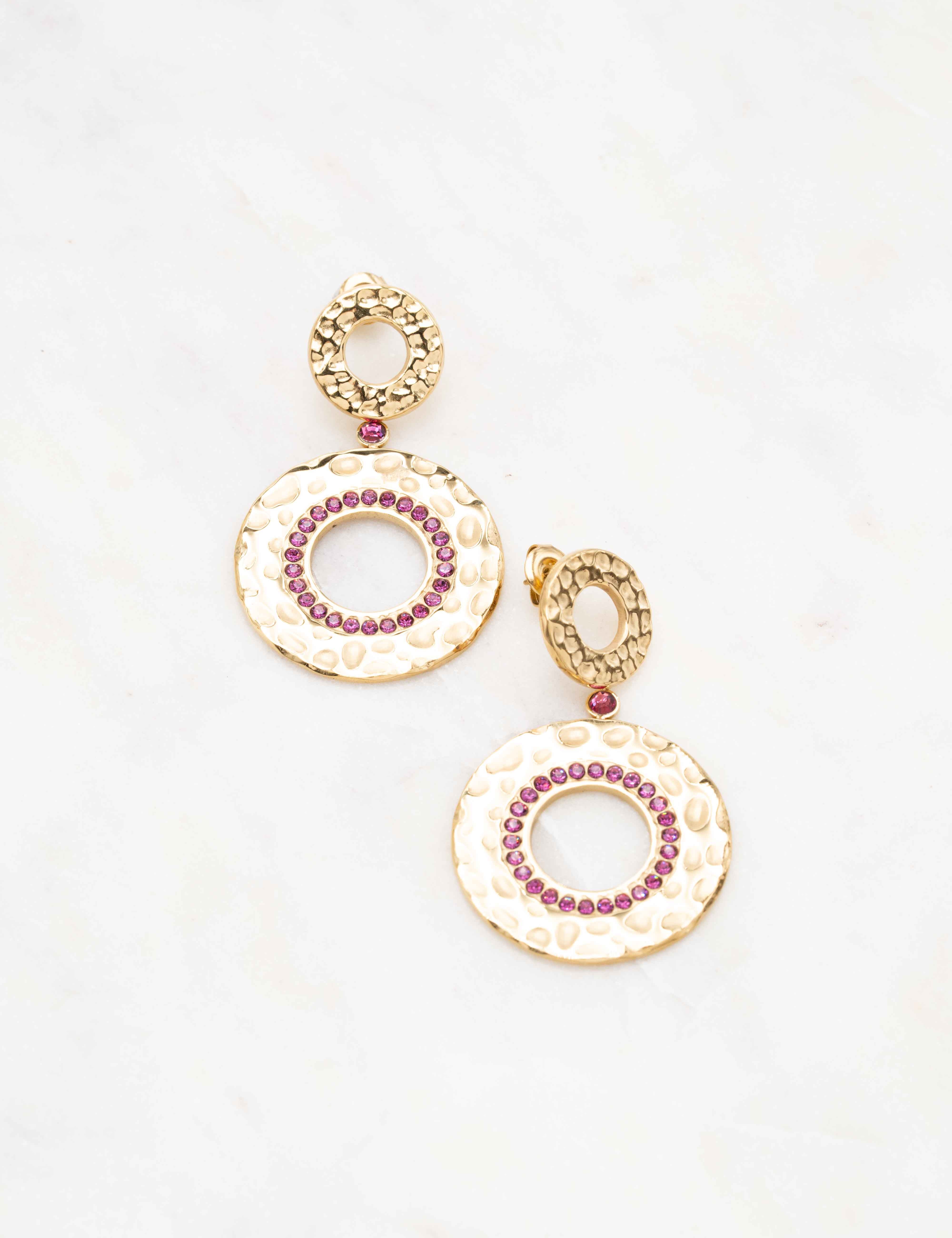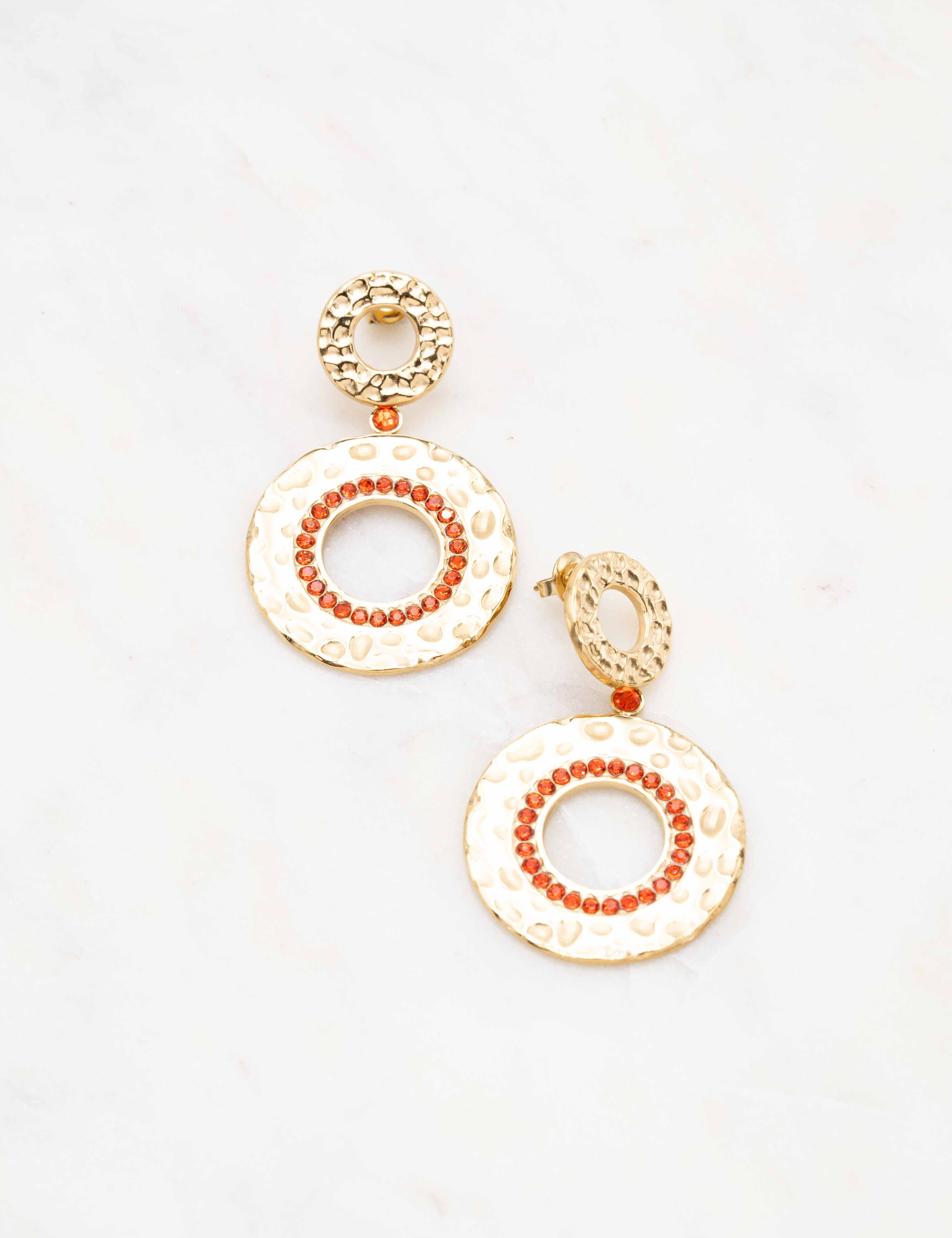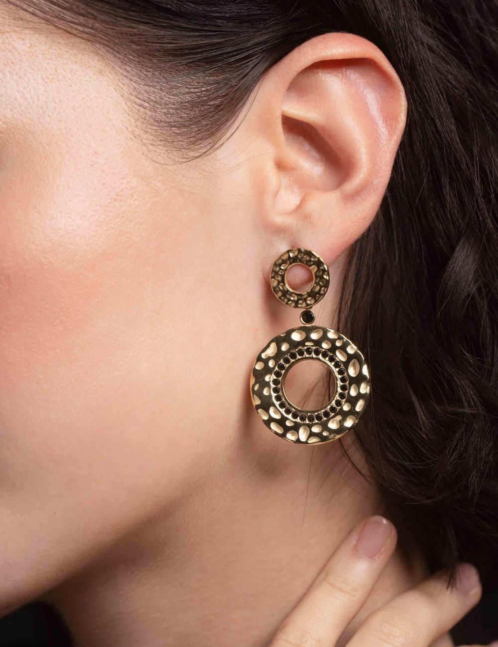 Boucles d'oreilles graphiques à puce composées de deux pièces martelées ajourées et ornées de strass.