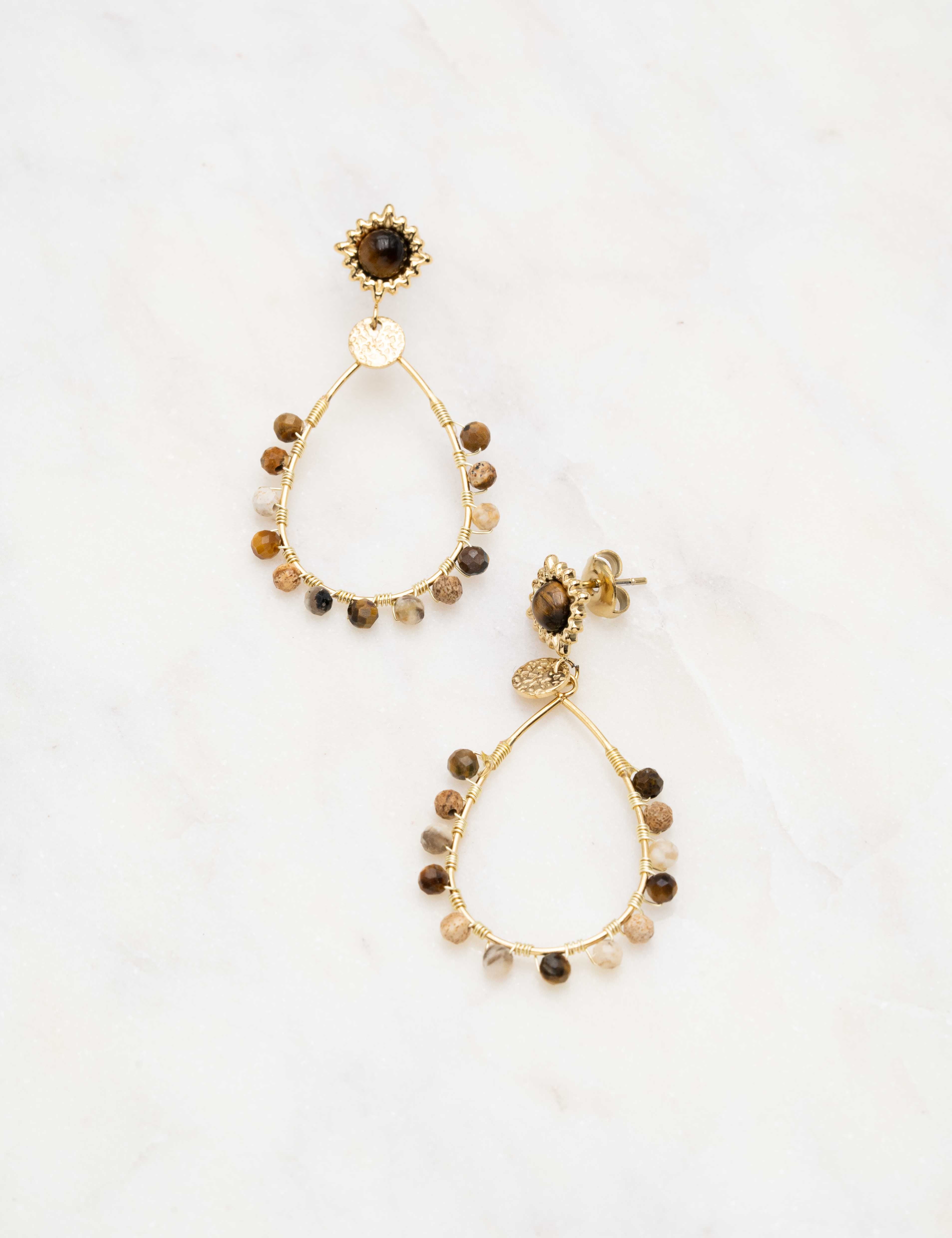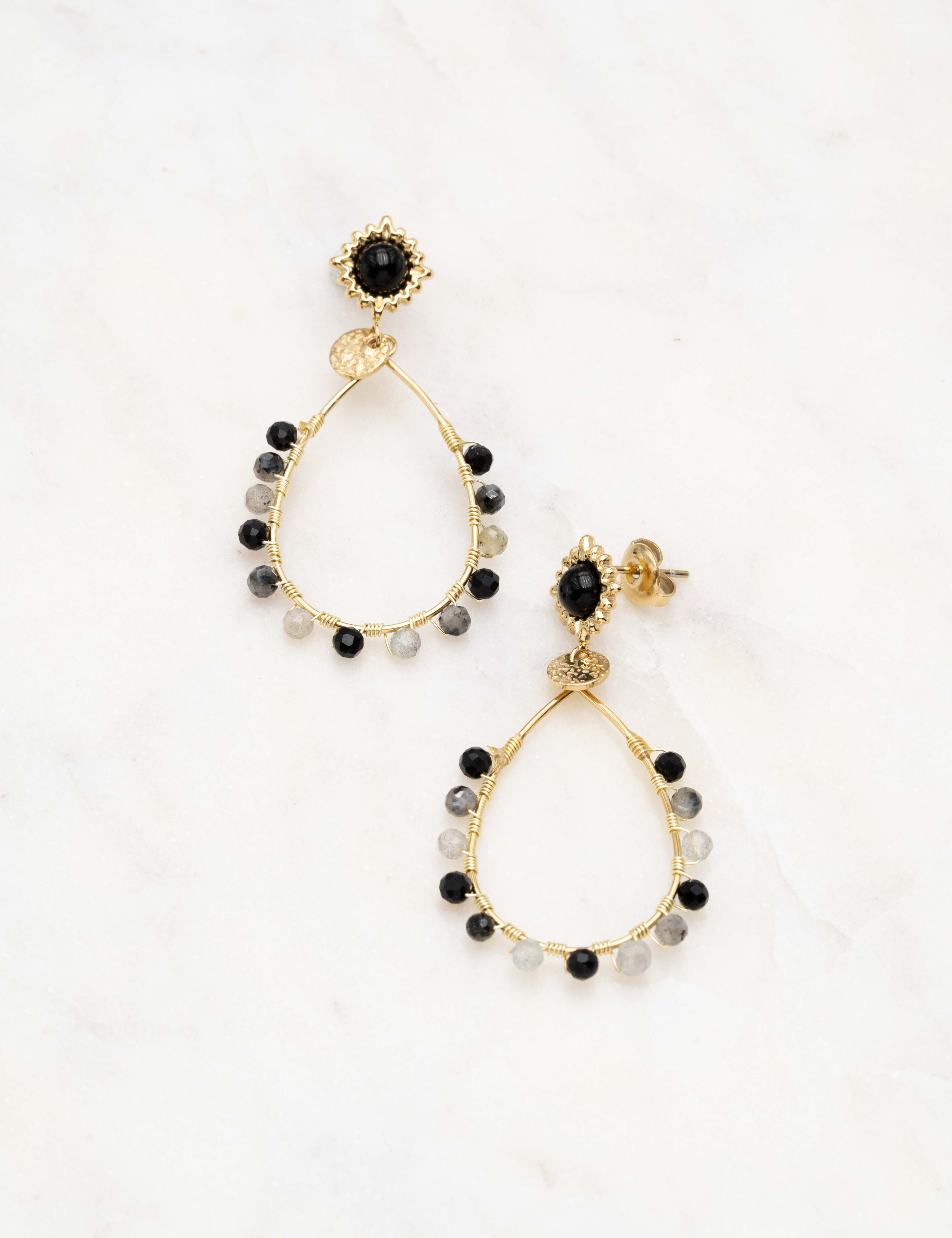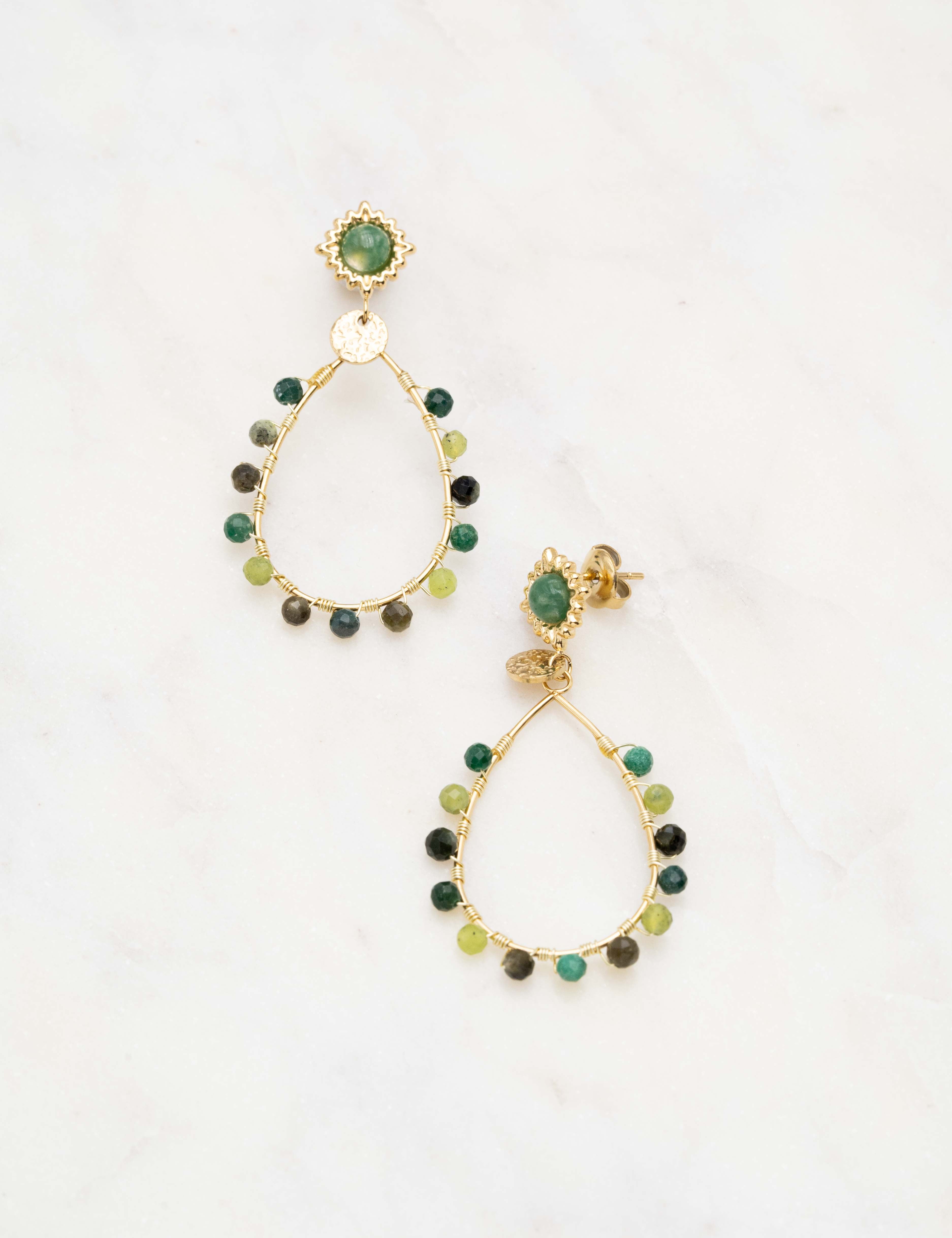 Boucles d'oreilles à puce composées d'un anneau oval orné de perles en pierres naturelles.