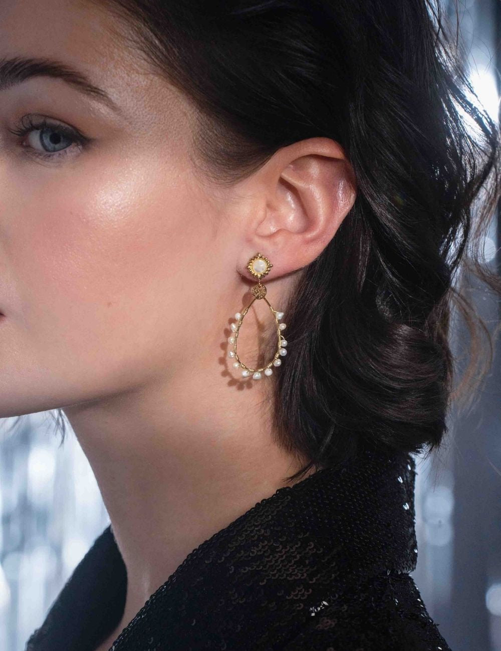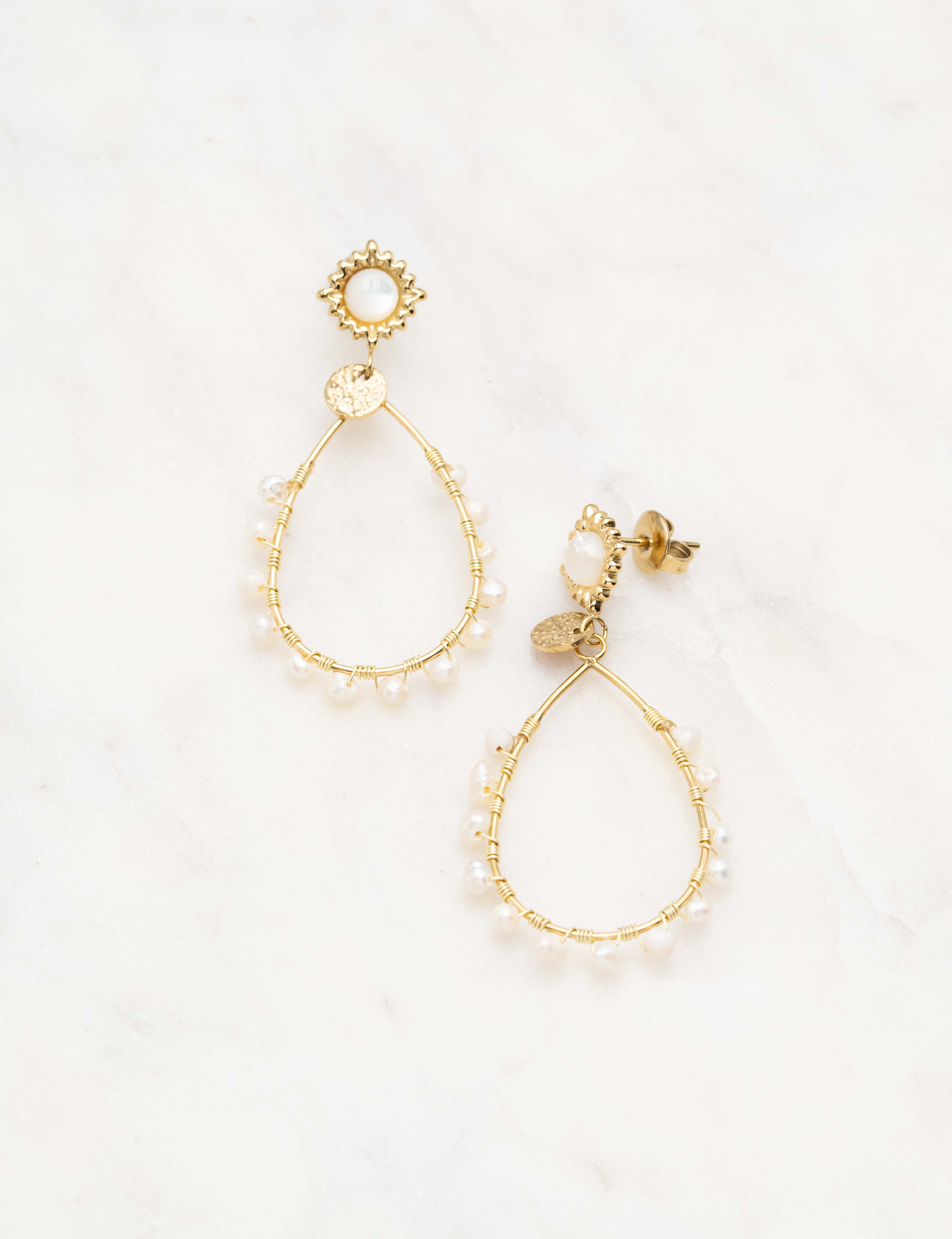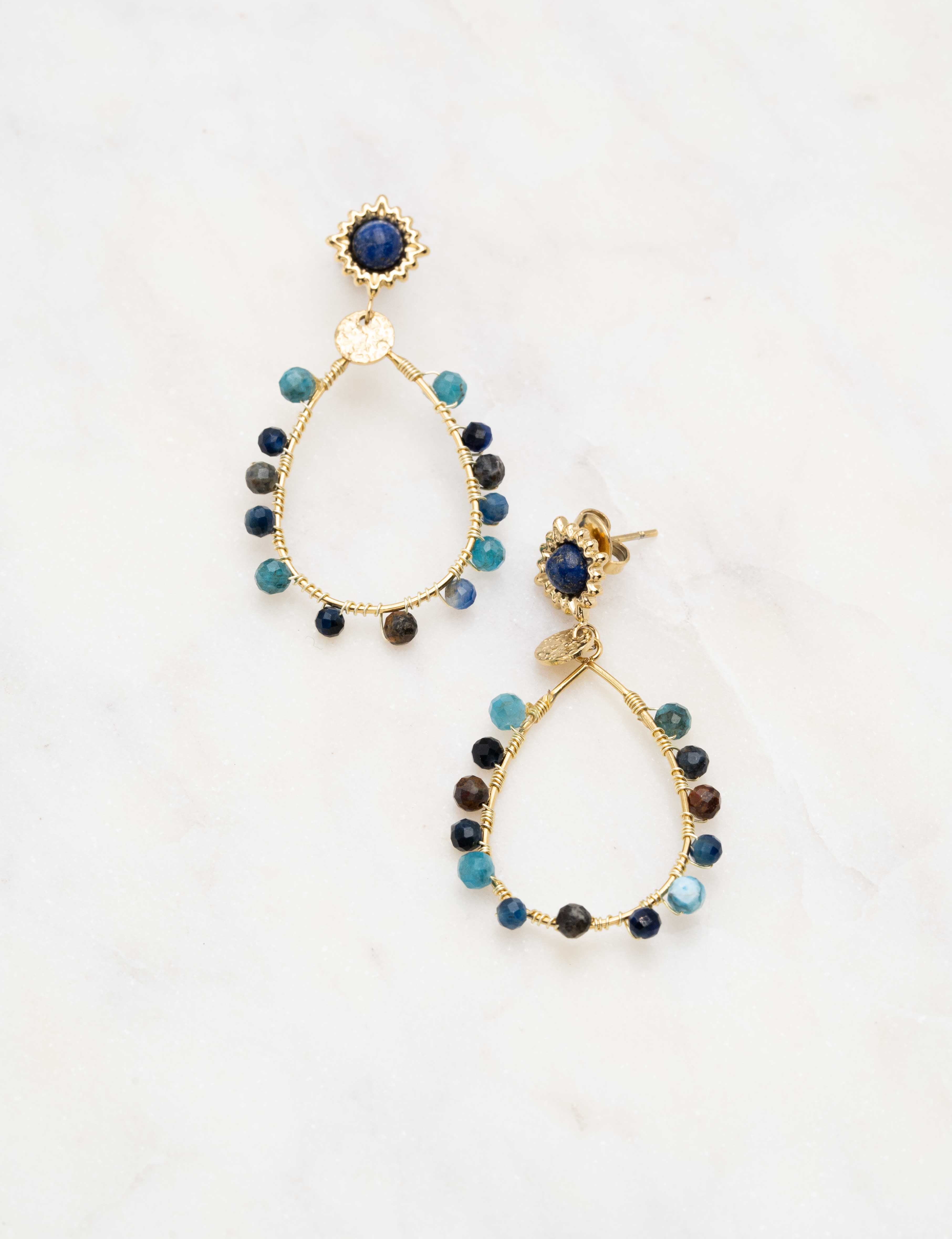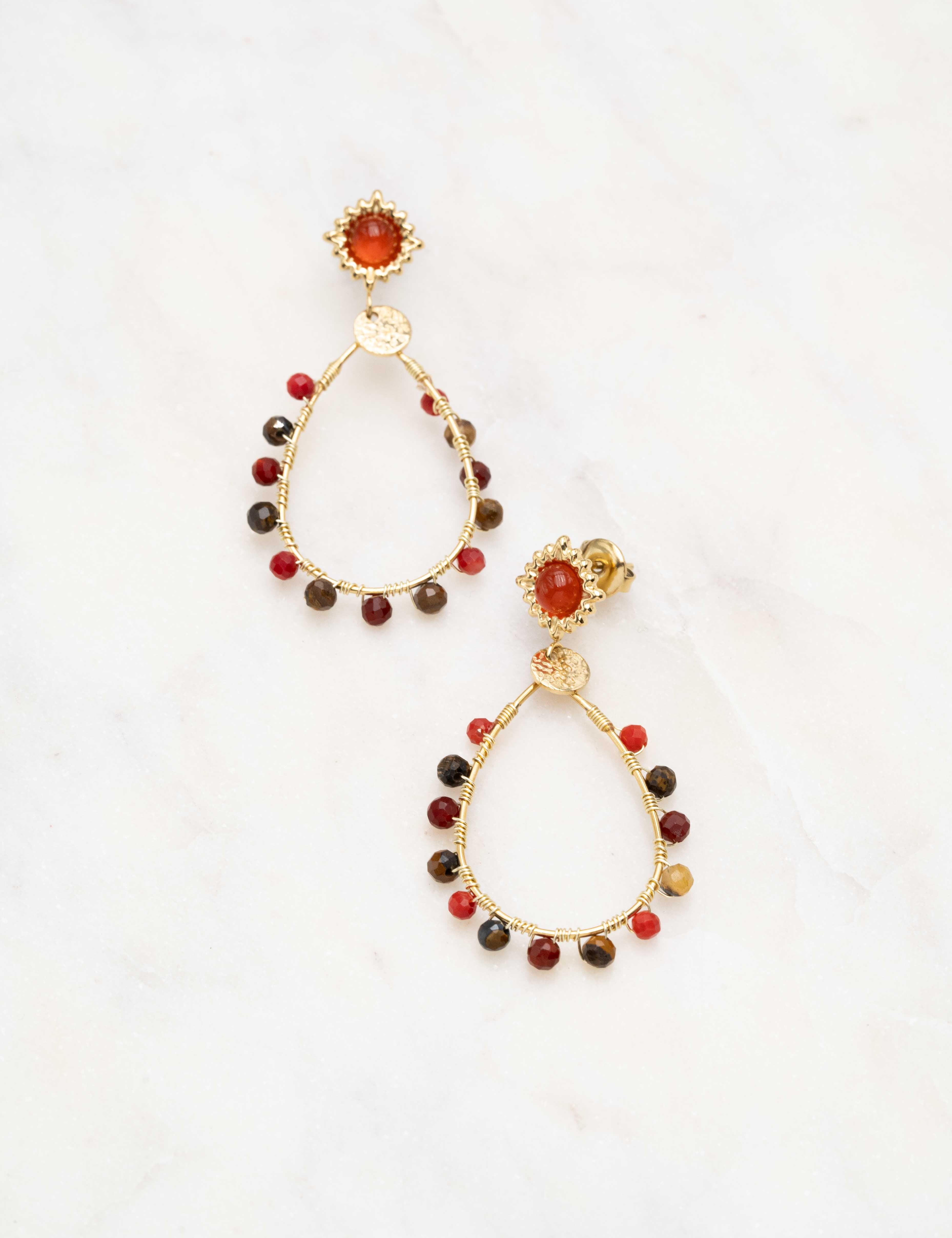 Boucles d'oreilles à puce composées d'un anneau oval orné de perles en pierres naturelles.