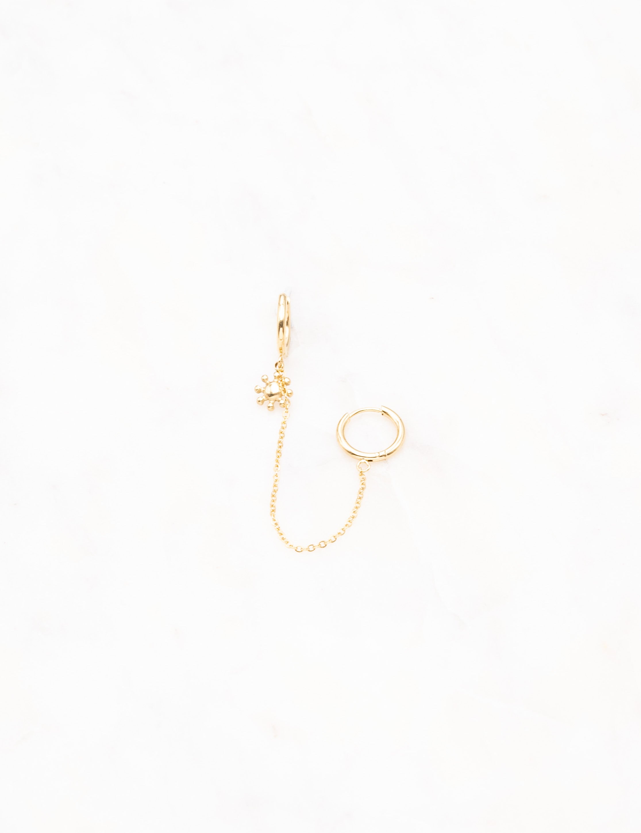 Mono boucle d'oreille type créoles composées d'une chaîne et d'une petite pampille au motif solaire.