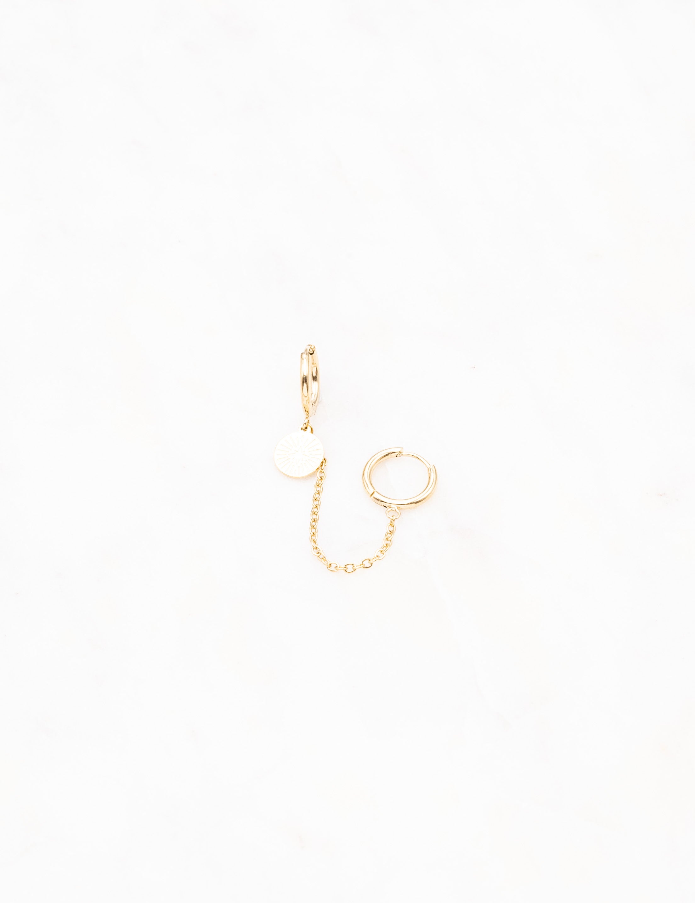 Mono boucle d'oreille type créoles composées d'une chaîne et d'une pampille ronde avec un motif étoilé.