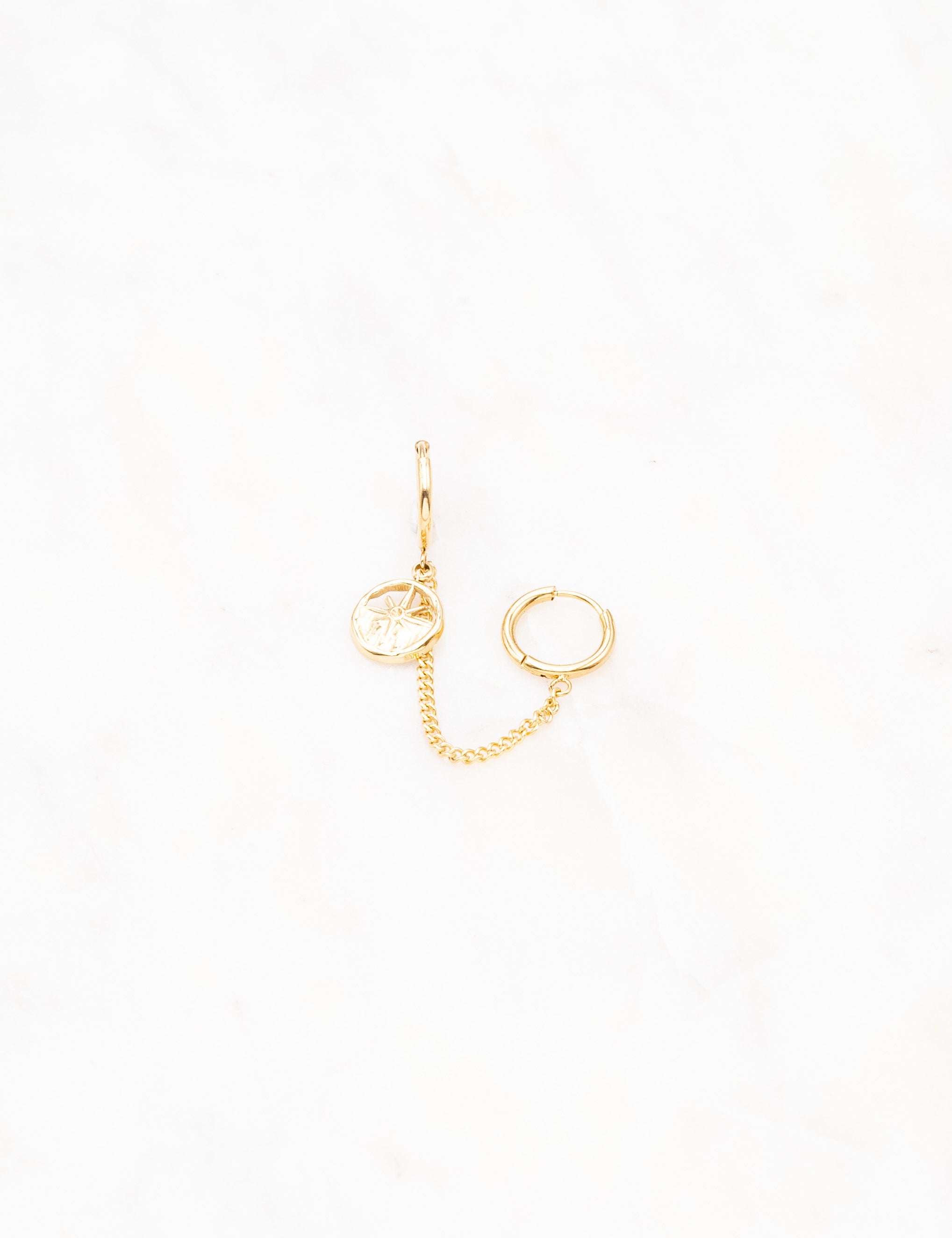 Mono boucle d'oreille type créoles composées d'une chaîne et d'une pampille ronde ajourée et motif étoilé.
