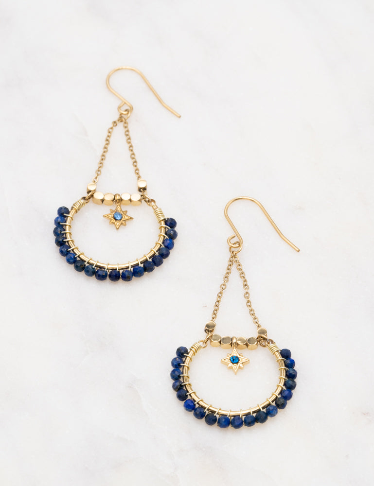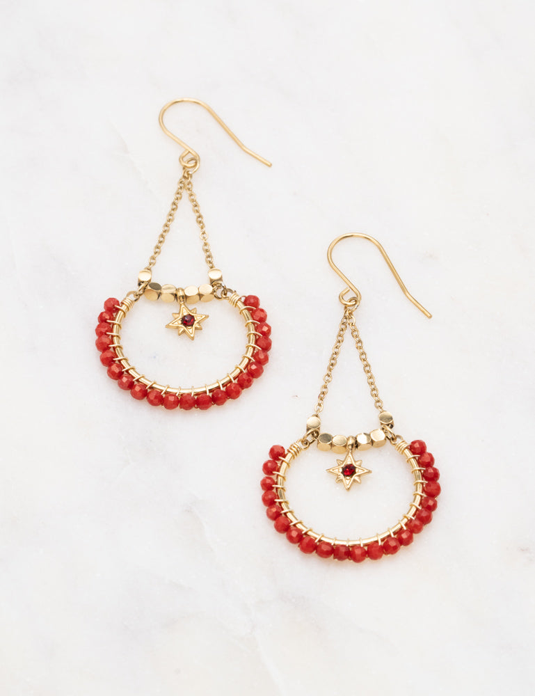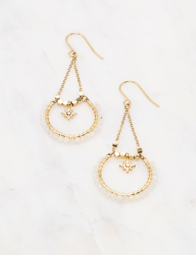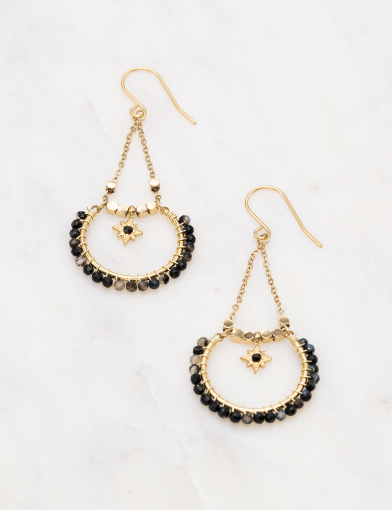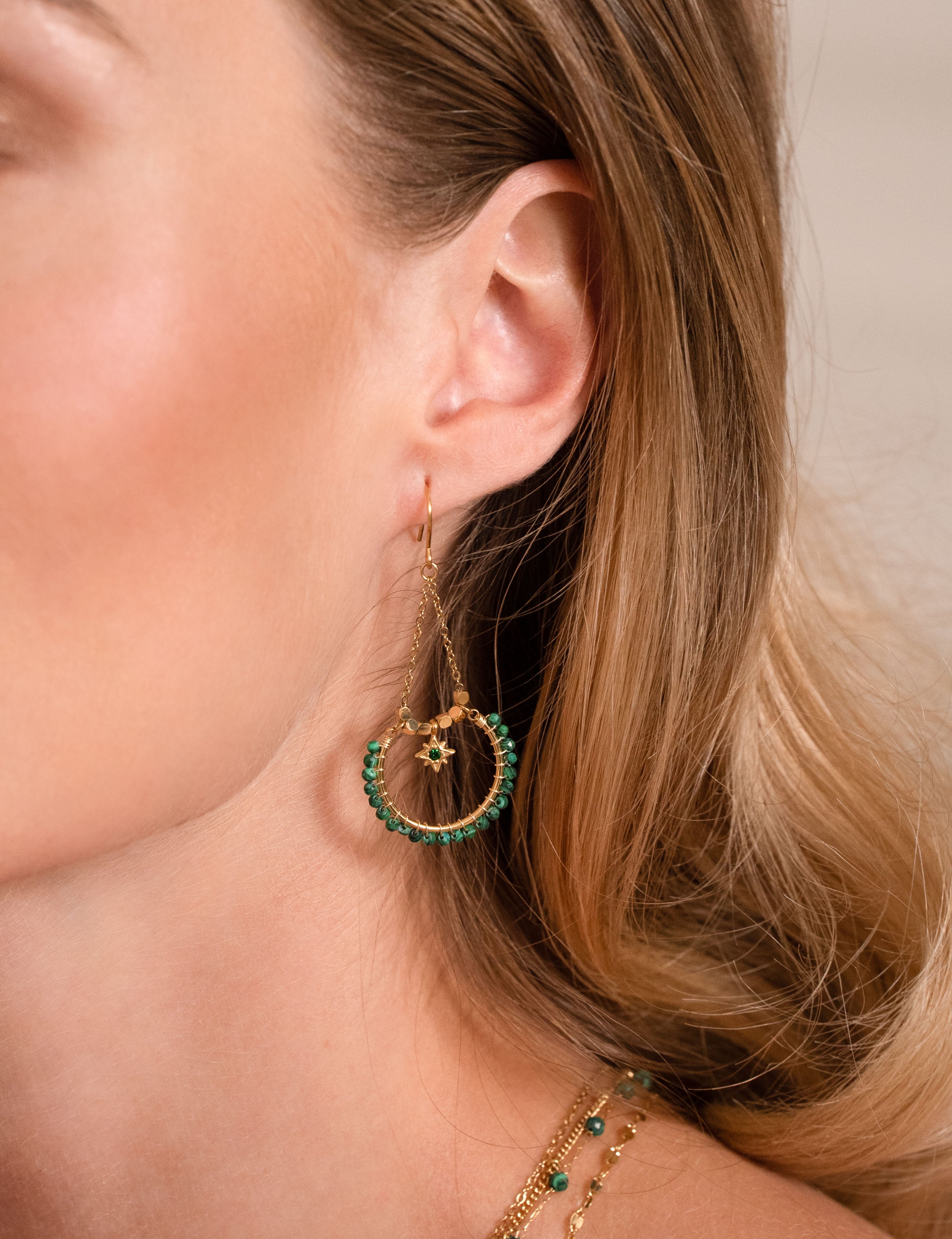 Boucles d'oreilles à crochet composées de perles en pierres naturelles et d'une pampille avec une étoile ornée de strass.