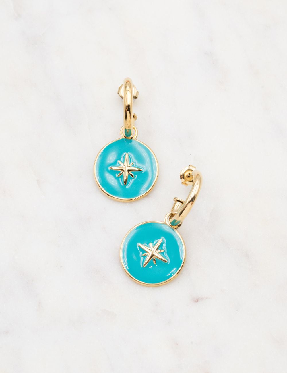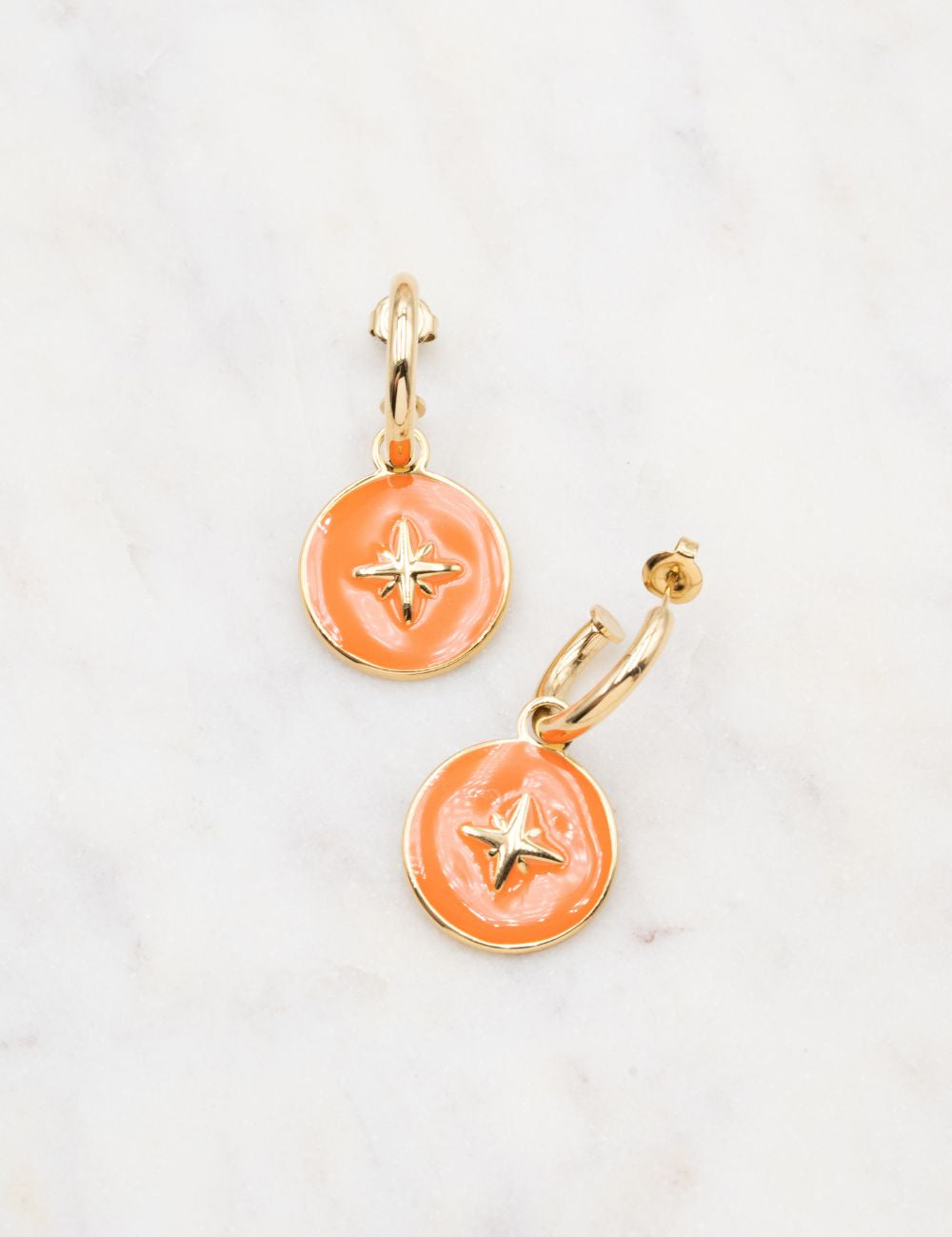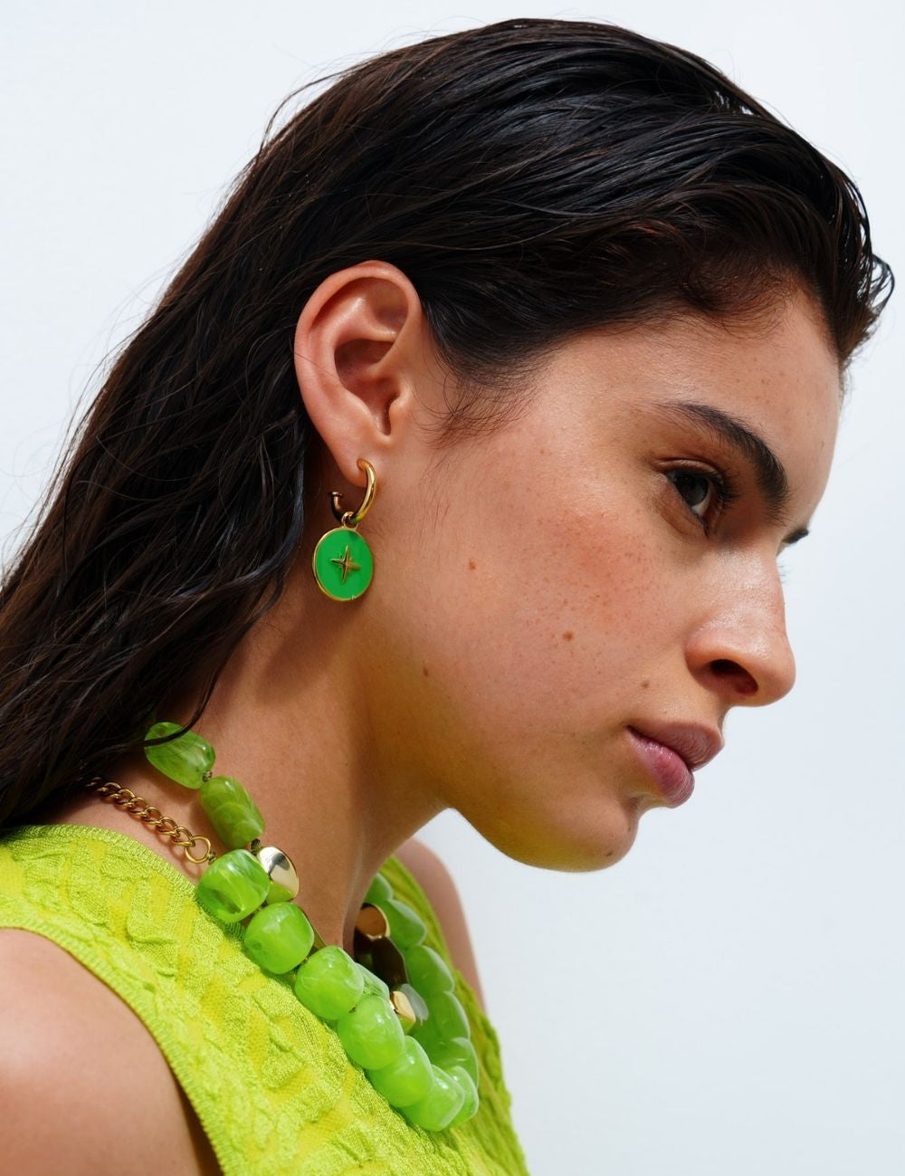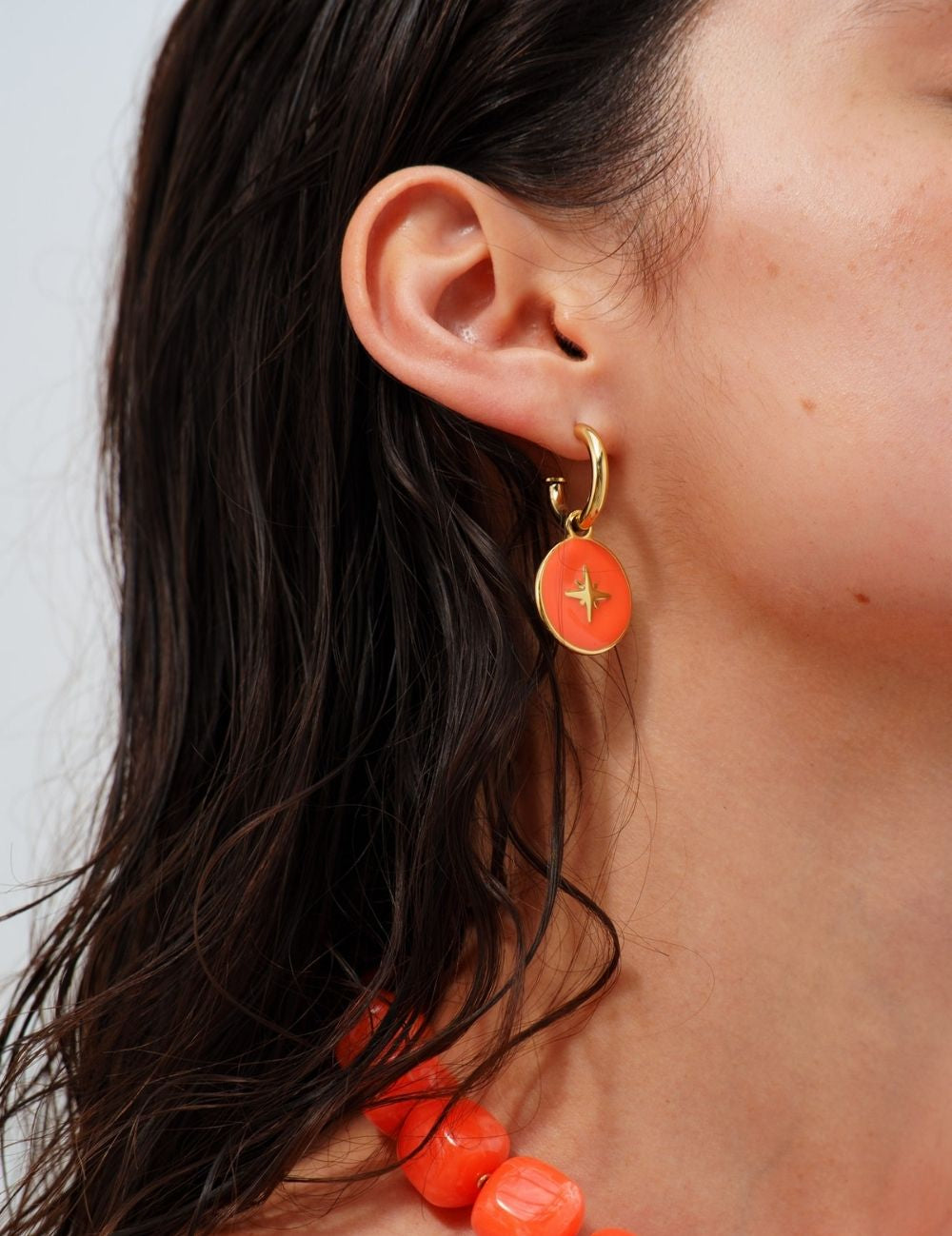 Boucles d'oreilles graphiques type créoles à puce composées d'un pendentif rond émaillé coloré serti d'une étoile.